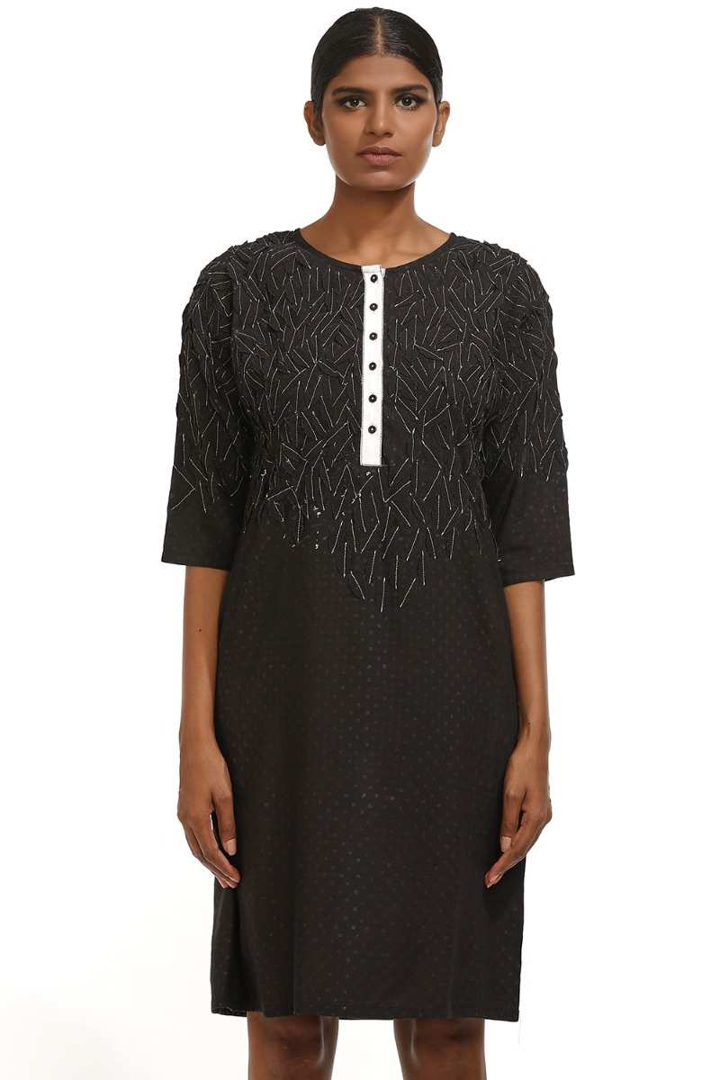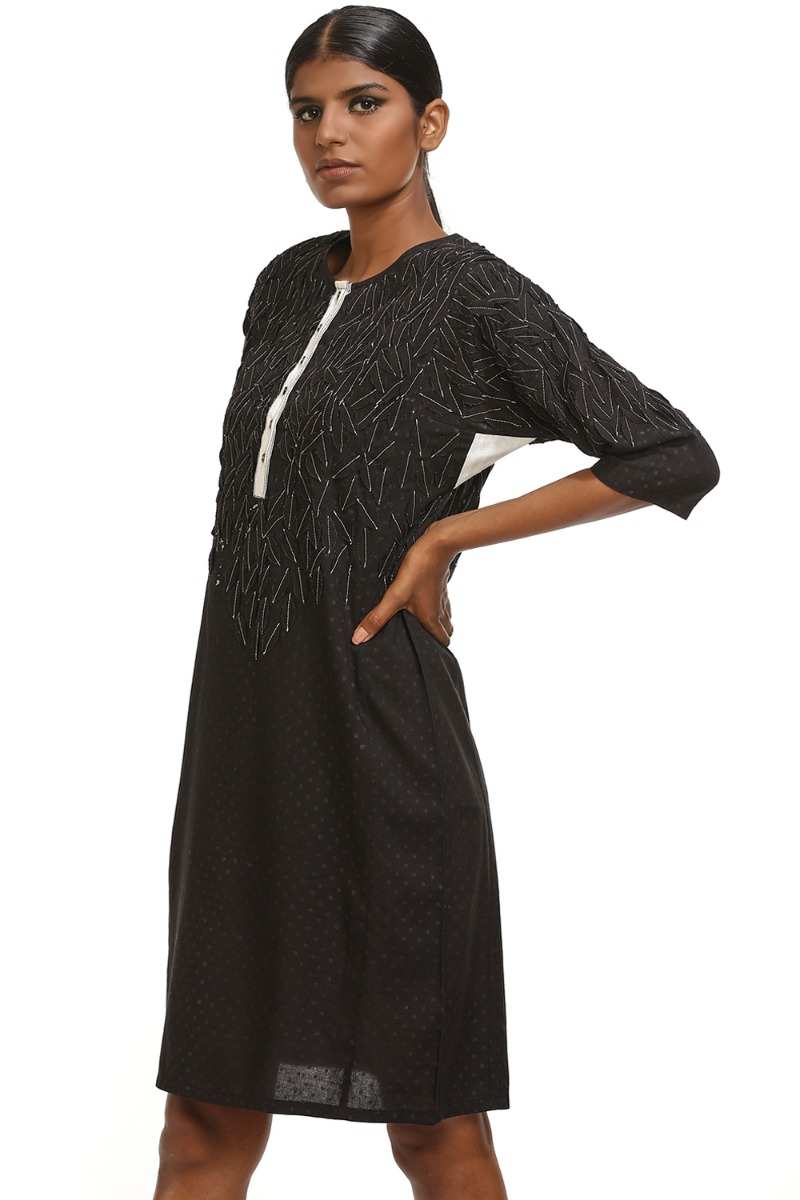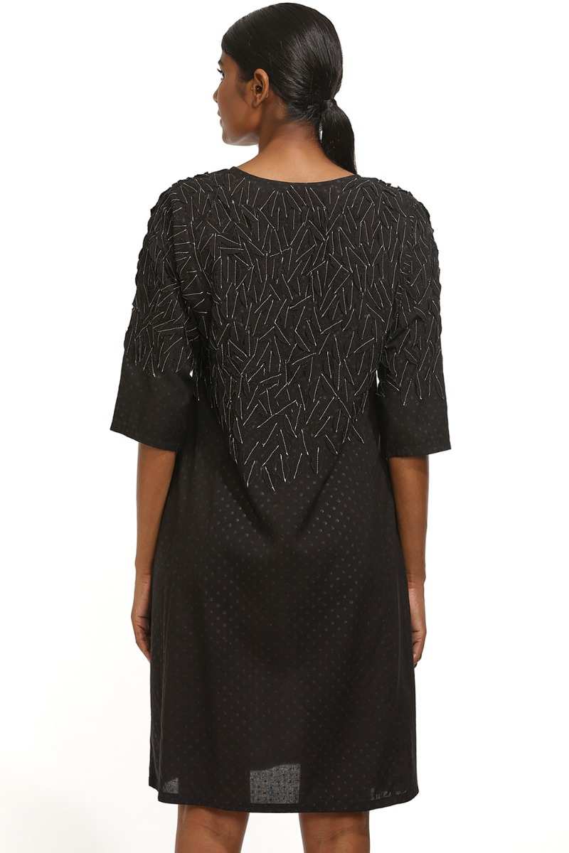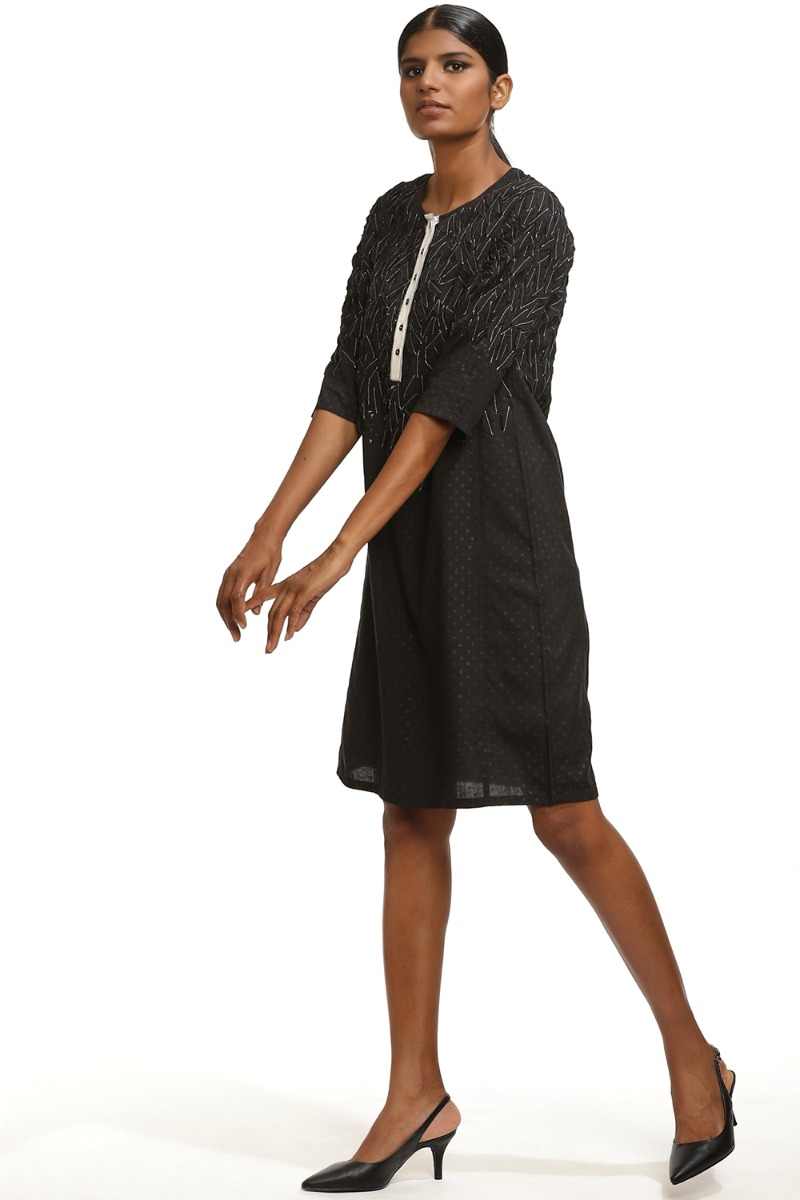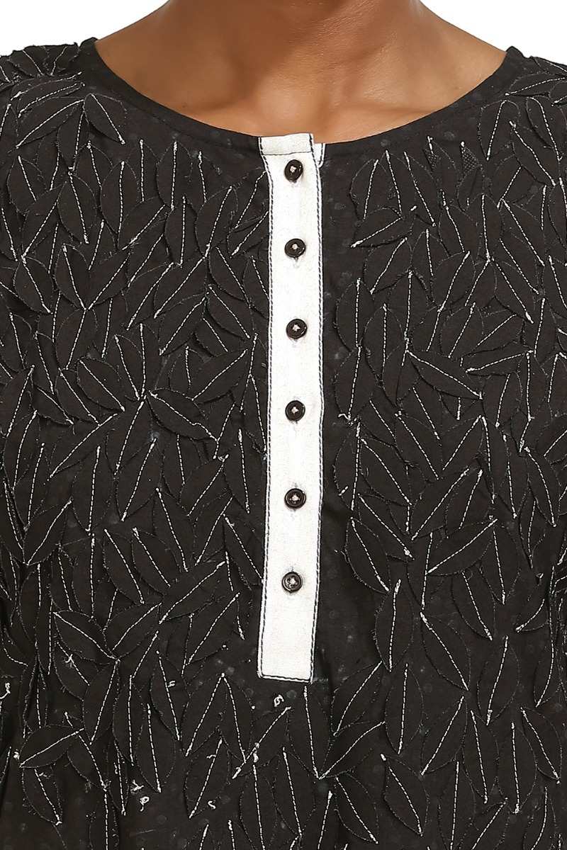 Black Sustainable Viscose With Block Print Dots And Appliqued 3D Leaves.