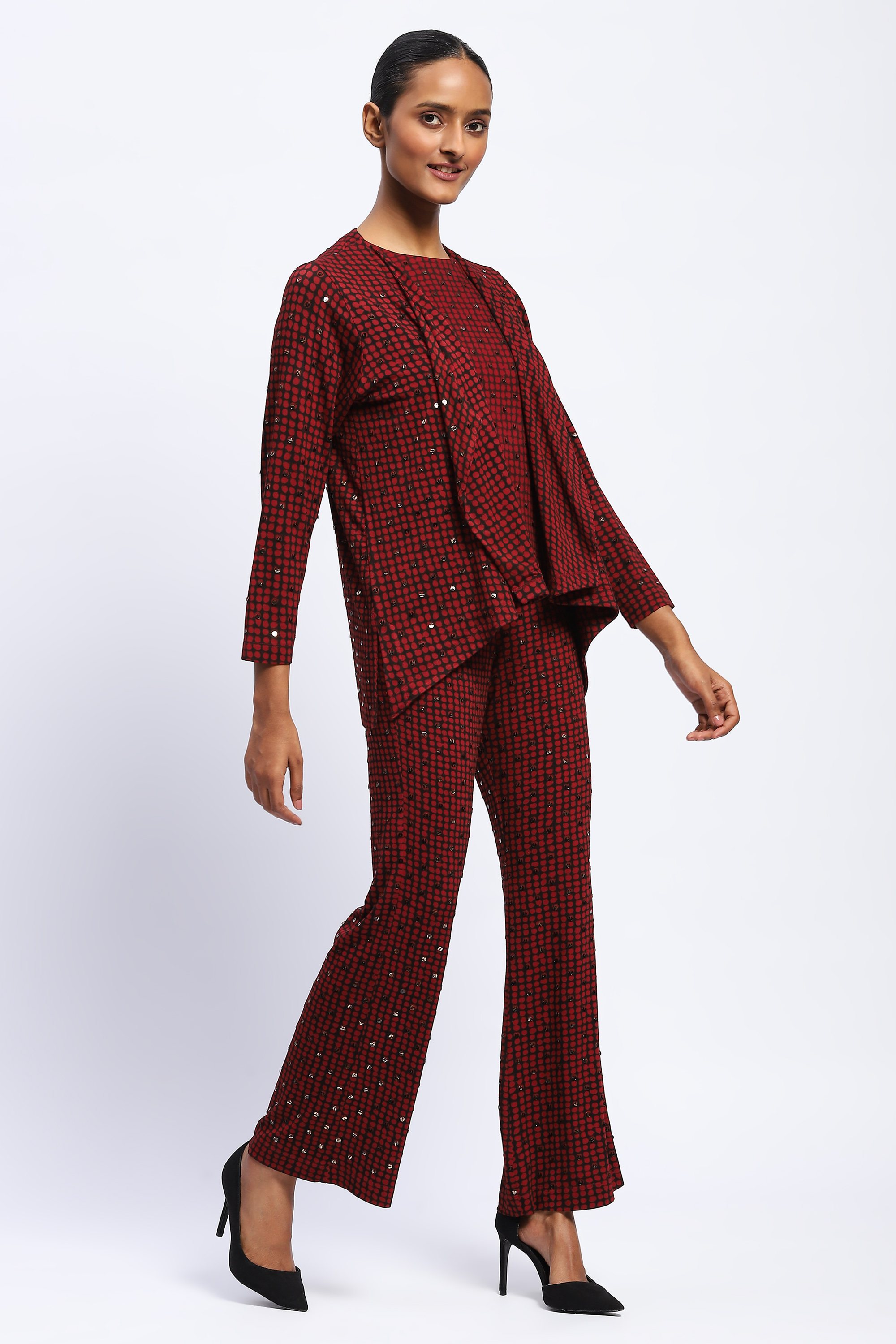 This piece has been made using 100% viscose lycra knit with an all over dot print and stone embellishment.