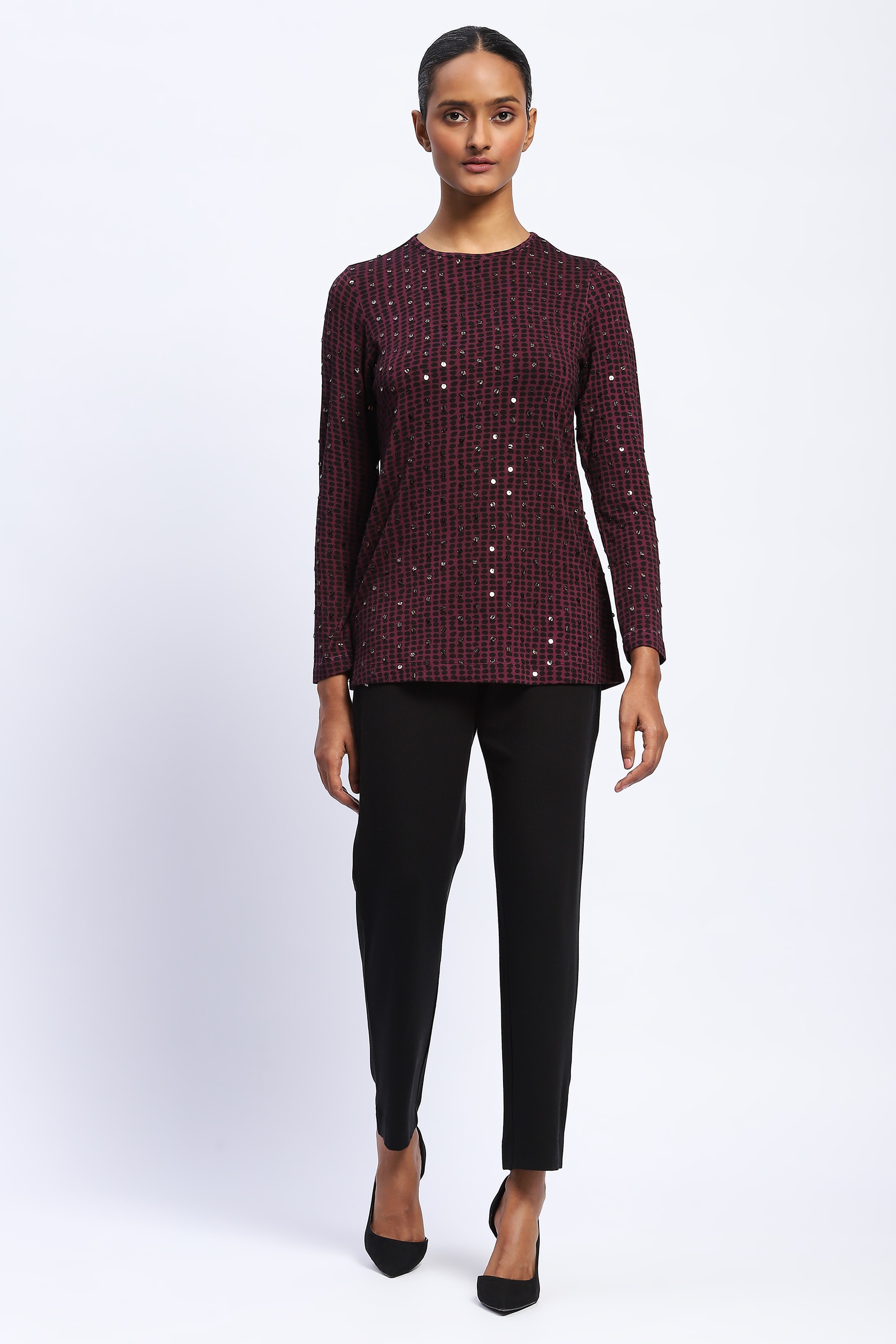 This piece has been made using 100% viscose lycra knit with an all over dot print and stone embellishment.