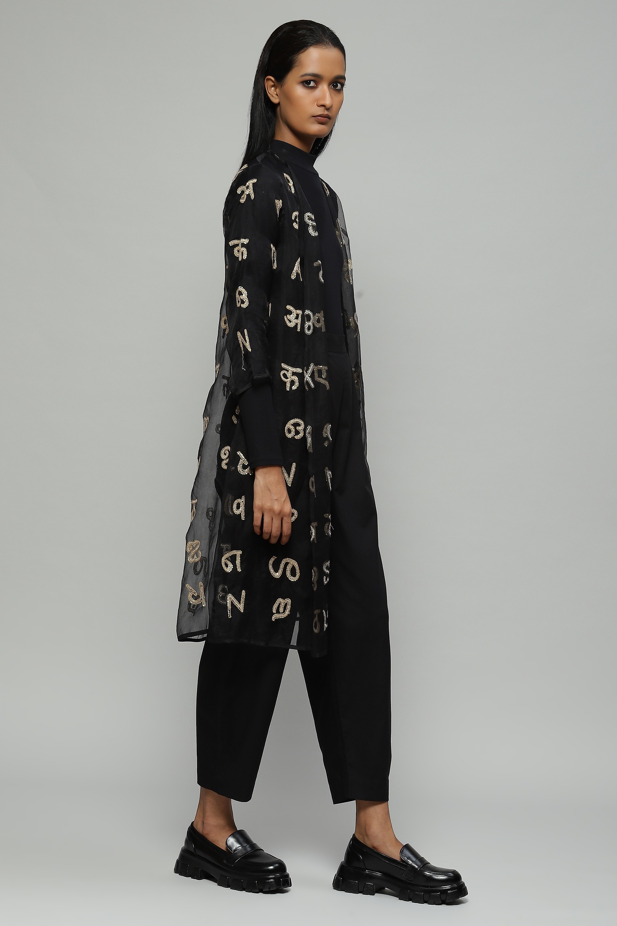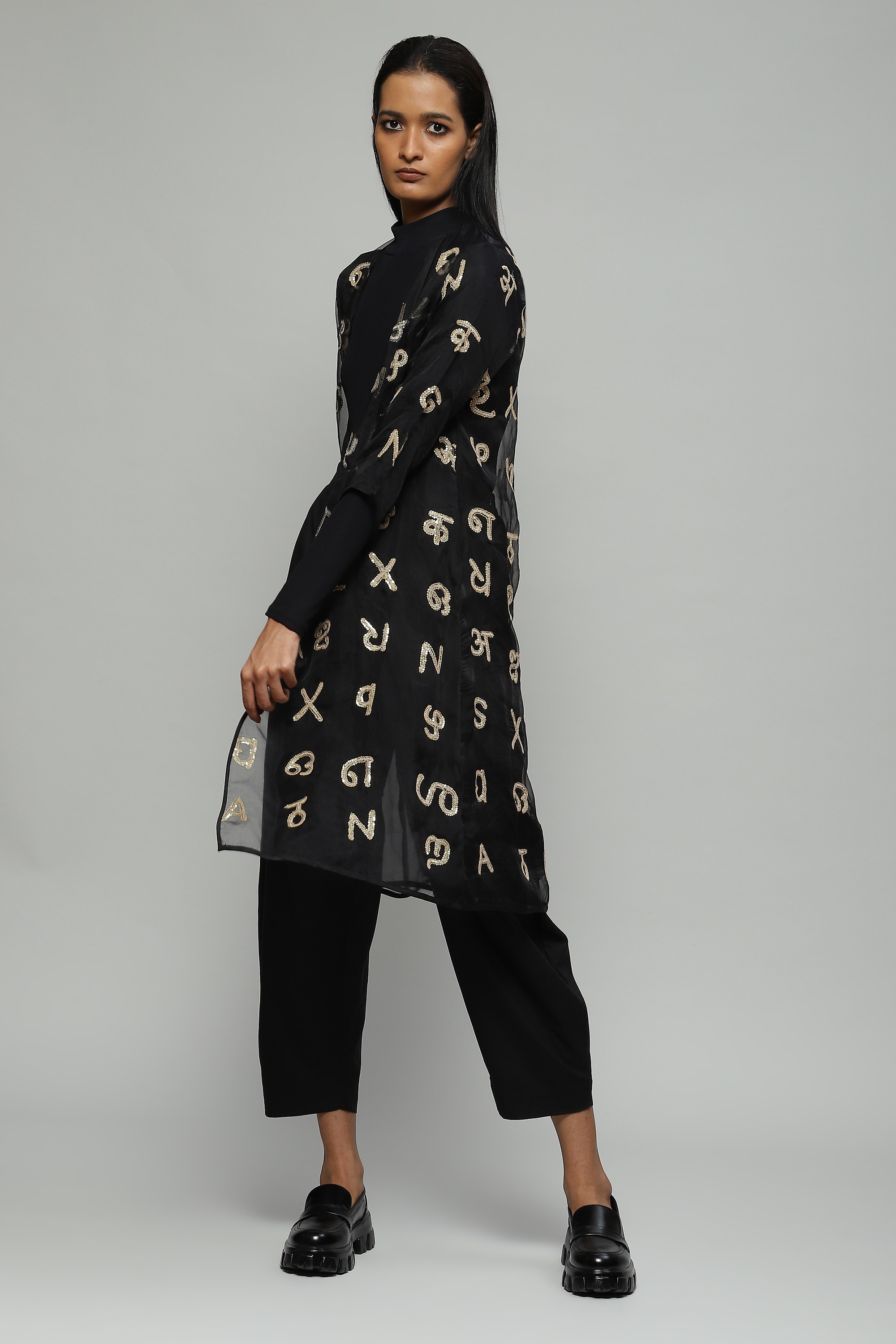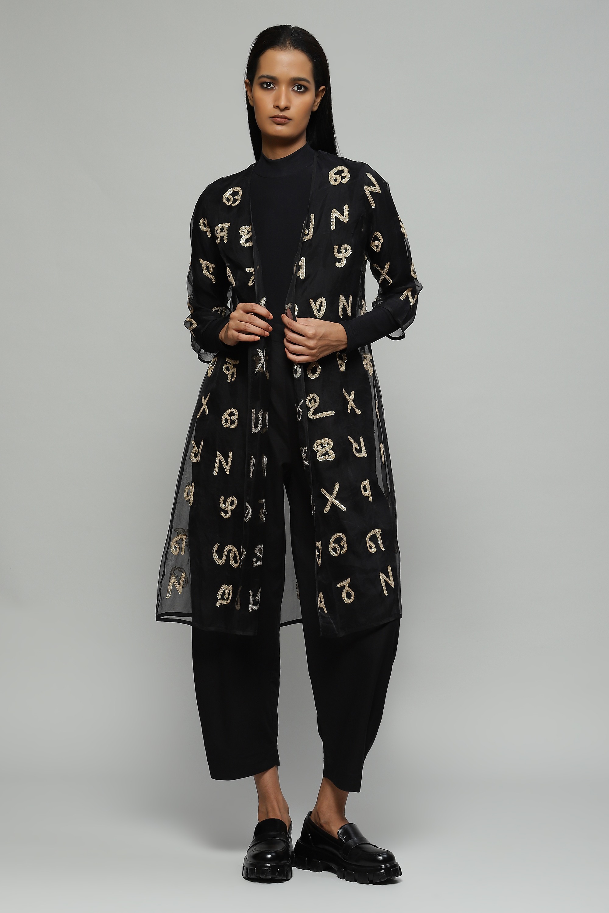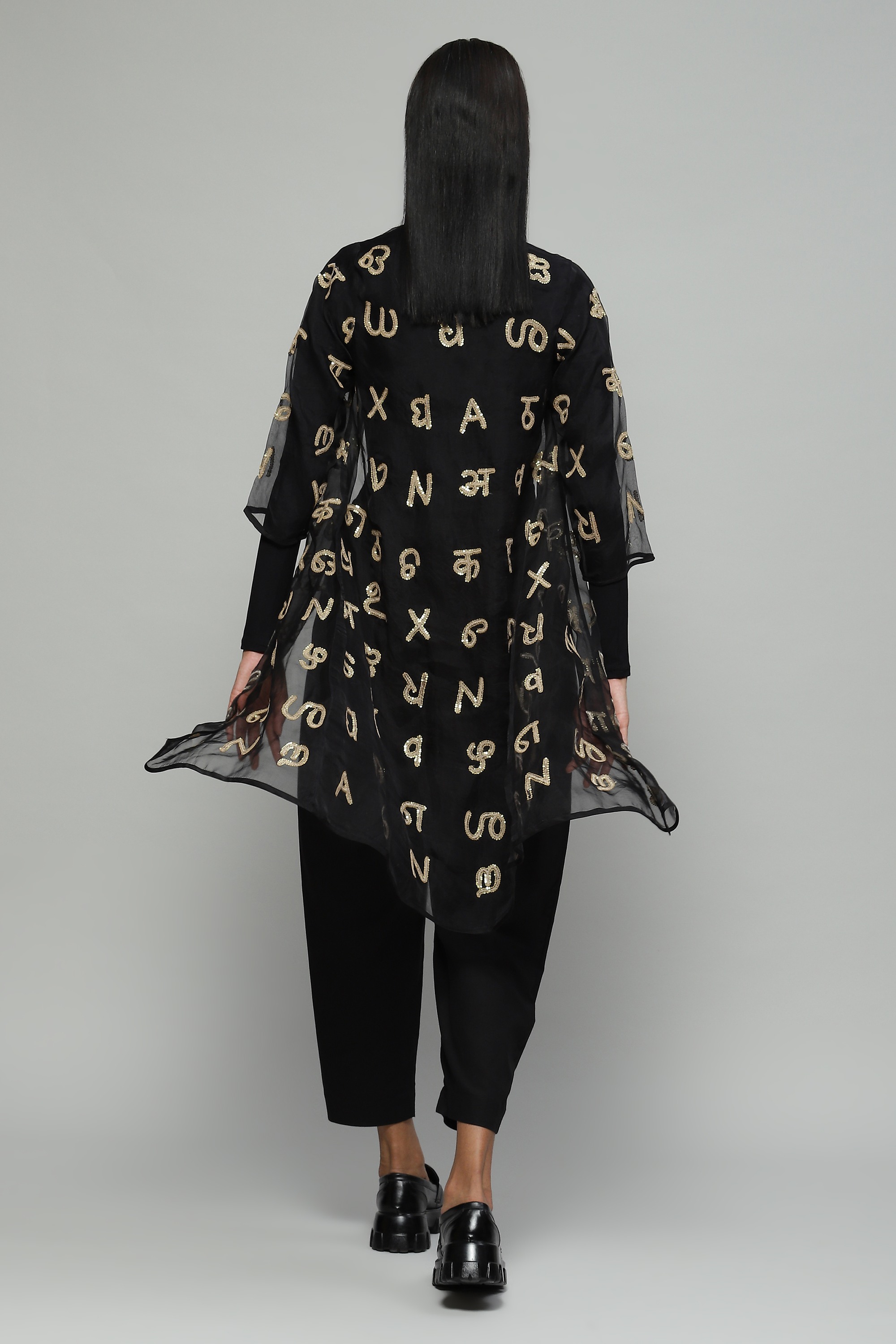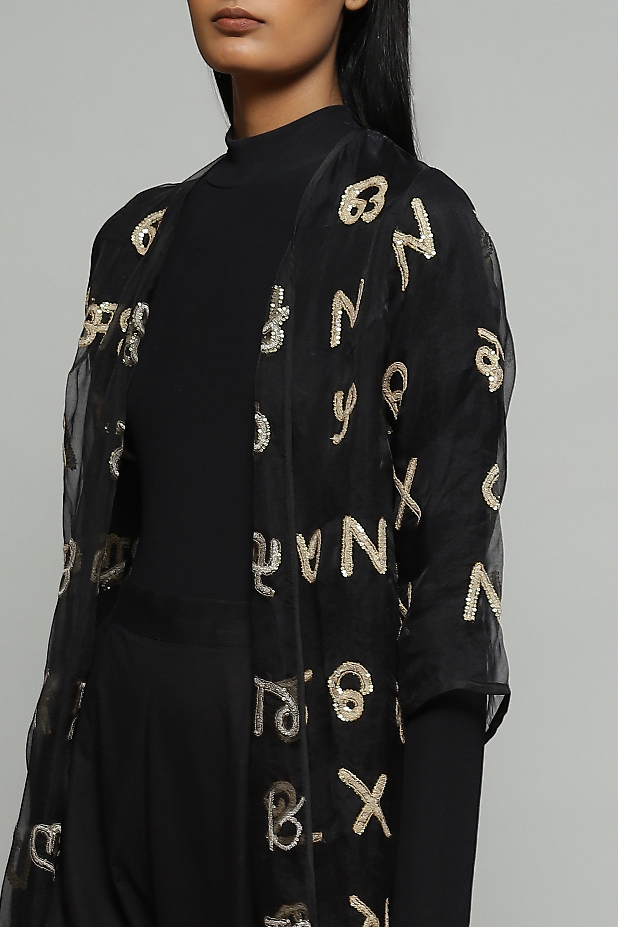 A black silk organza jacket hand-embroidered with allover alphabetical motifs and sequins using tussar yarn