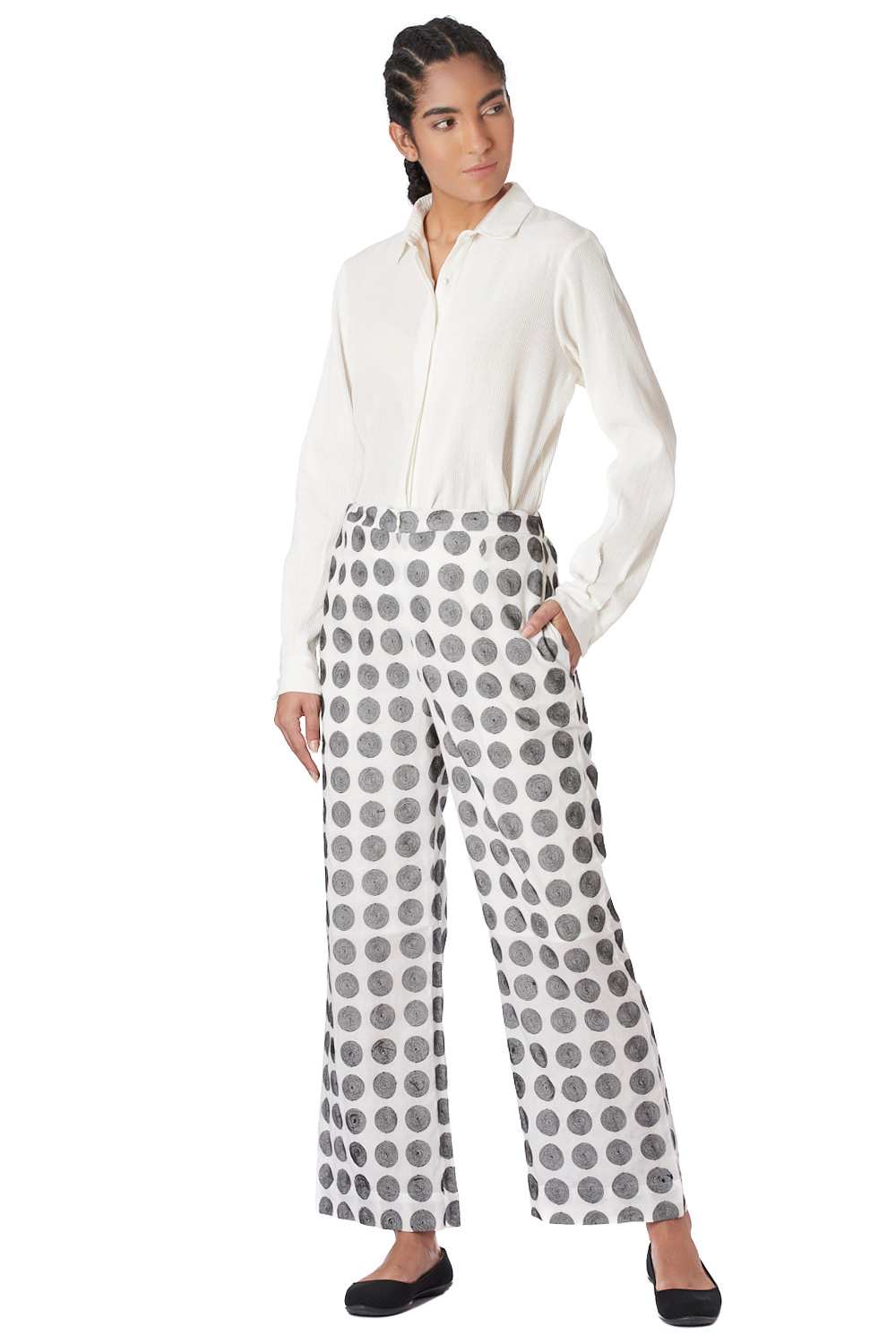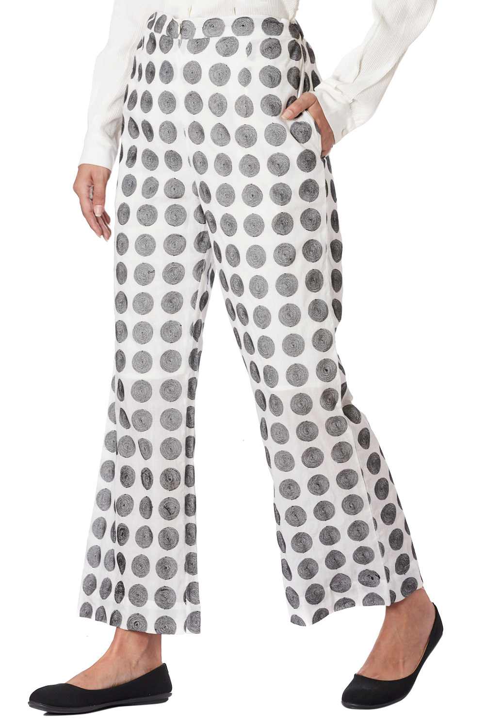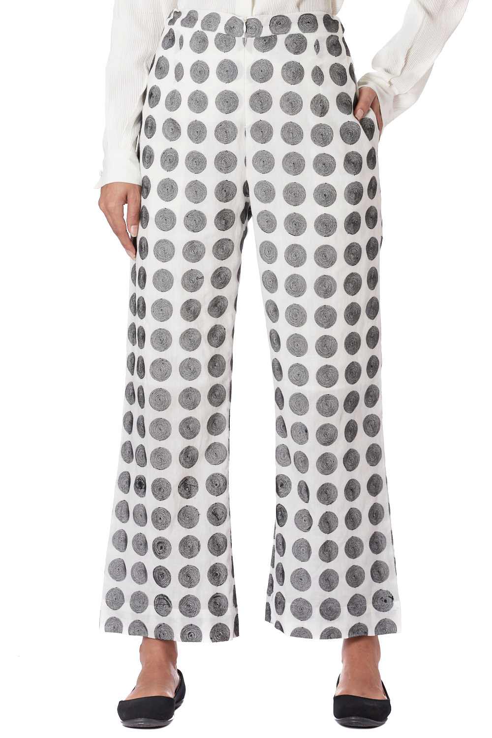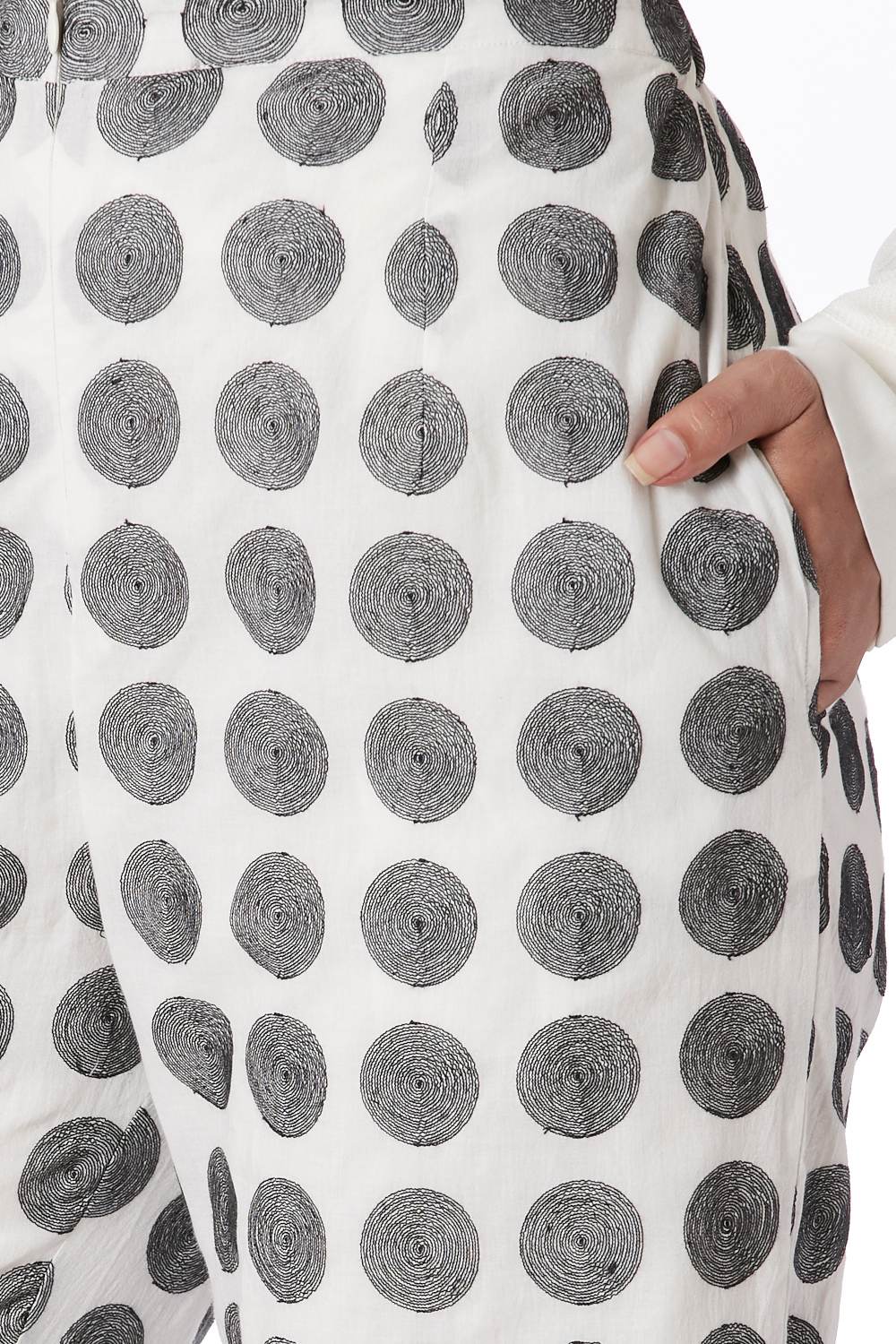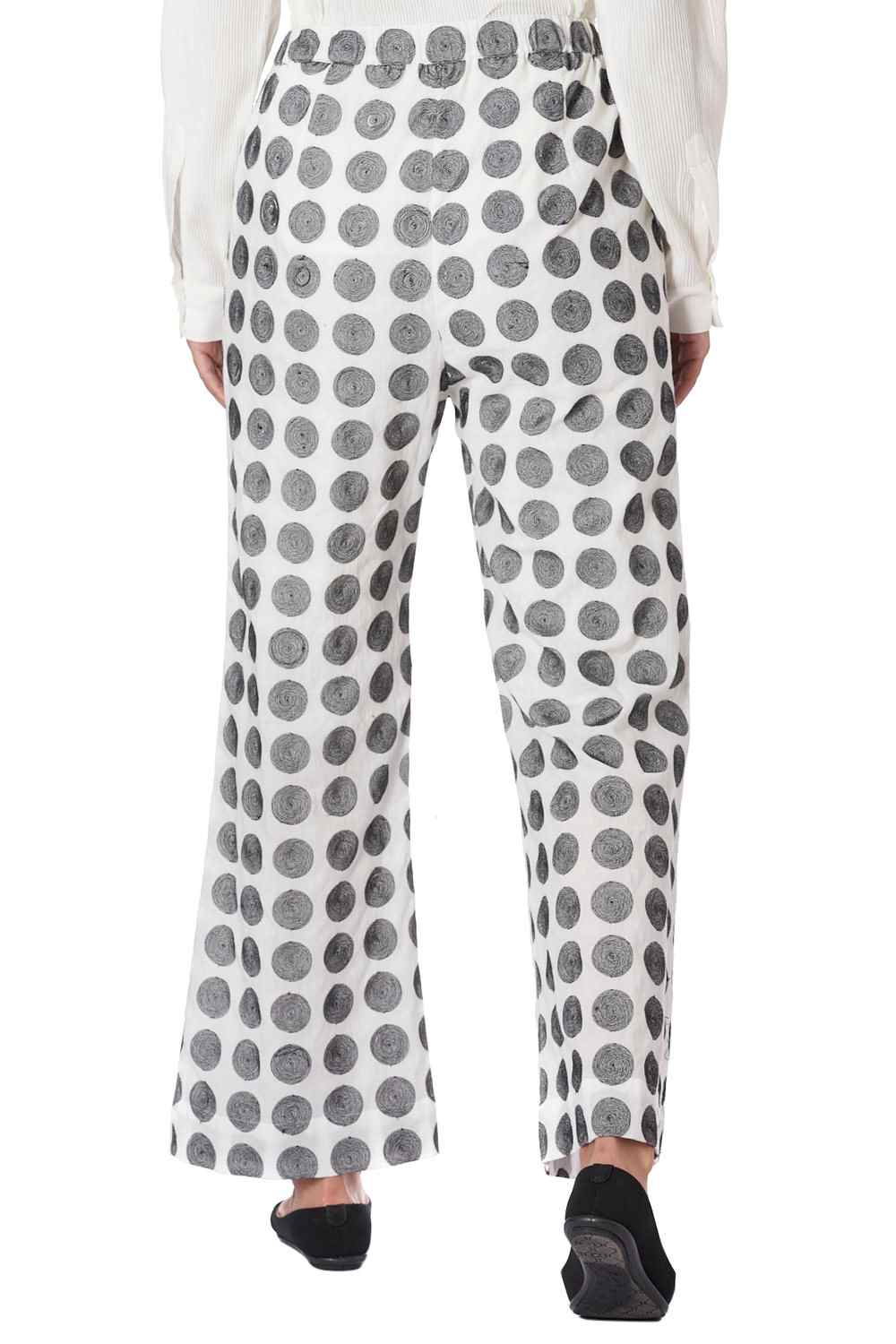 Straight Pants. Features All Over Embroidered Dots. Adjustable Waistband, Lightly Elasticated At The Back, With Additional Concealed Drawstrings In The Front For A Perfect Fit