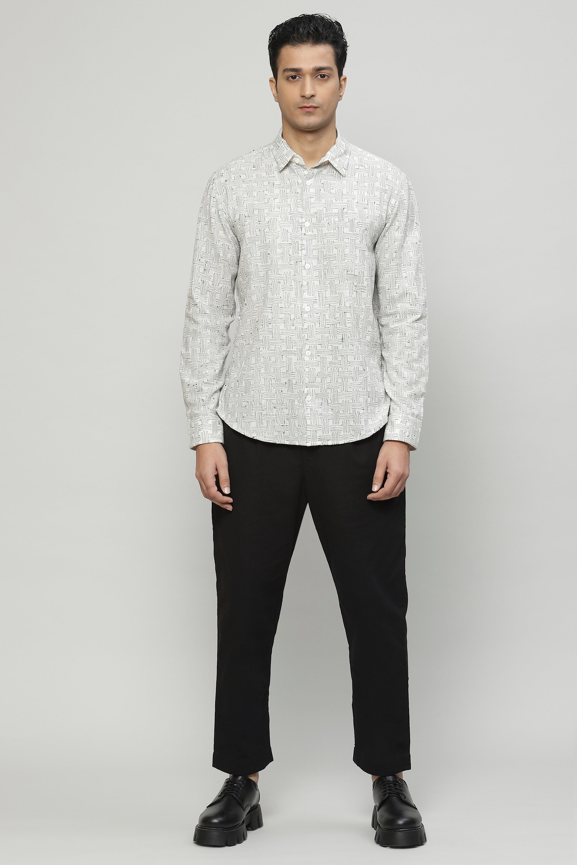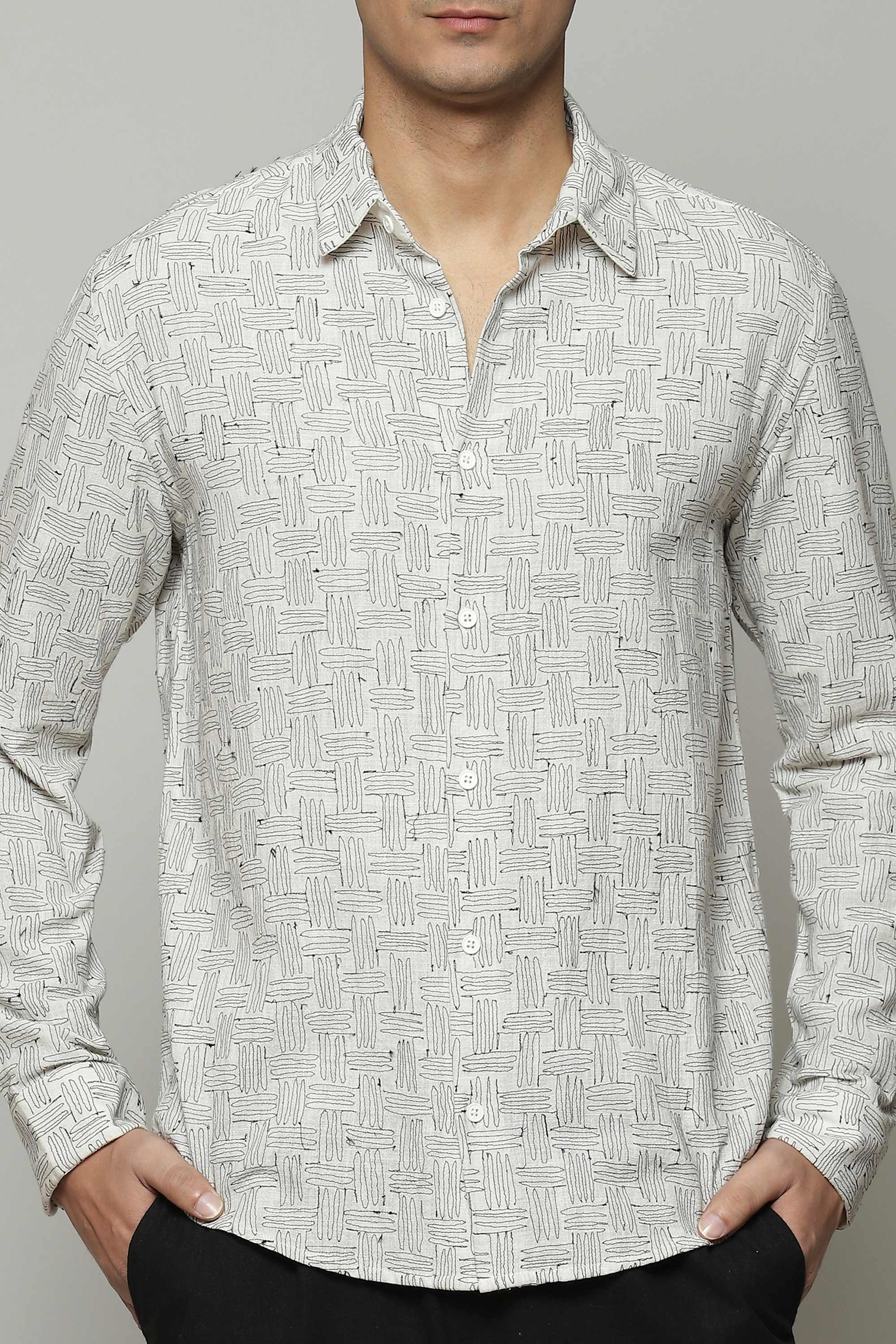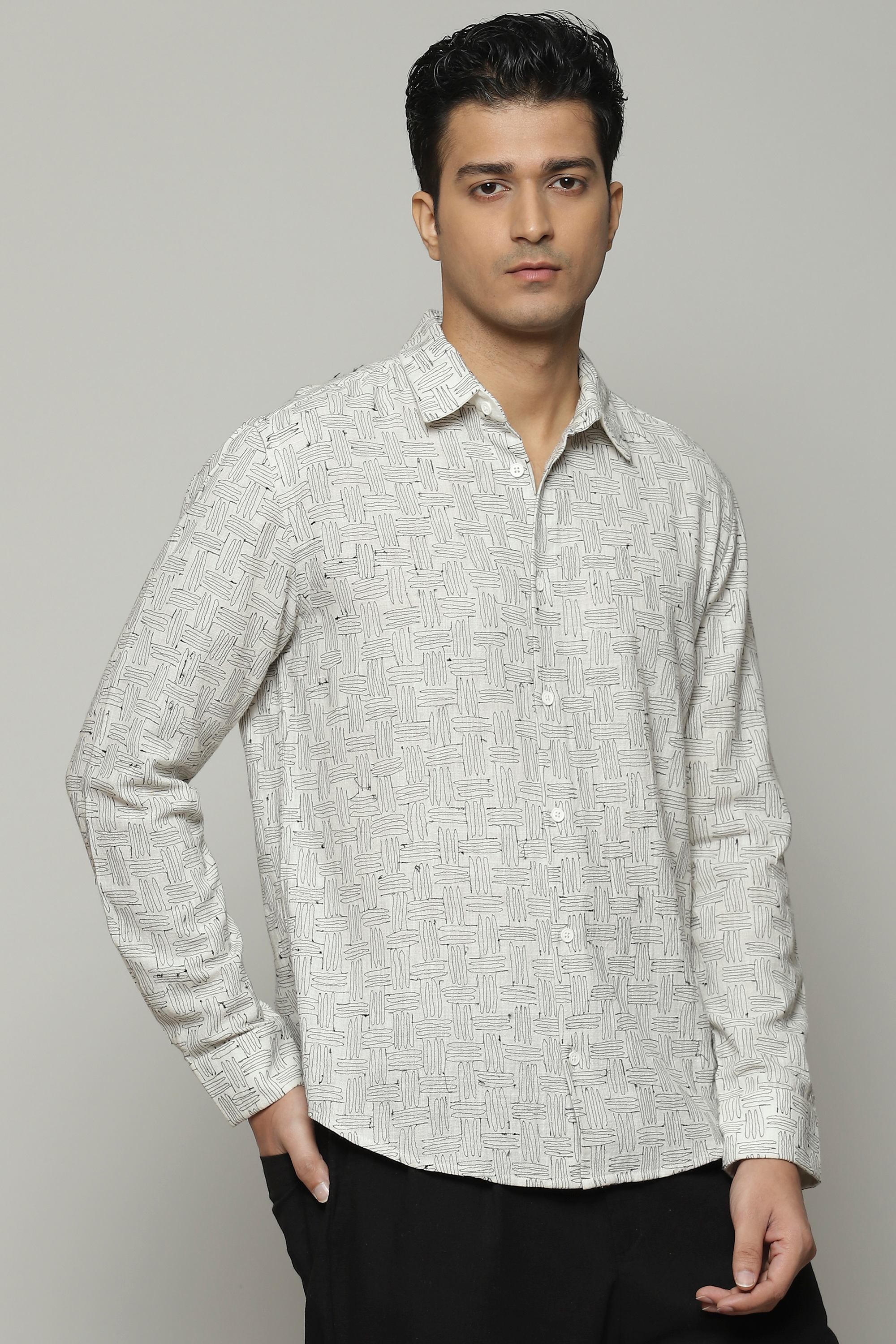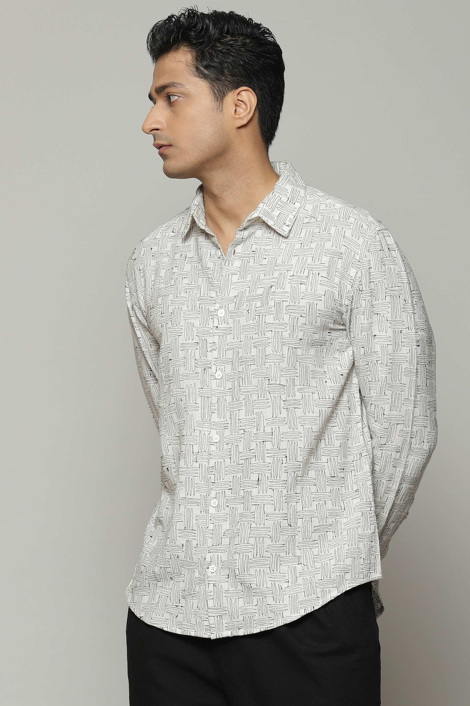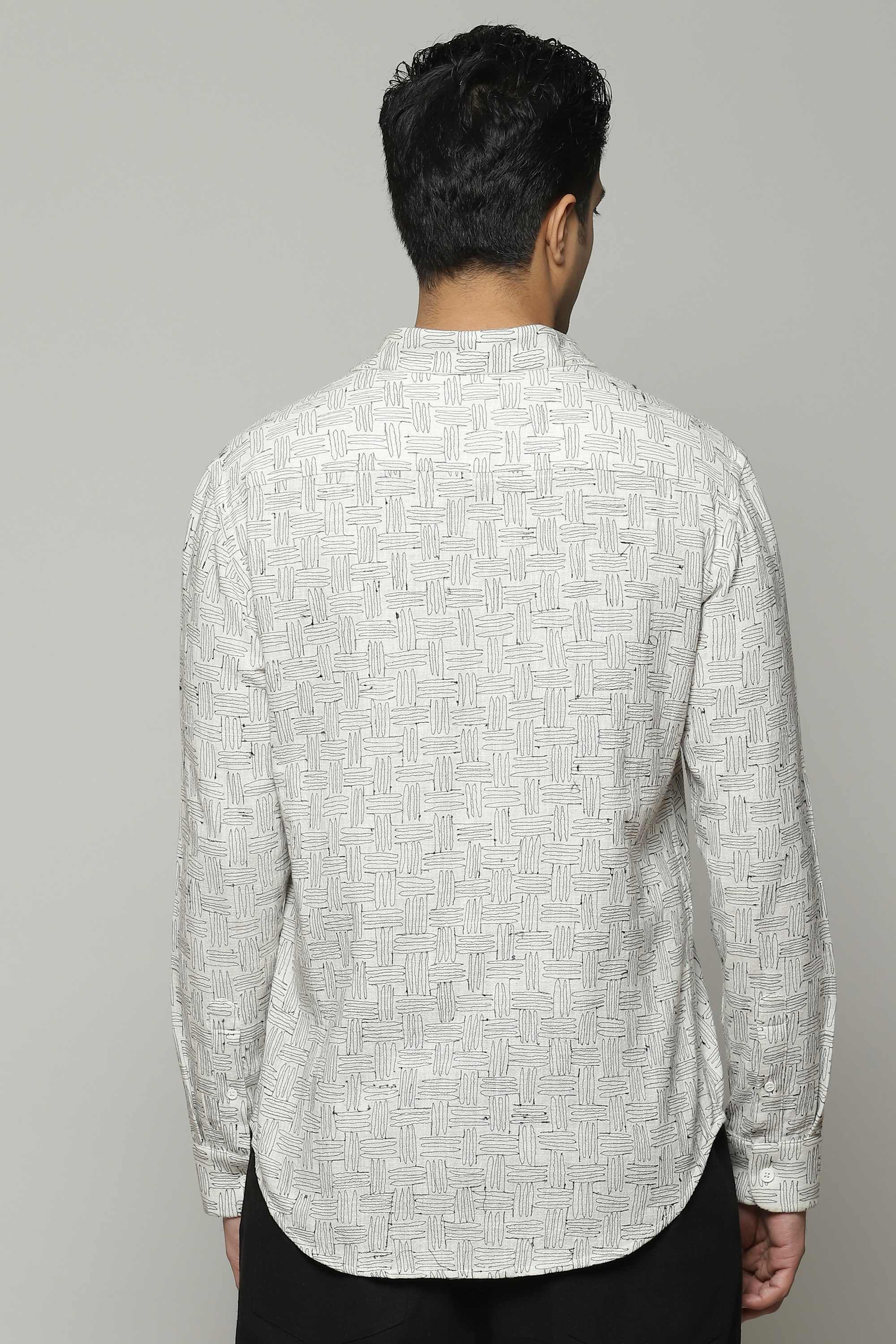 A 100% breathable, organic cotton shirt. The embroidery is inspired by a pattern that commonly appears on basket, as a weave. Ideal for a spring picnic by Mughal Gardens.