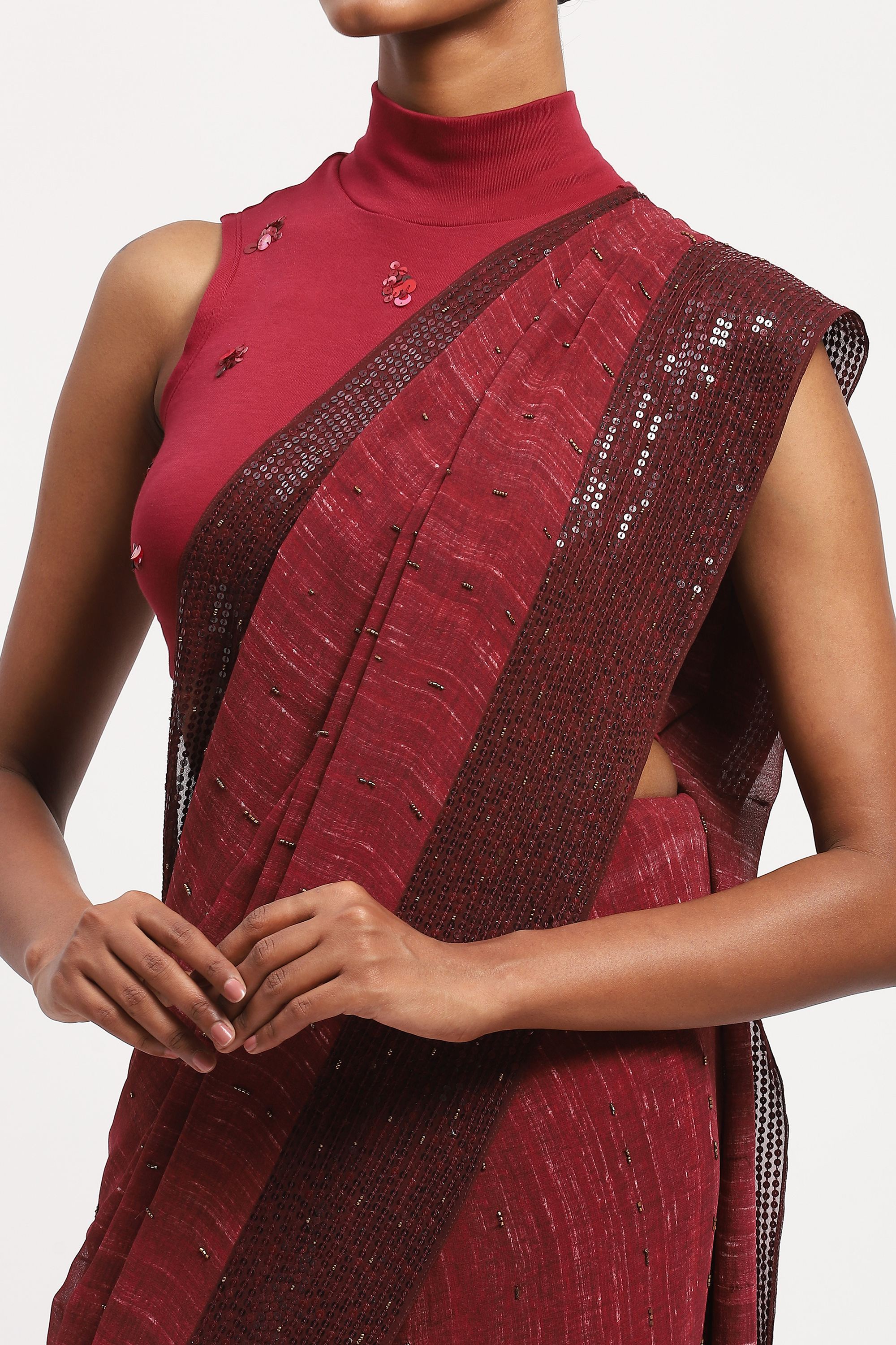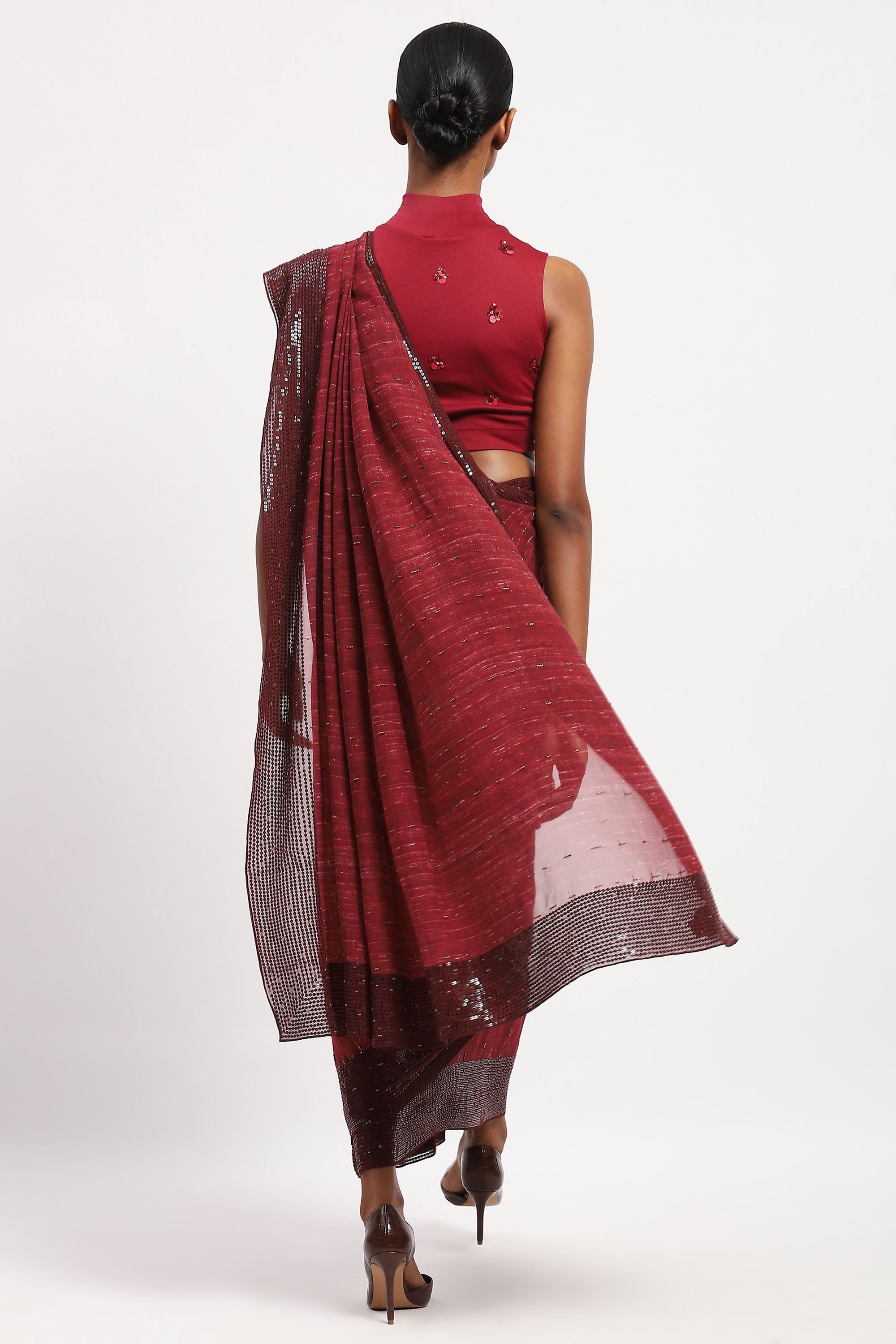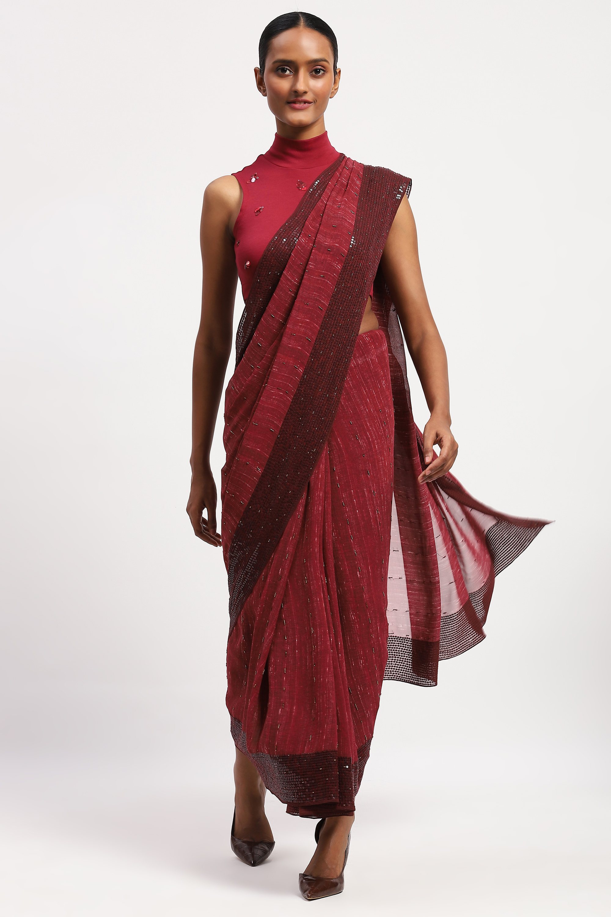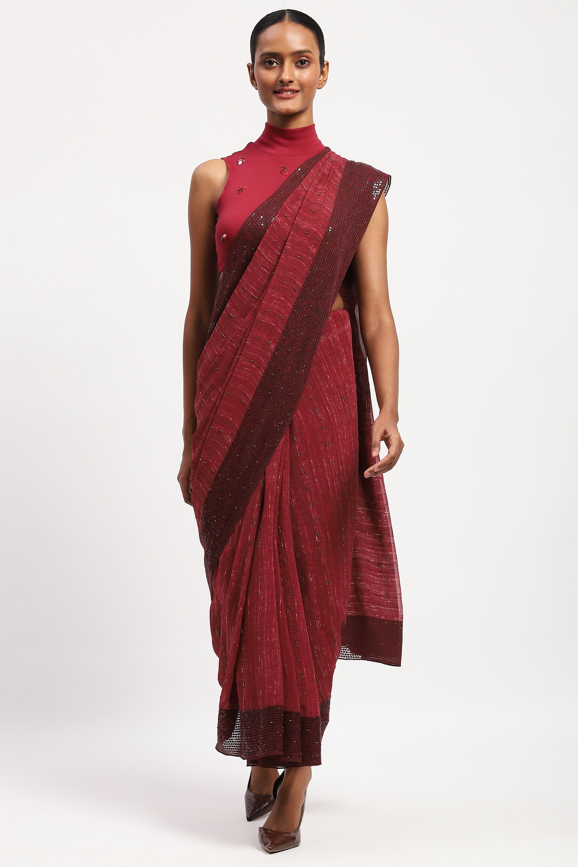 Ideal for exploring strange soundscapes, this burgundy saree is crafted in silk habutai. Its digitally printed pattern draws inspiration from crewel stitches to create celestial spectrograms.