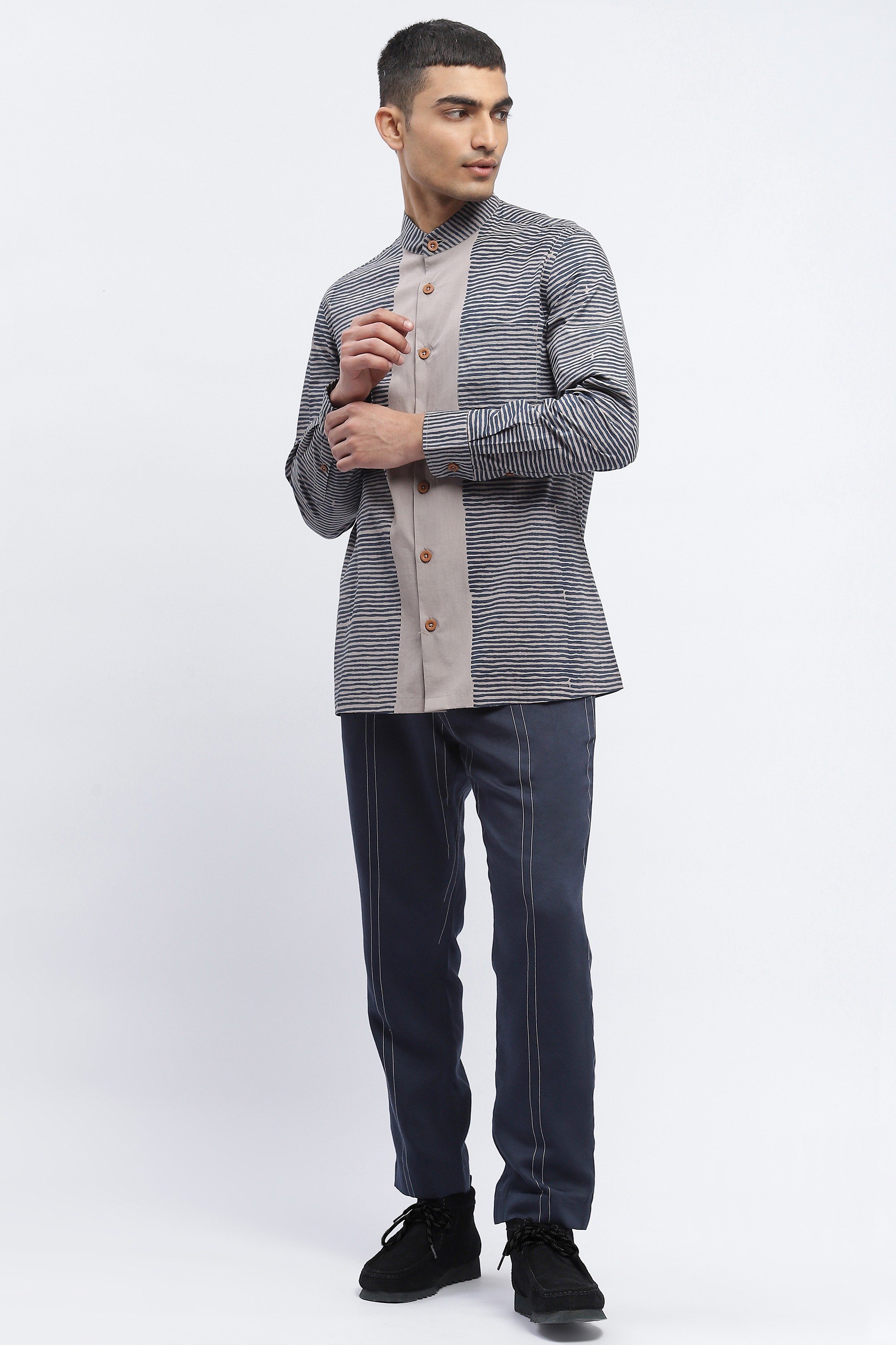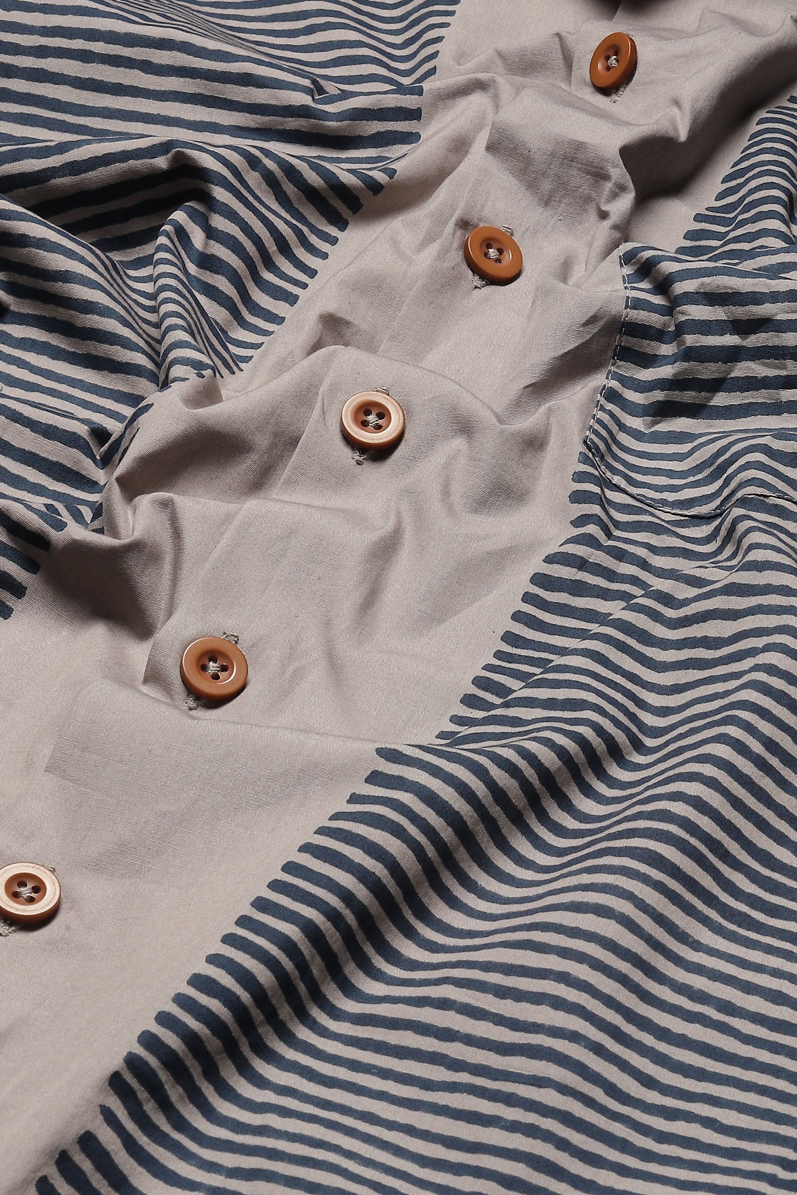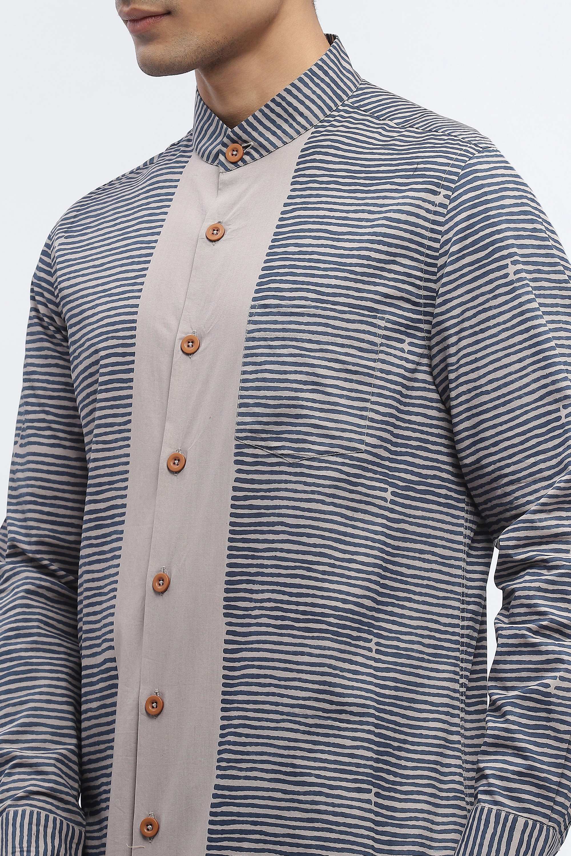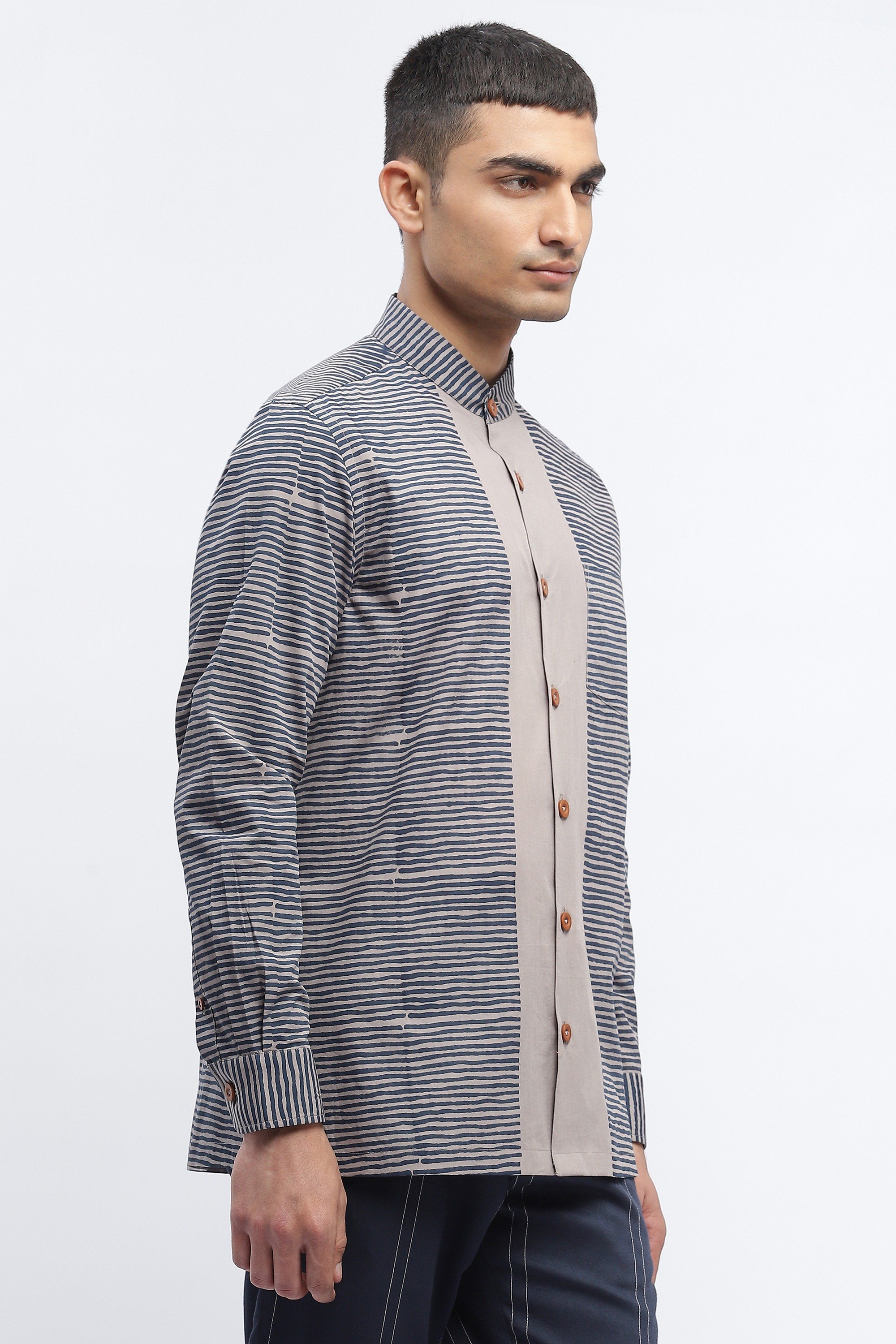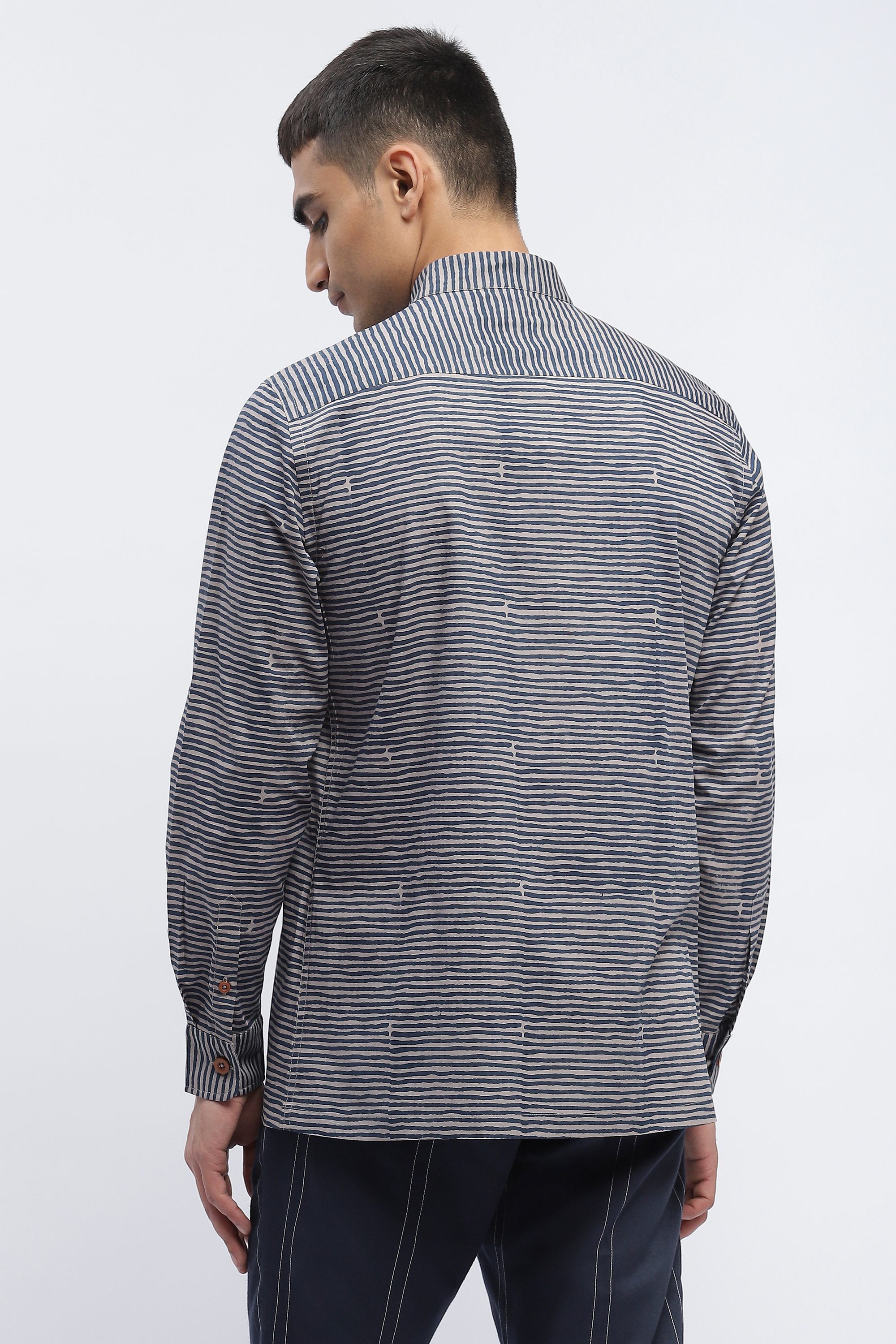 Ideal for an escape, this silver shirt is crafted in breathable cotton poplin. Blockprinted grids of colour form unusal patterns on this creation.