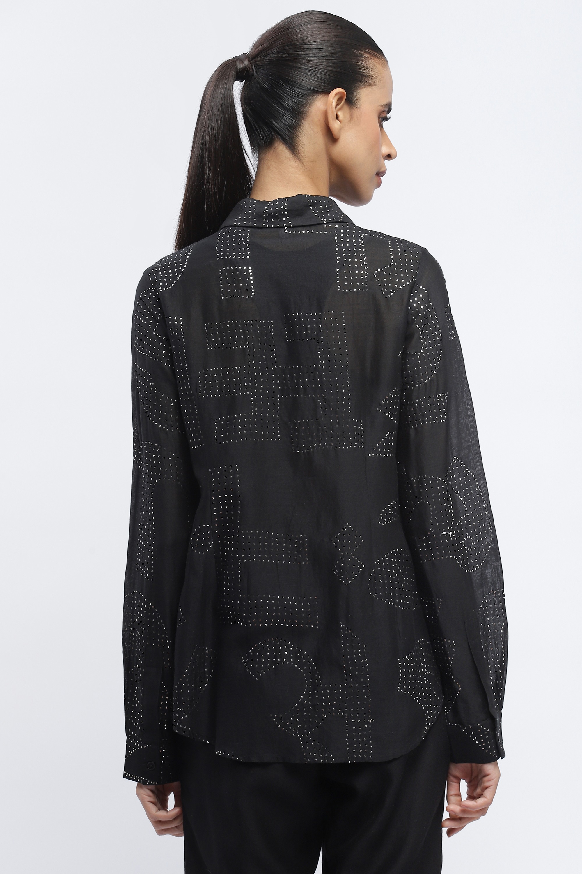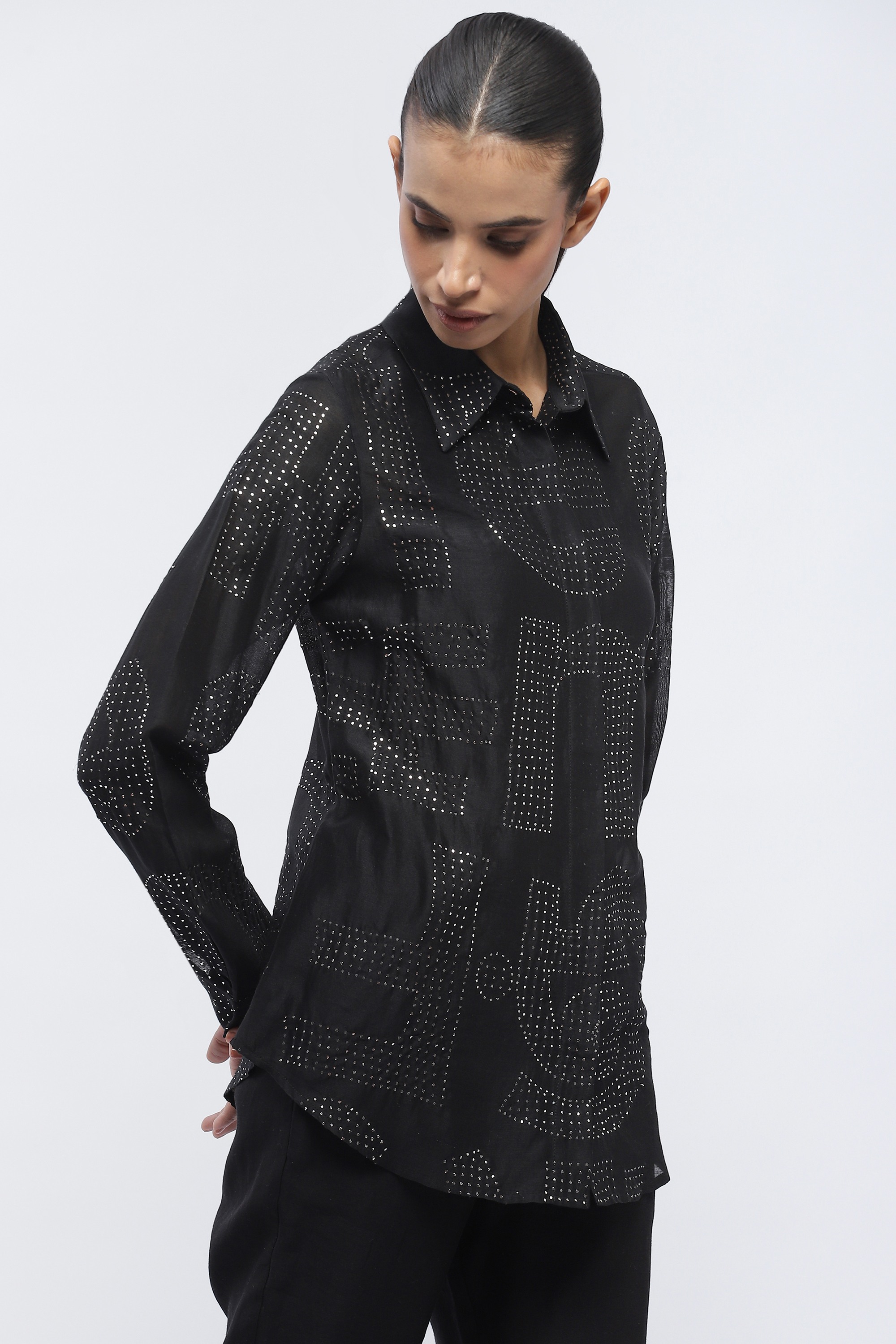 Body Language — from Abraham & Thakore — explores the elements of human communication. This creation is crafted in a blend of silk and cotton and mukeish embroidered with motifs in silver metal.