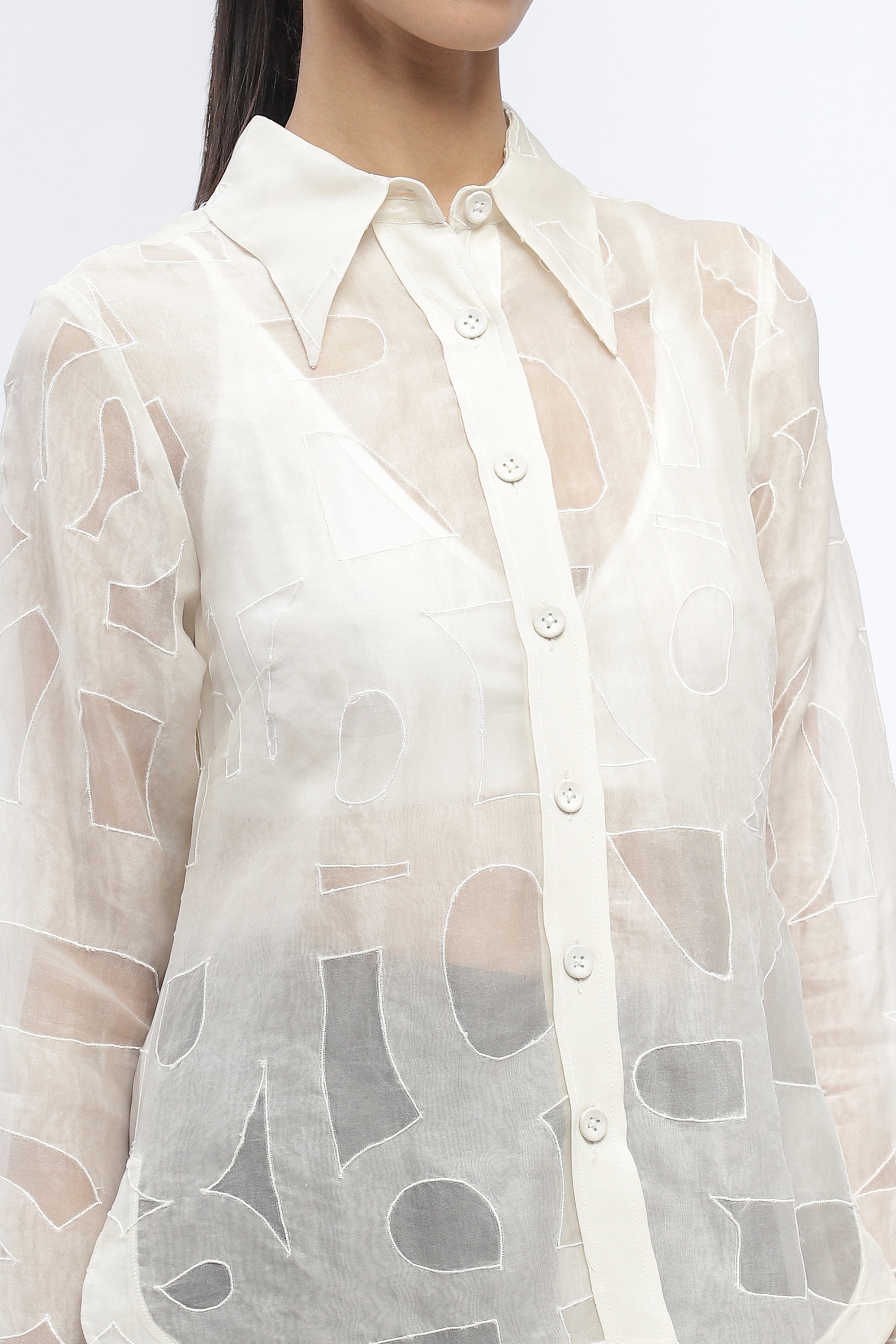 An abridged alphabet, appliqued on an ivory shirt.