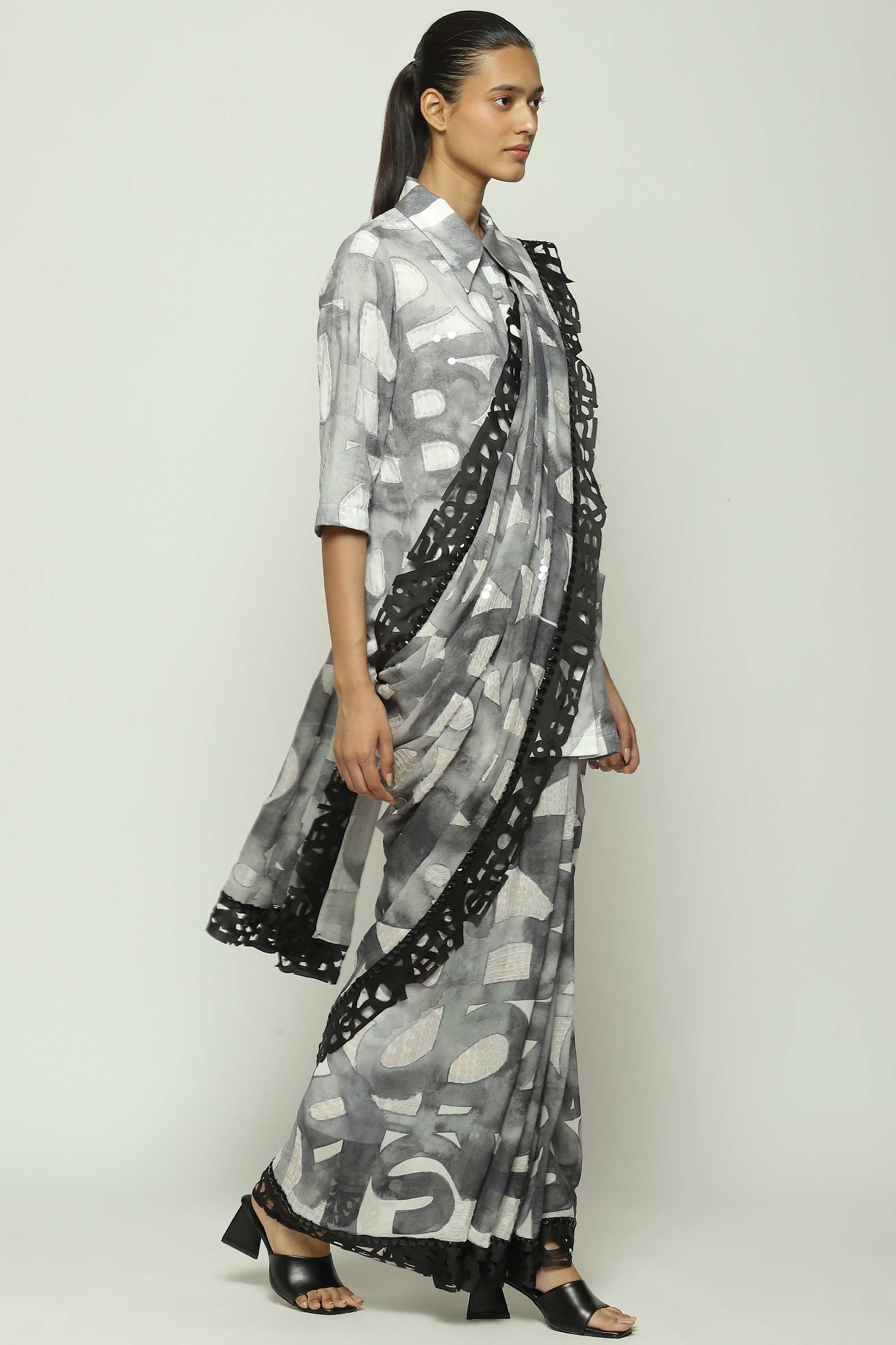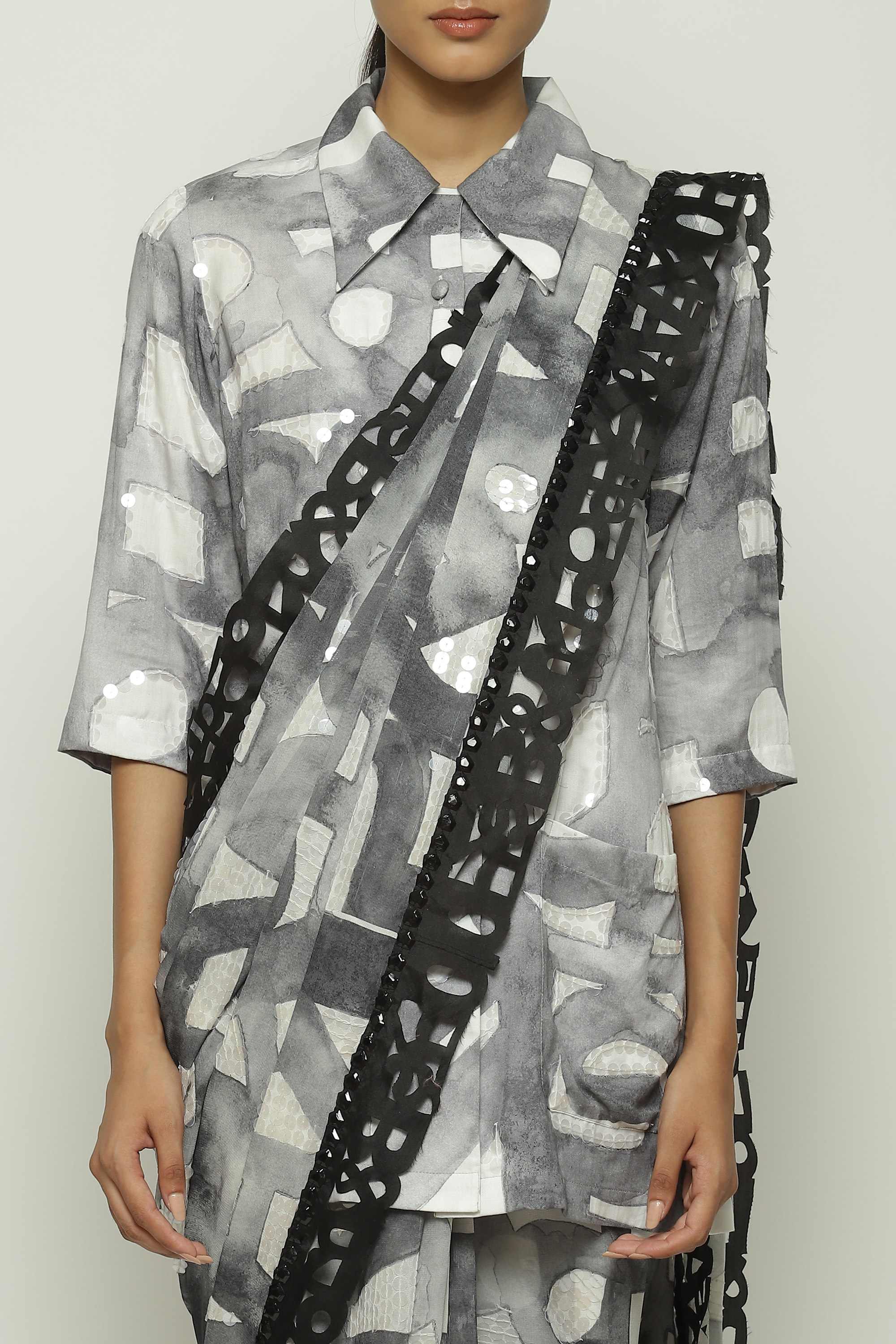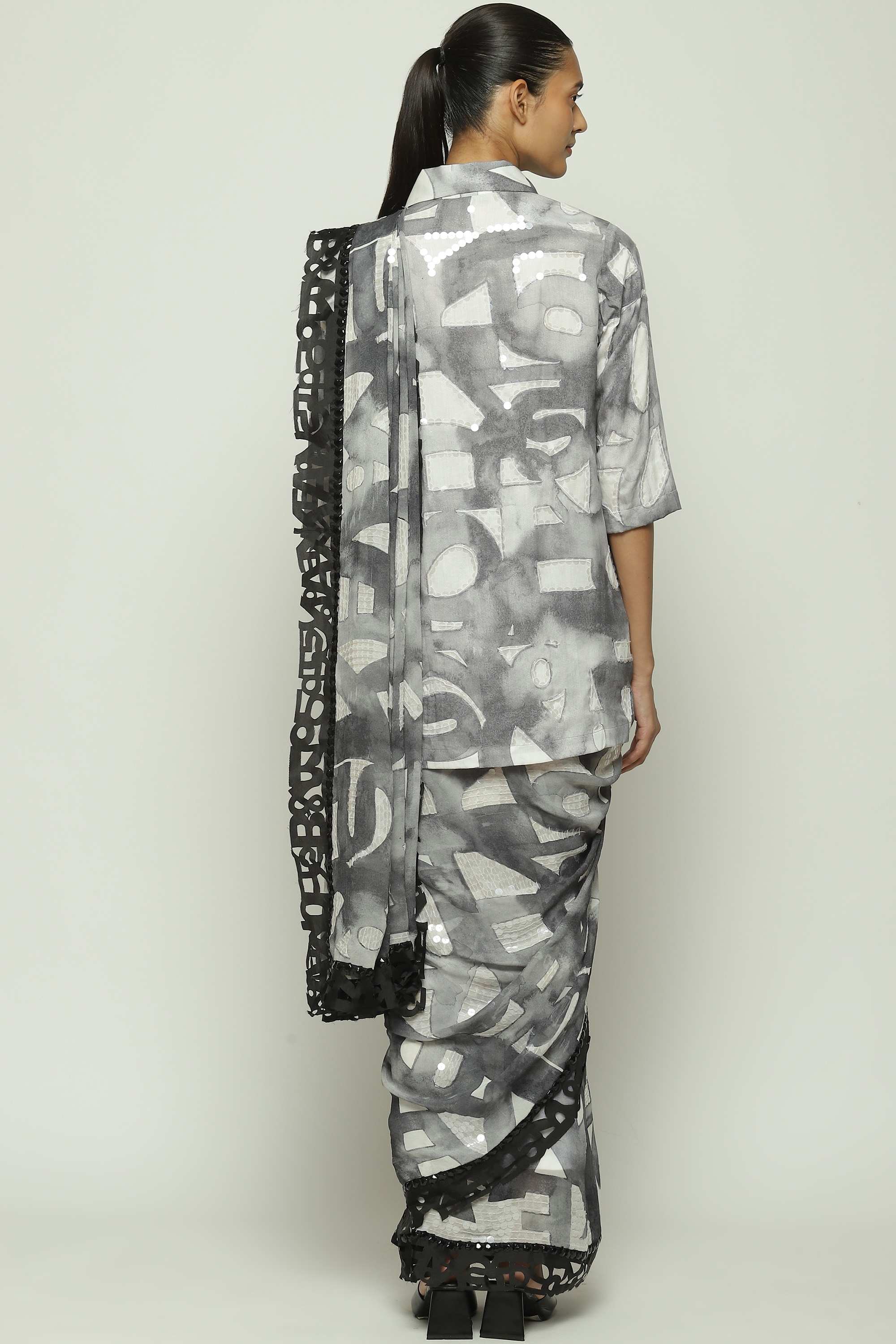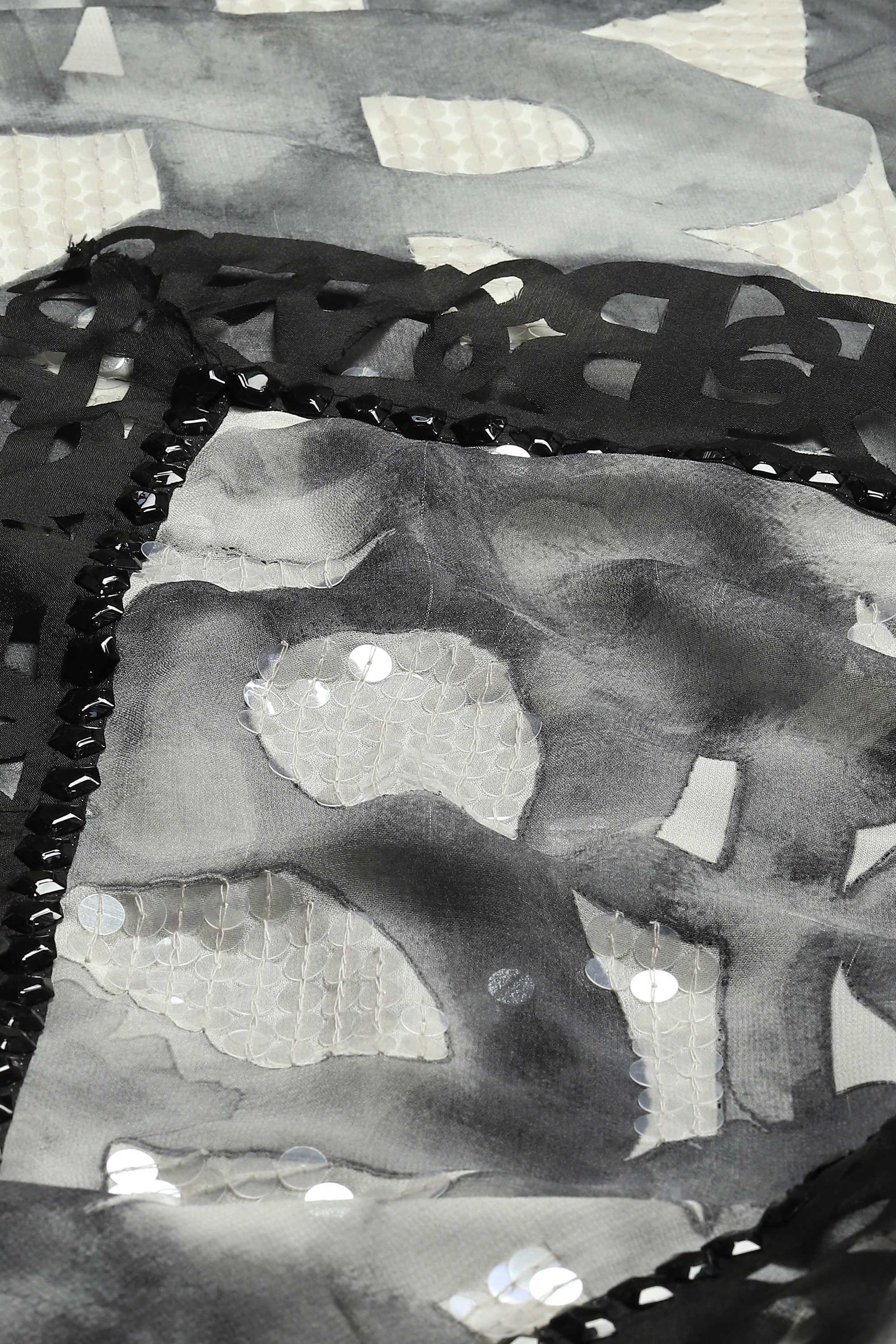 Body Language — from Abraham & Thakore — is a collection of typographic experiments on fabric. This creation is crafted in silk georgette, printed with watercolor glyph motifs, edged with laser-cut rubber and hand adda embroidered with clear sequins.