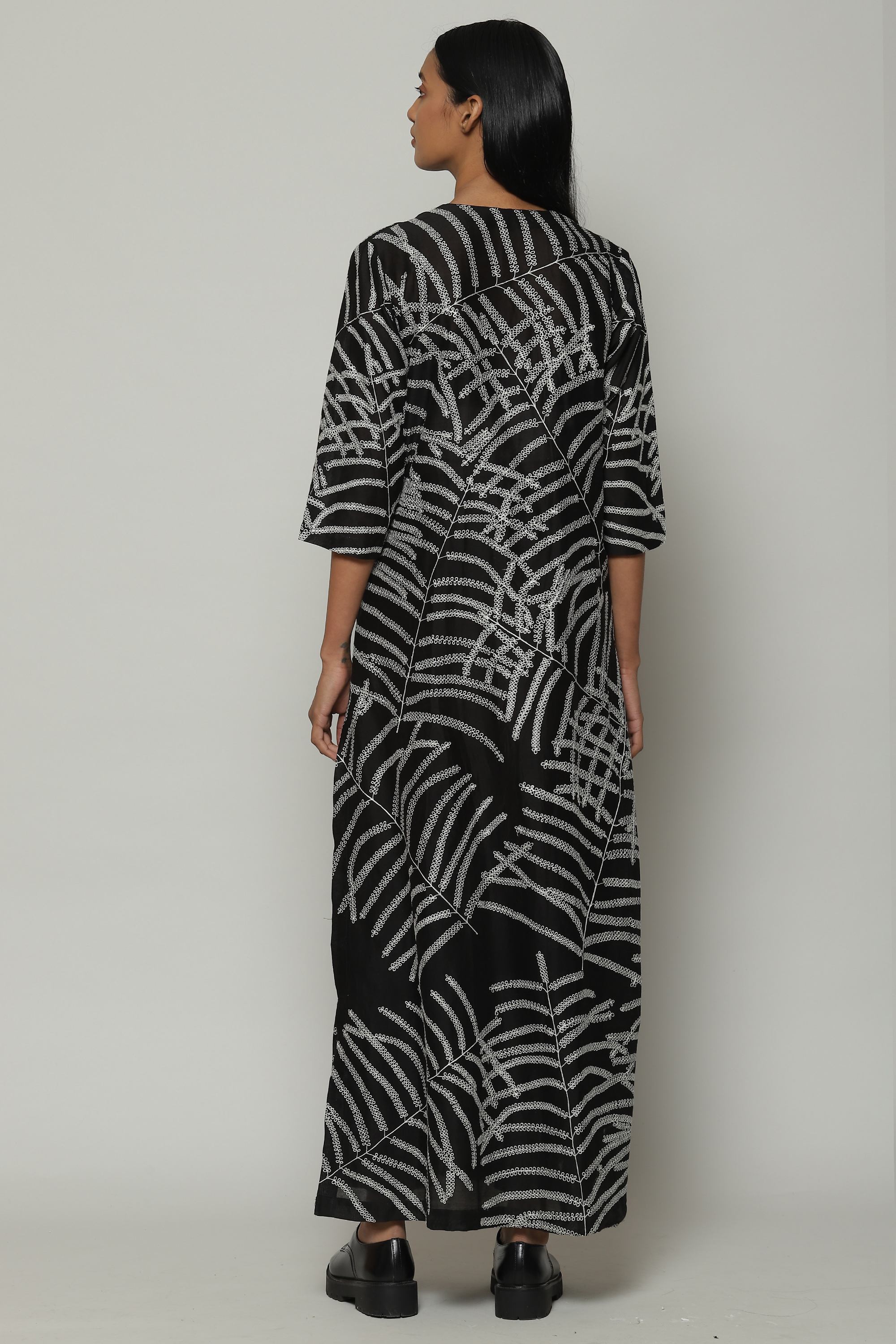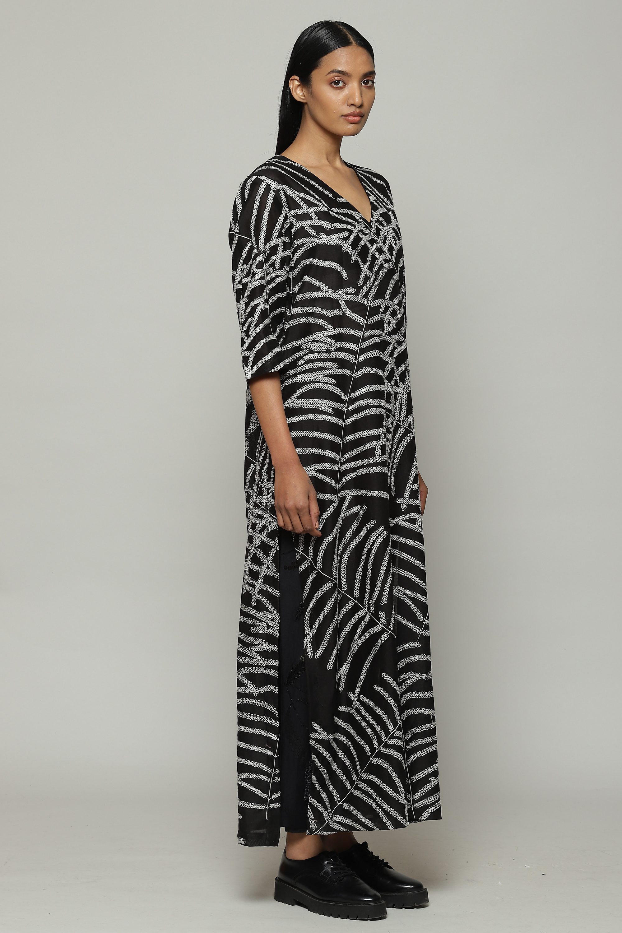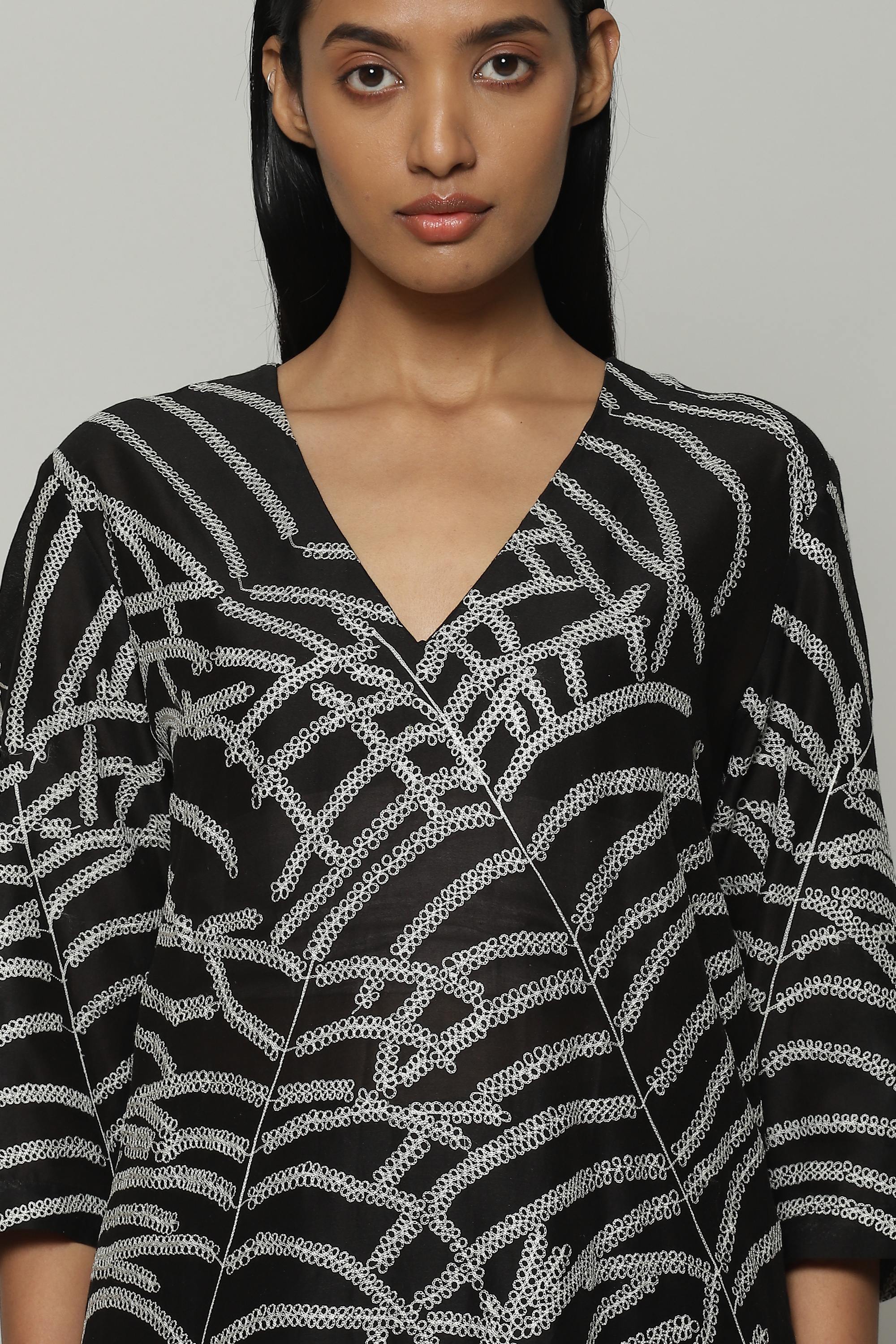 Black and white is the brand's DNA, and this silk-cotton kurta embodies it. Features an abstract, botanical pattern that was first hand drawn before it was embroidered using fine silk yarns. A perfect garment for a day that mixes work and pleasure.