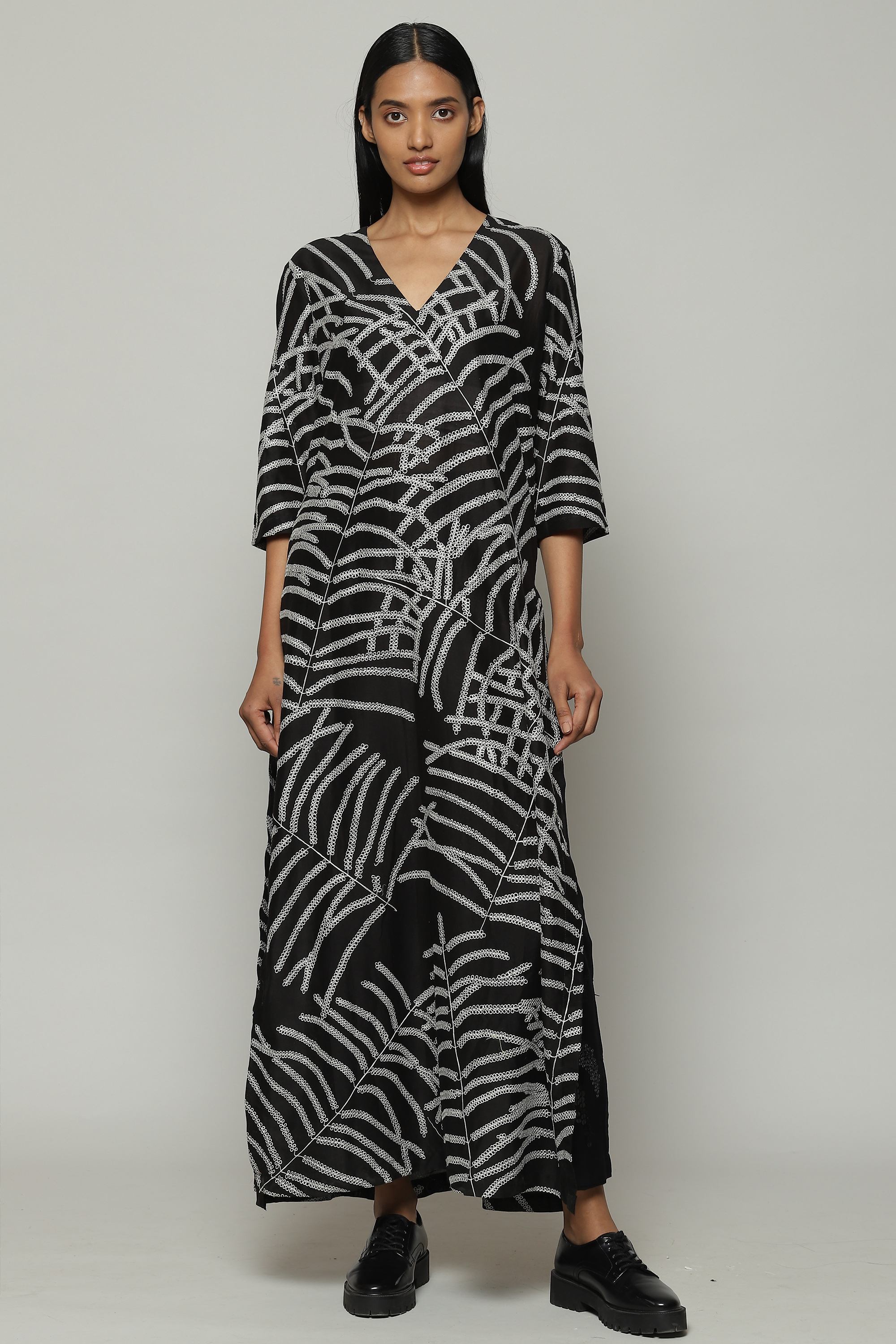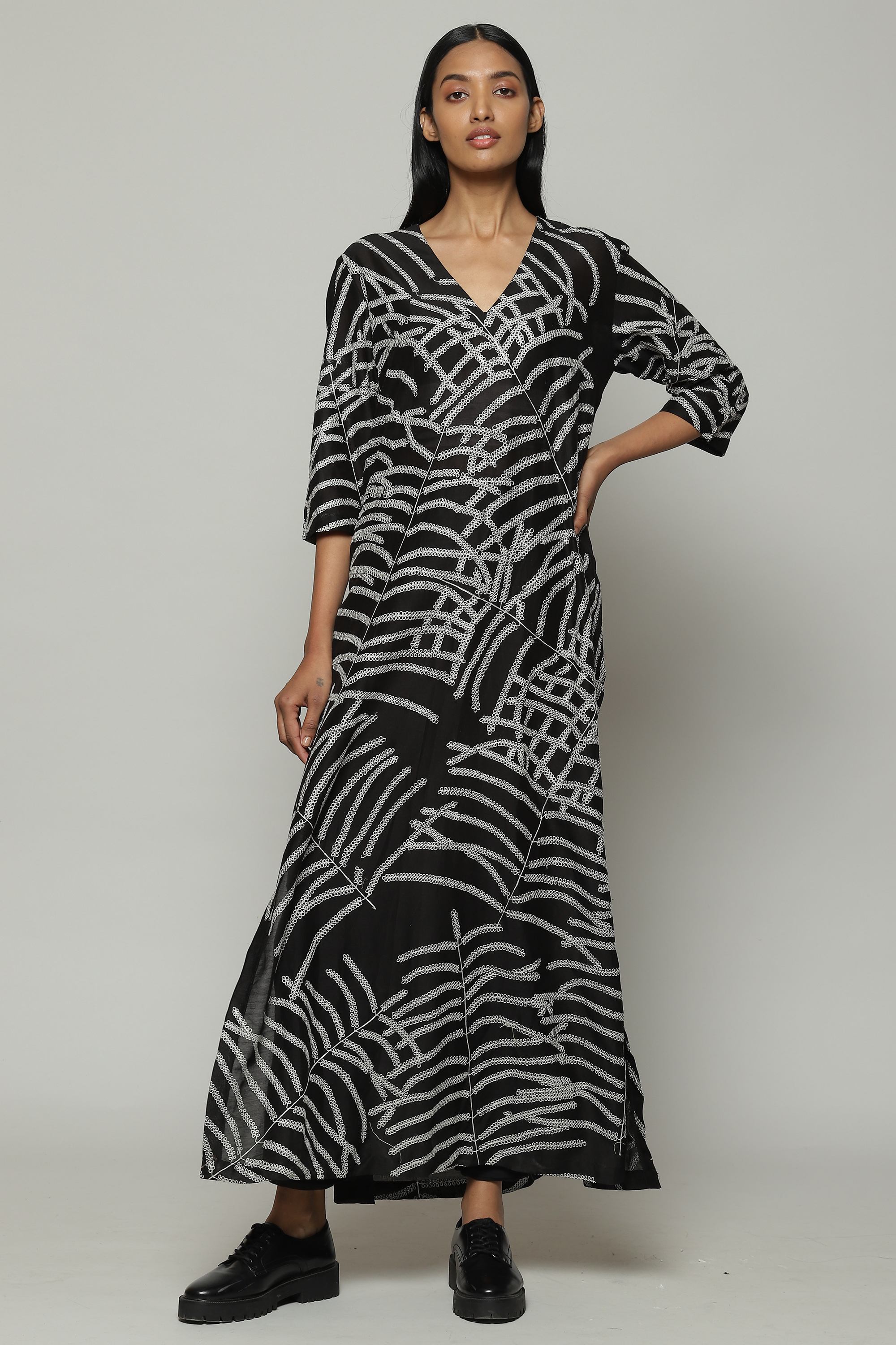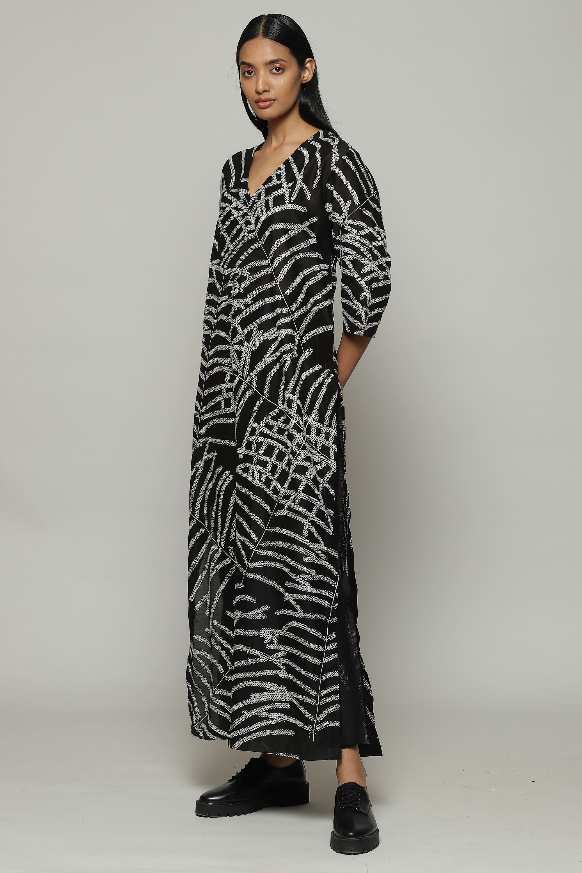 Black and white is the brand's DNA, and this silk-cotton kurta embodies it. Features an abstract, botanical pattern that was first hand drawn before it was embroidered using fine silk yarns. A perfect garment for a day that mixes work and pleasure.