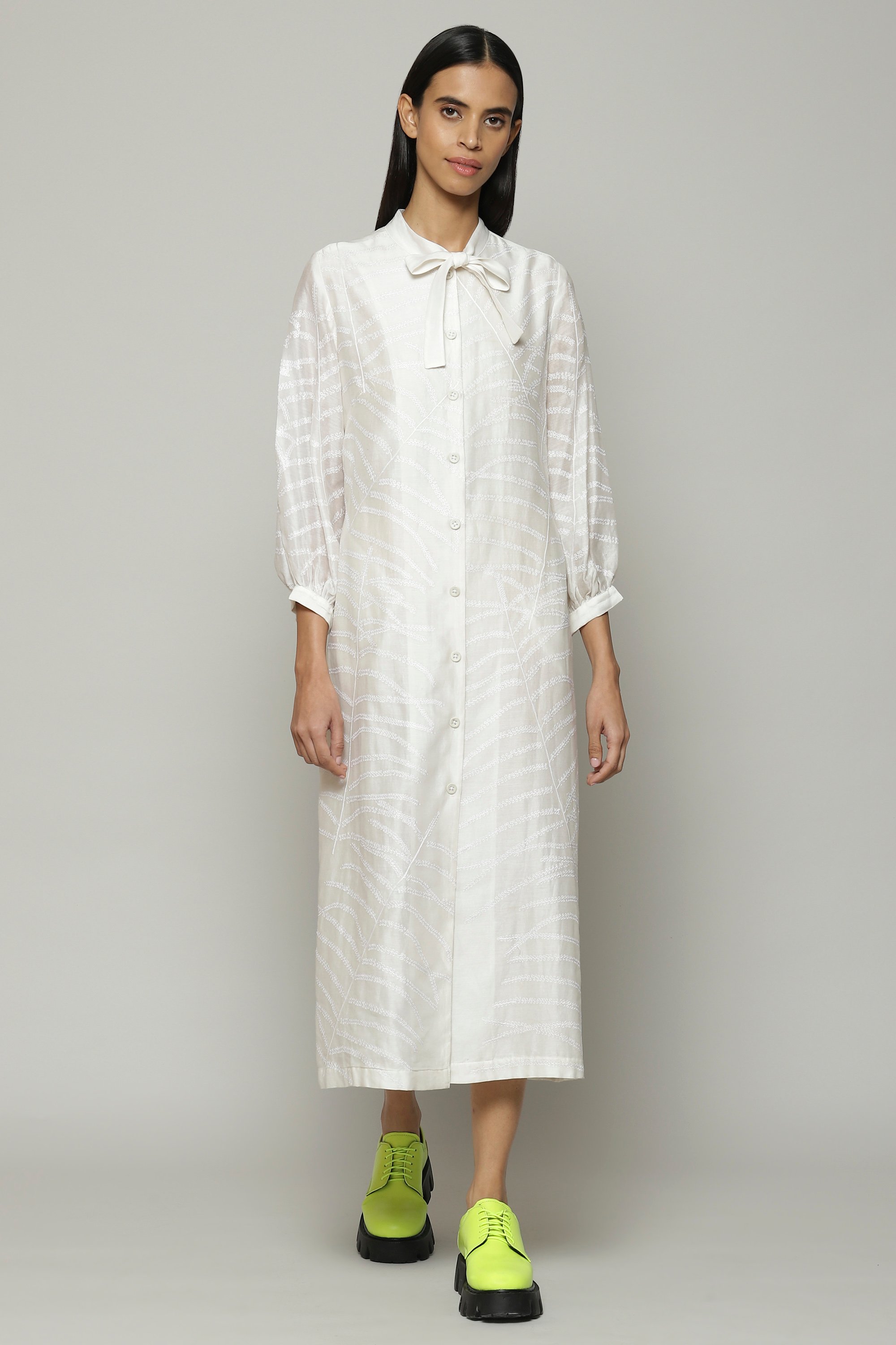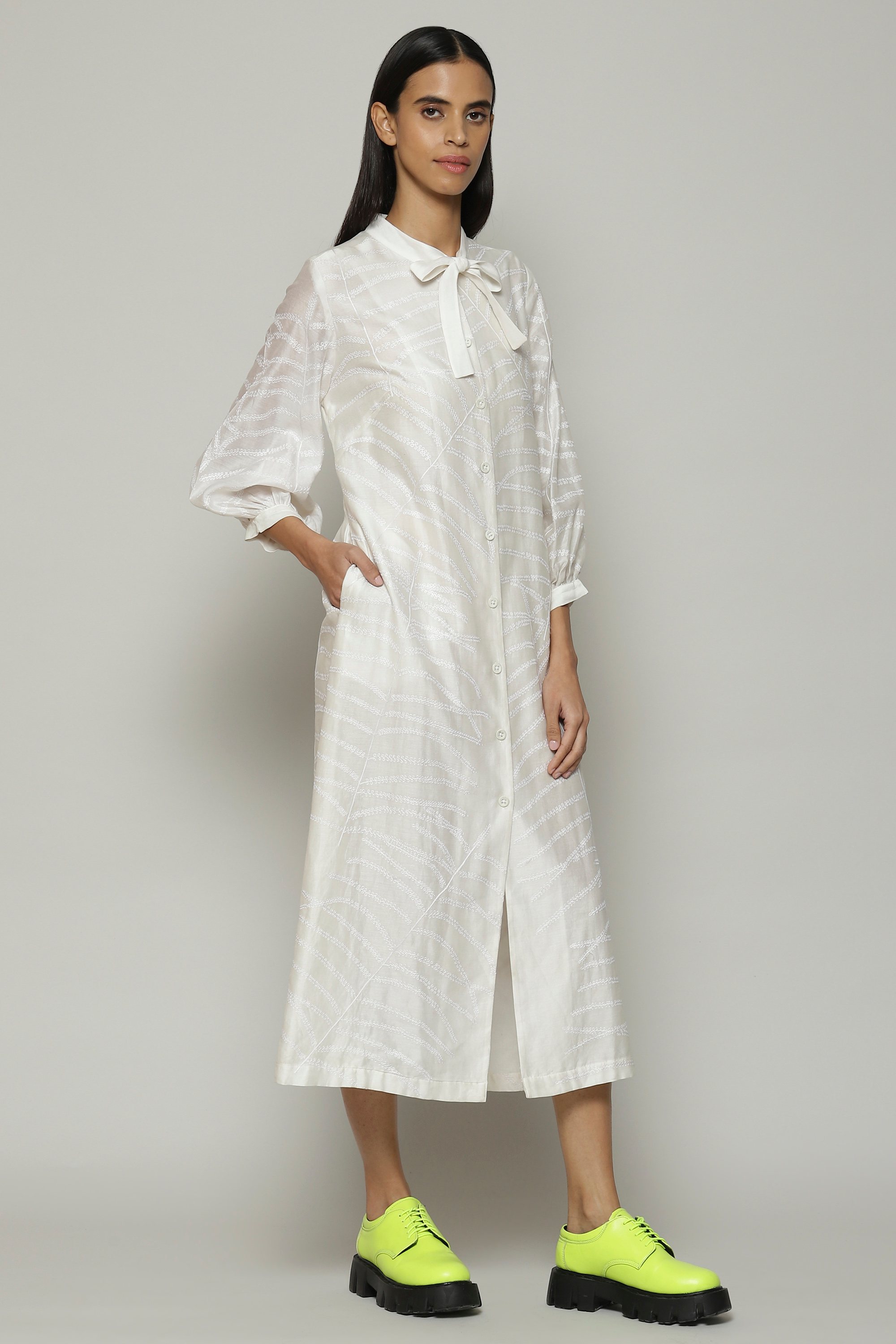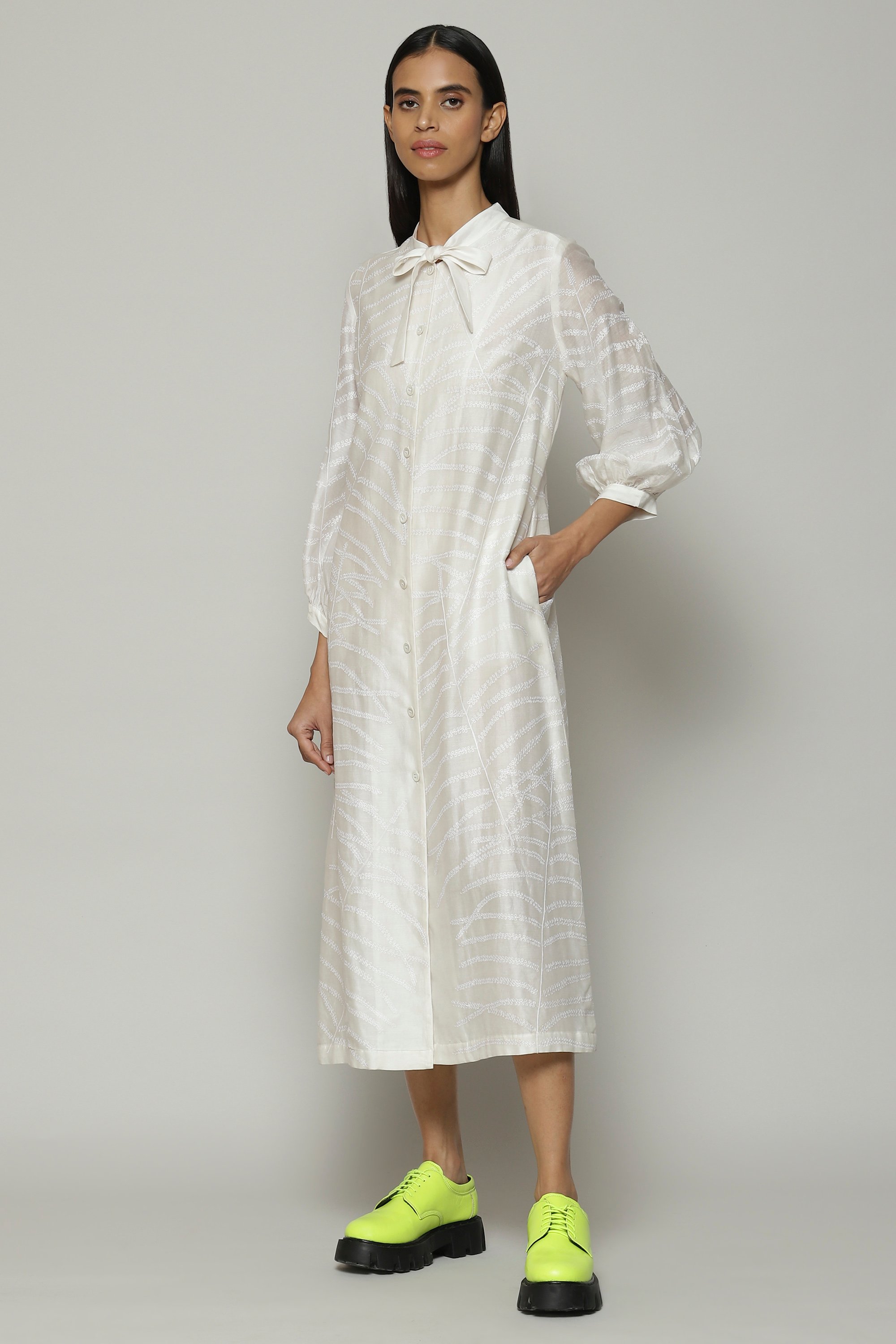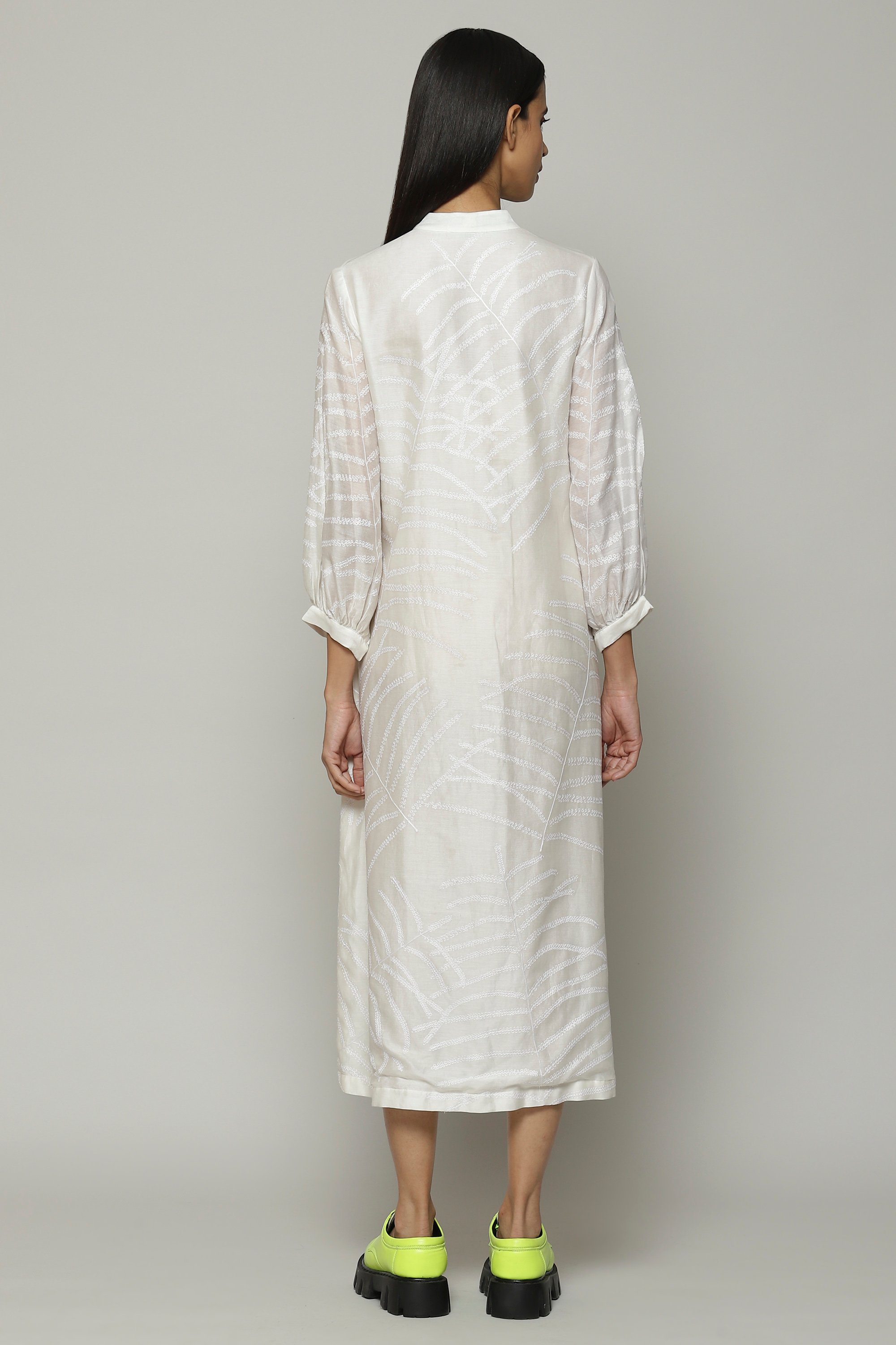 An ivory tunic with buttons down its length. The Chanderi fabric is embroidered in soft silk yarn, giving the fabric a light and luxurious feel. Perfect to keep you cool on a warm, summer day.