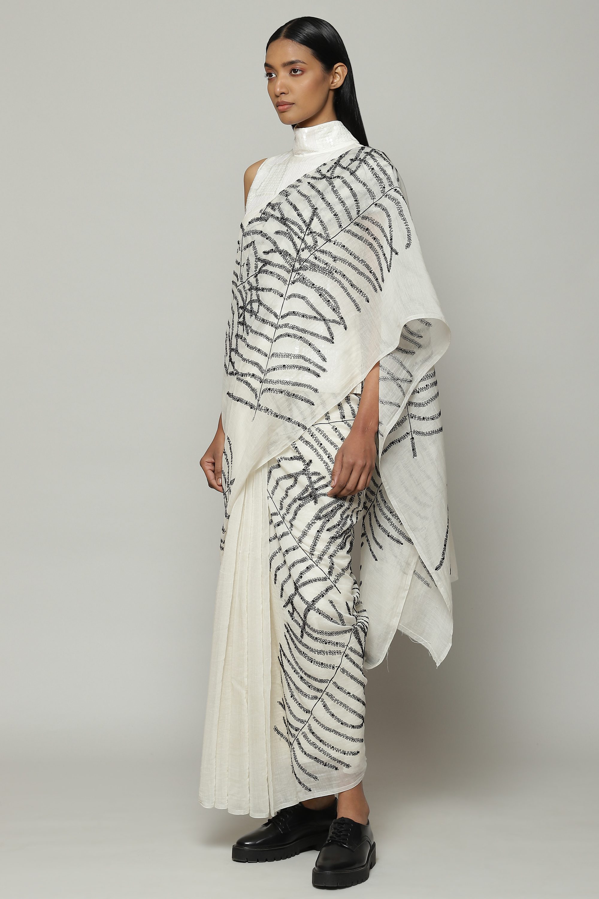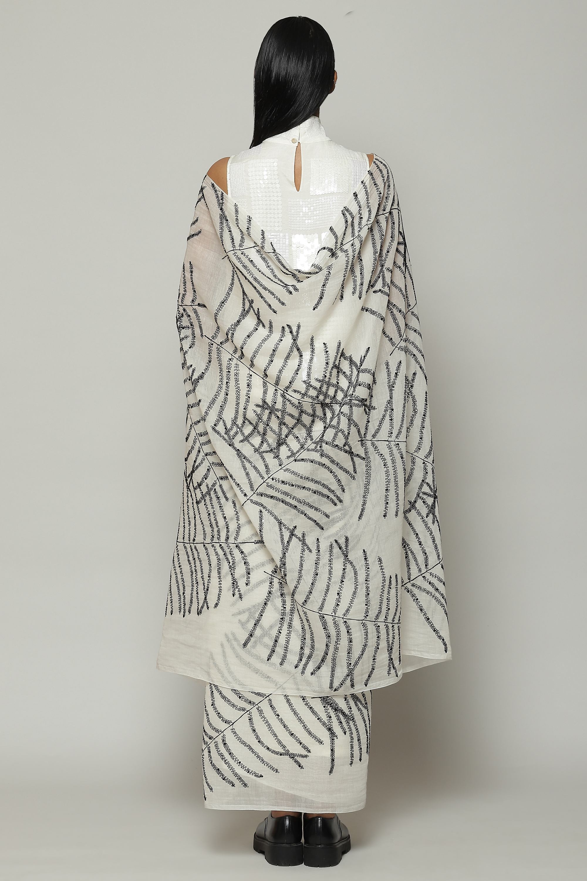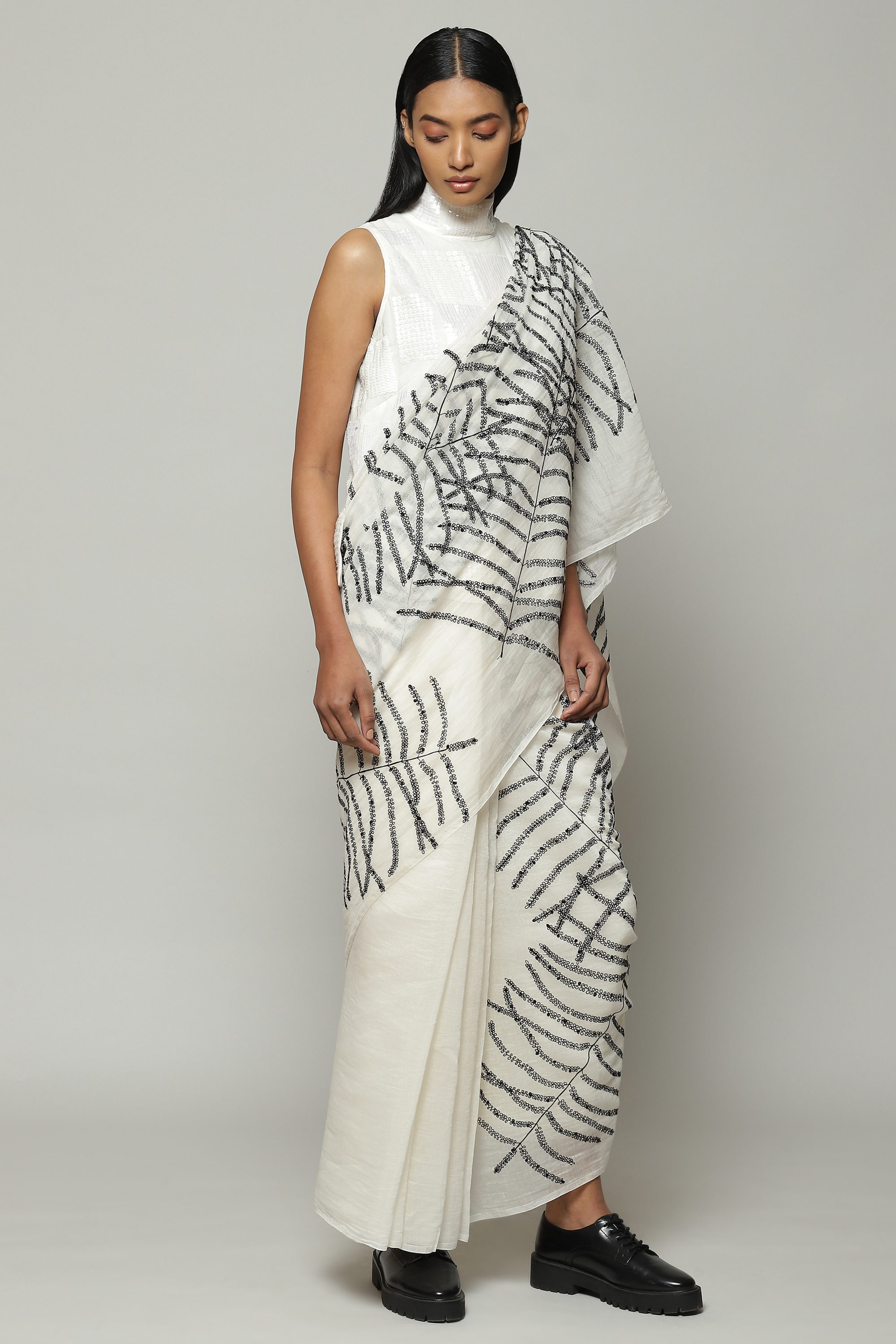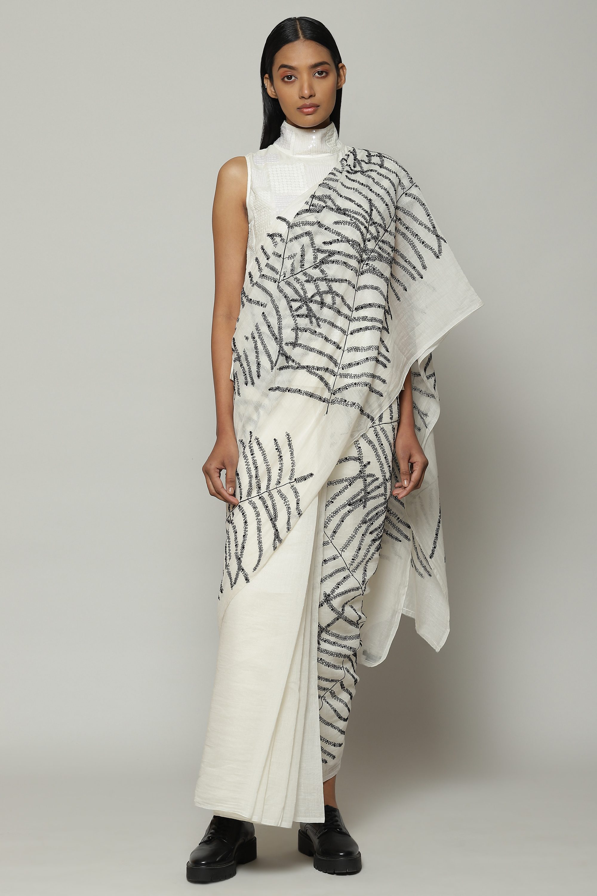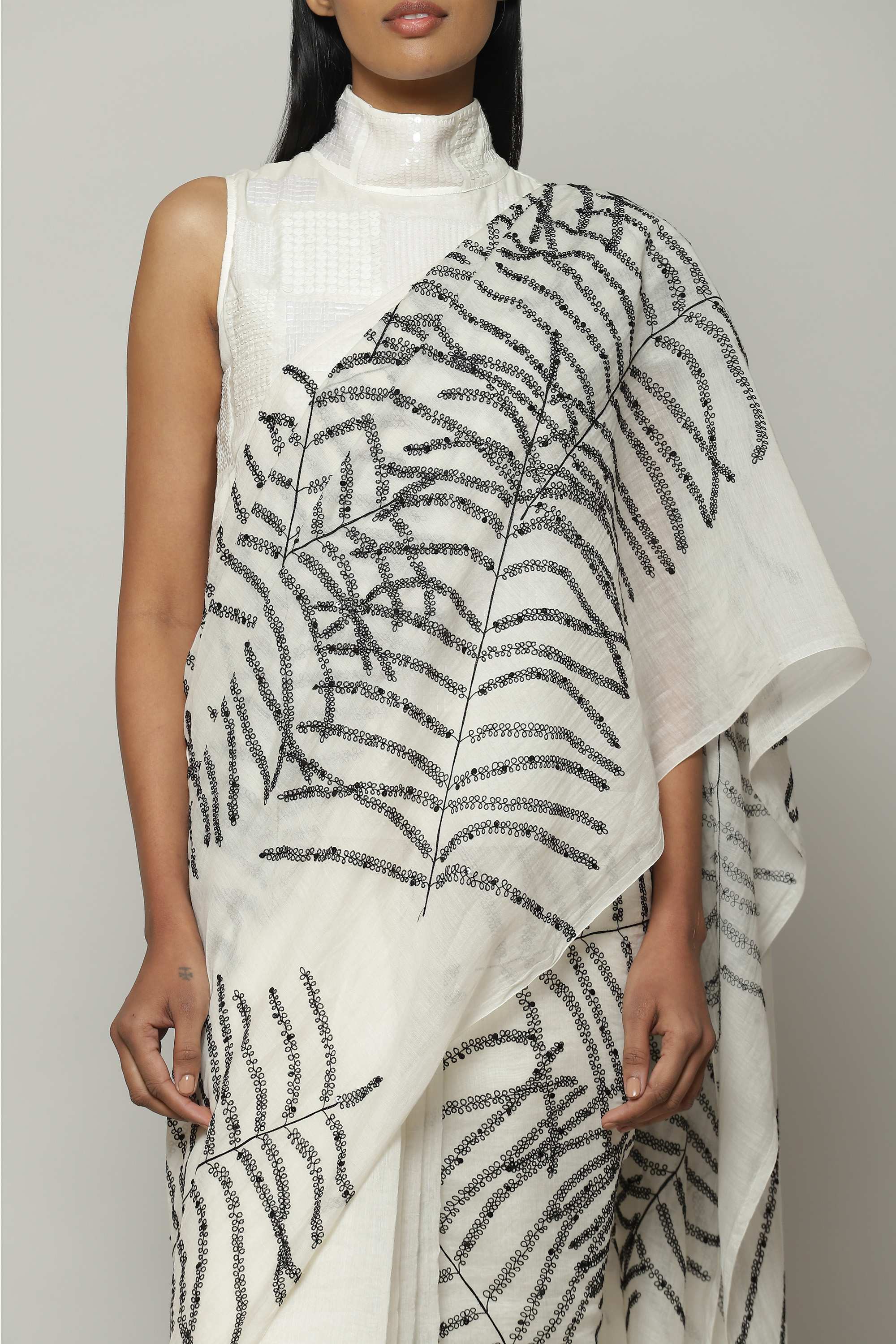 A monochrome sari plays with the beauty of crewel embroidery: an art form that is at least a thousand years old. This is further enhanced with sequin work, that adds a dash of minimal glam.