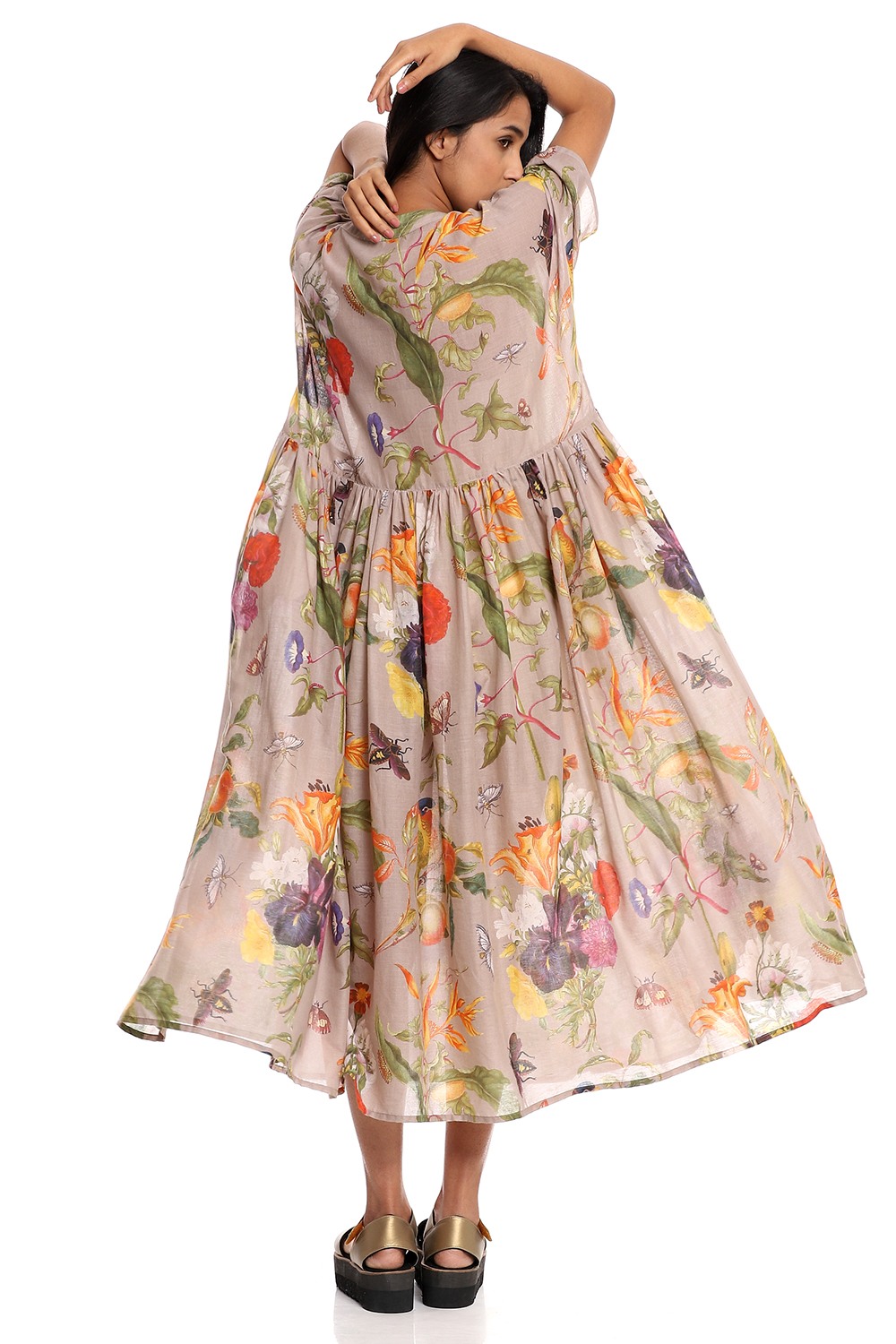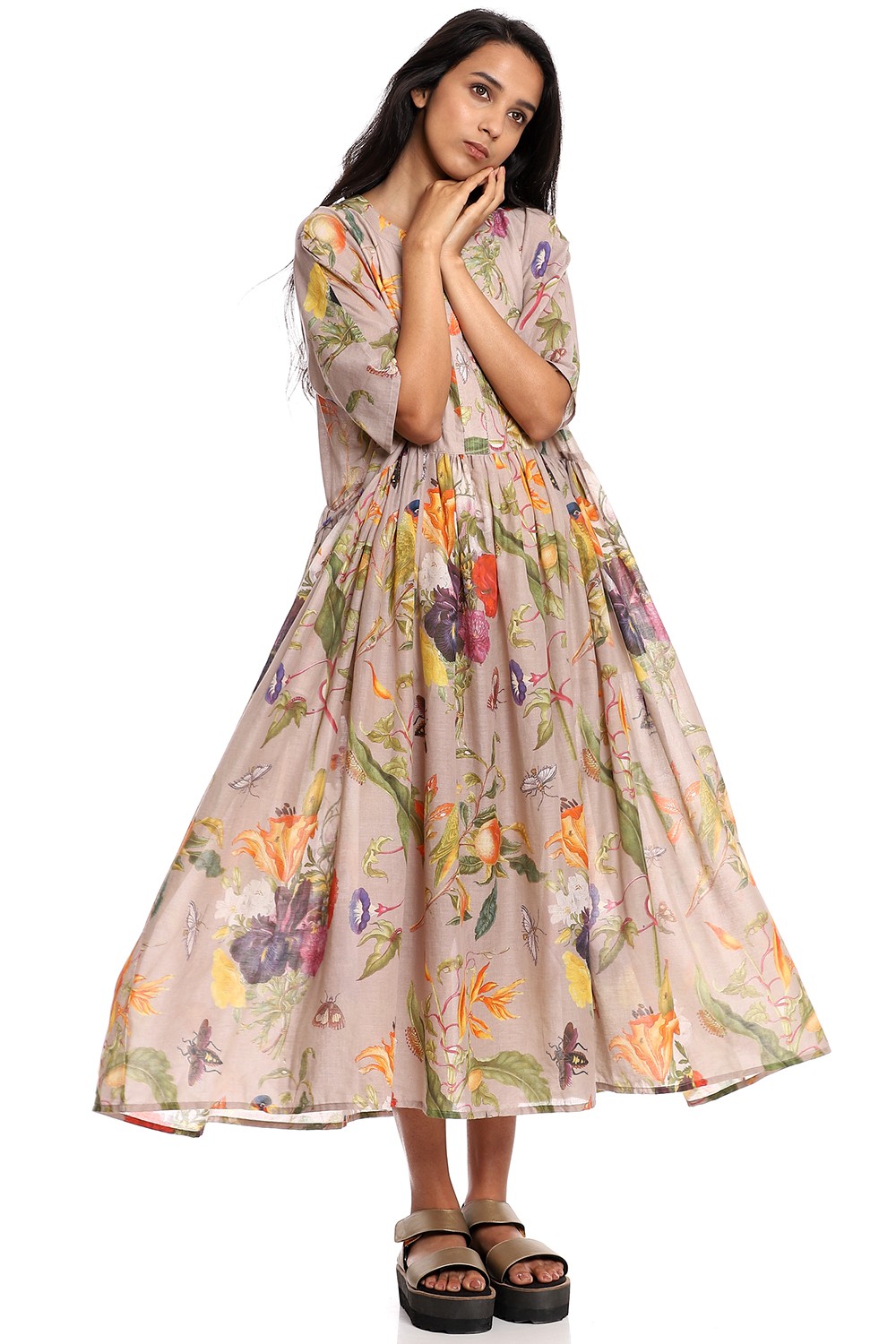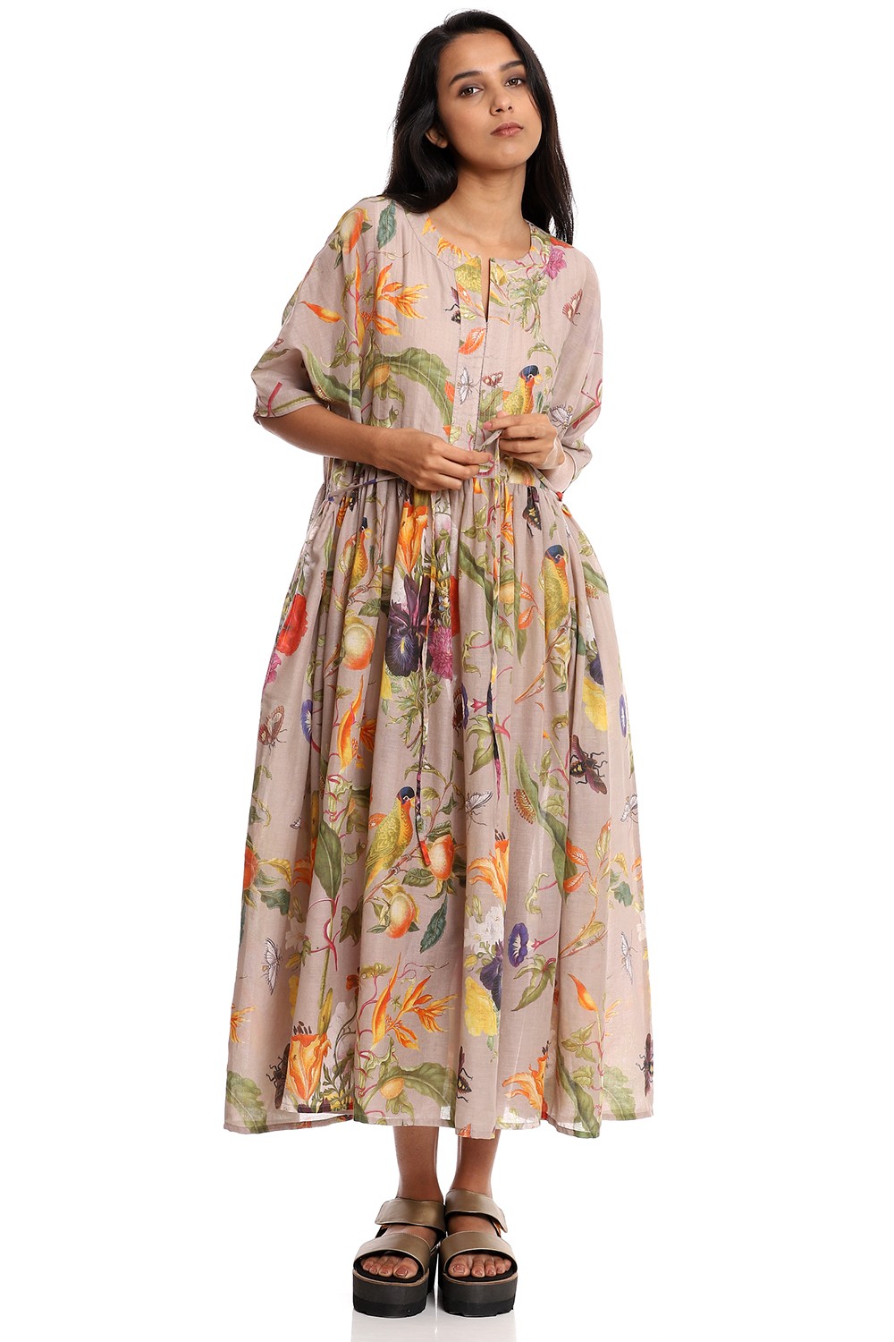 A breathable billowing flared tropical print dress, crafted from soft-to-touch cotton voile on a beige ground.