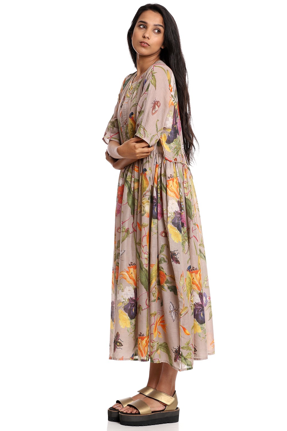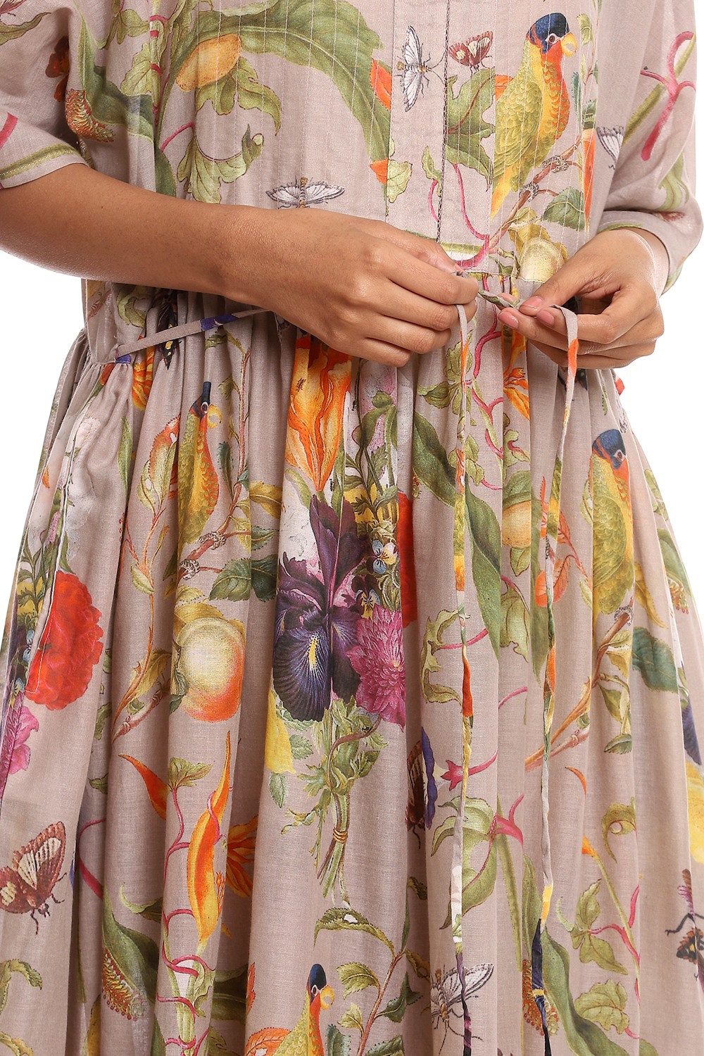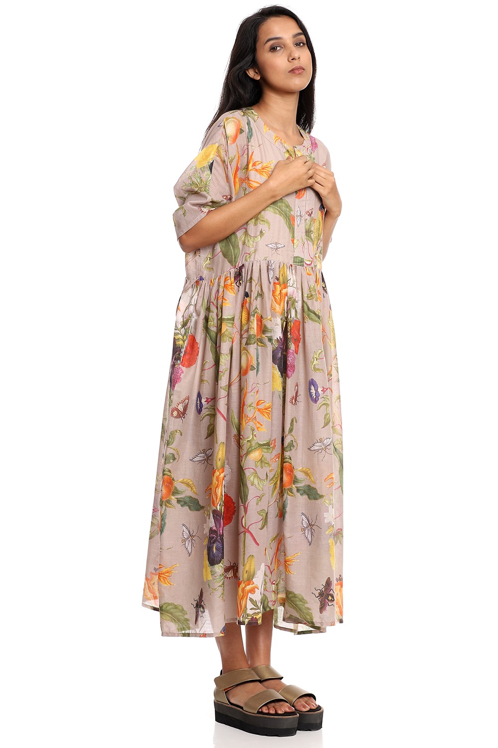 A breathable billowing flared tropical print dress, crafted from soft-to-touch cotton voile on a beige ground.