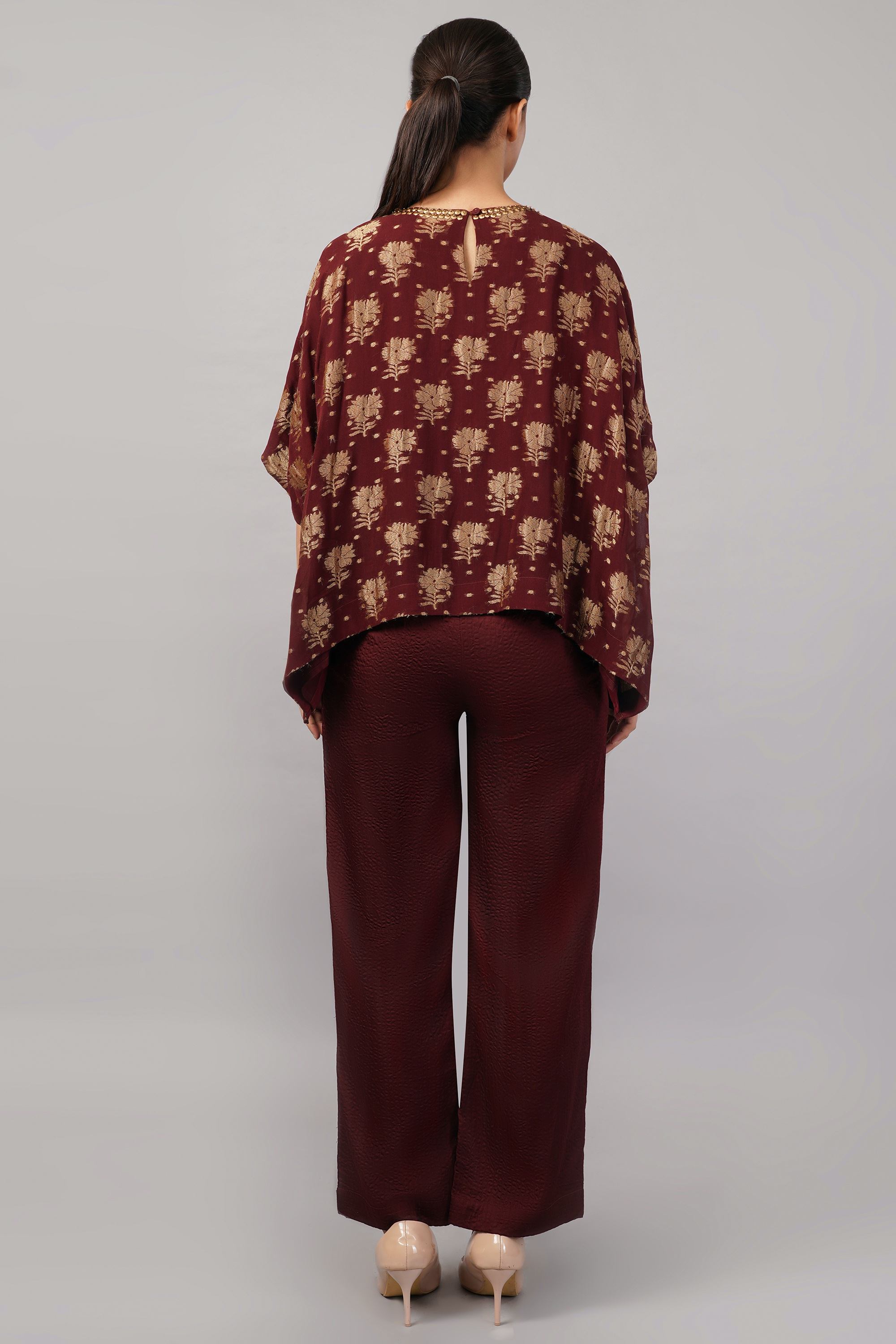 This limited edition piece has been made using a specially woven brocade in a silk georgette base, and embellished with gold sequins. The placement and color add subtle glamour for a striking effect.