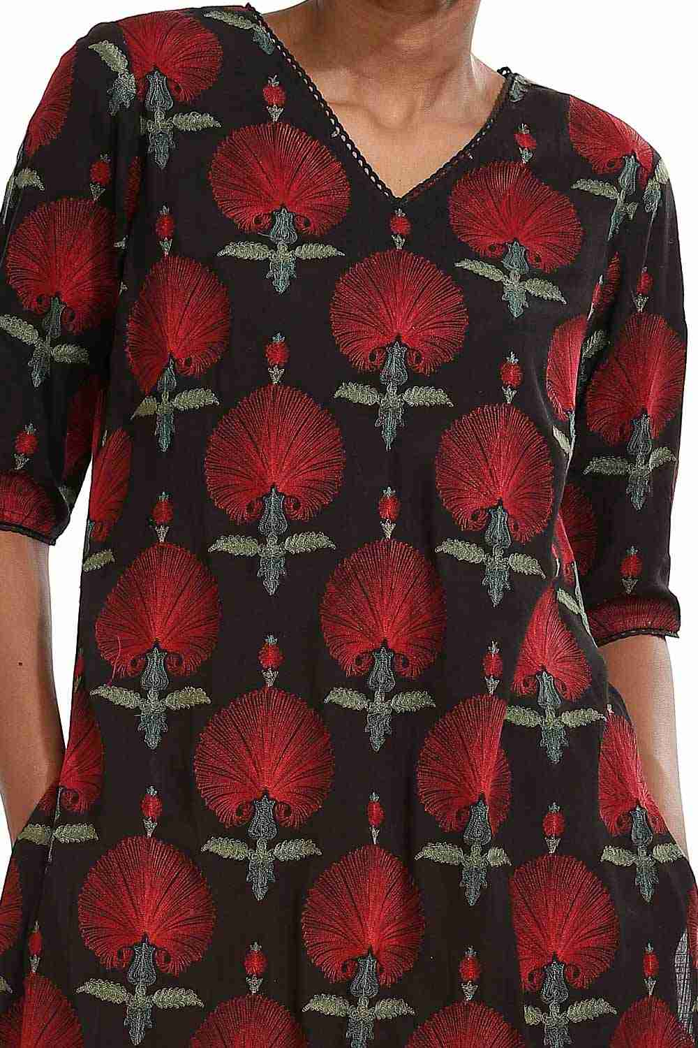 Floral buta embroidery with lace trim. This garment is exclusively handcrafted using an environmentally sustainable viscose.