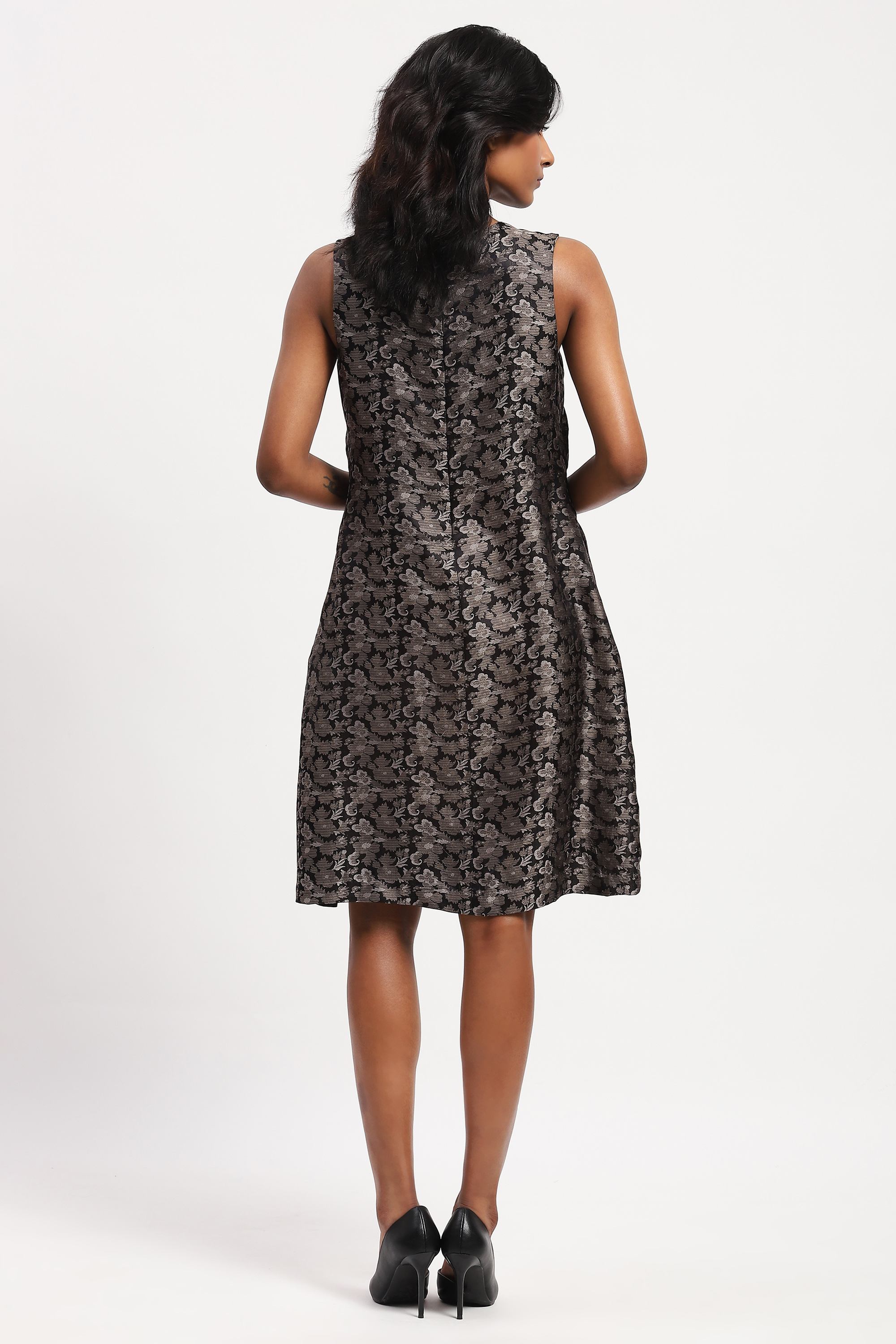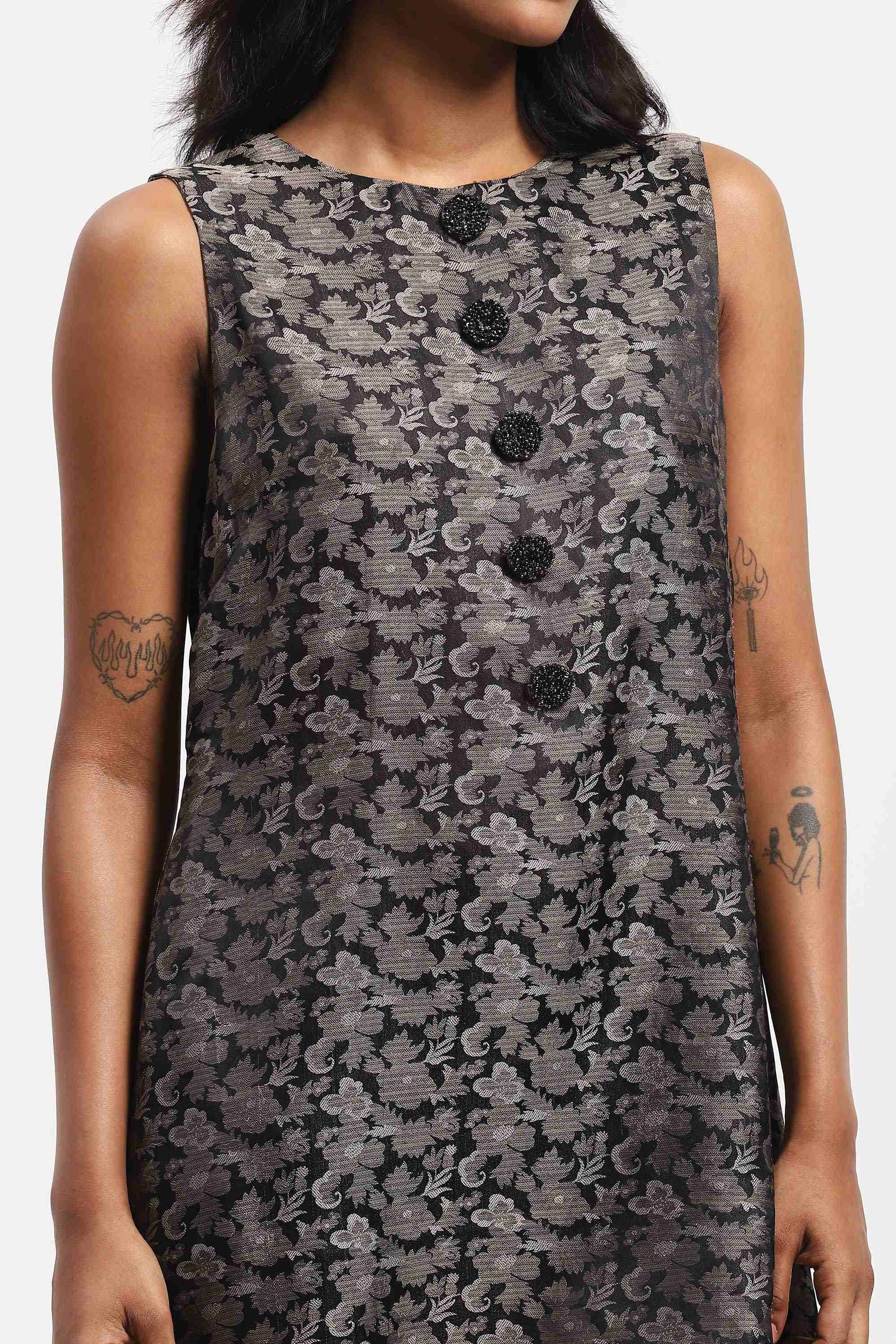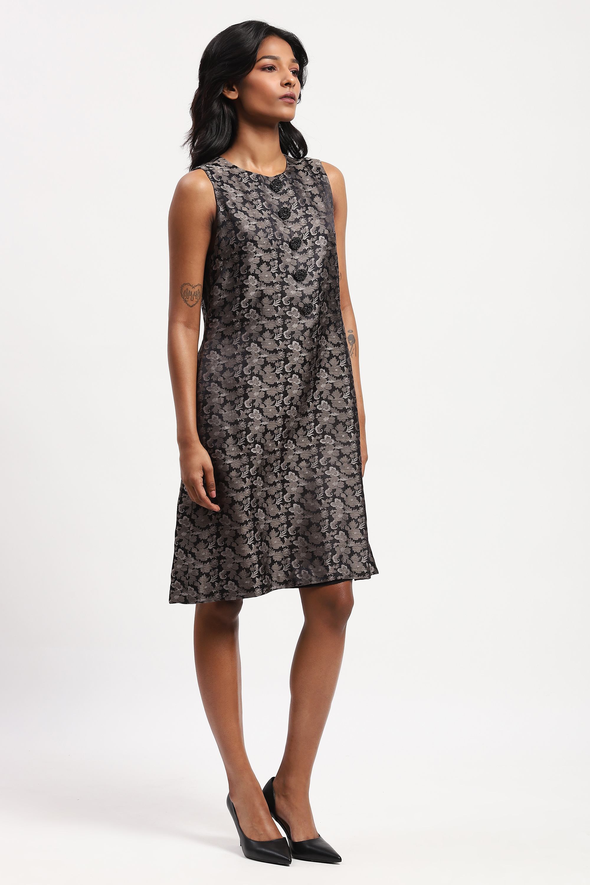 Best paired with an honest song, sung from the heart, this grey dress is crafted in soft and complex tanchoi silk. Its floral motifs are woven into the fabric using a technique similar to brocade.