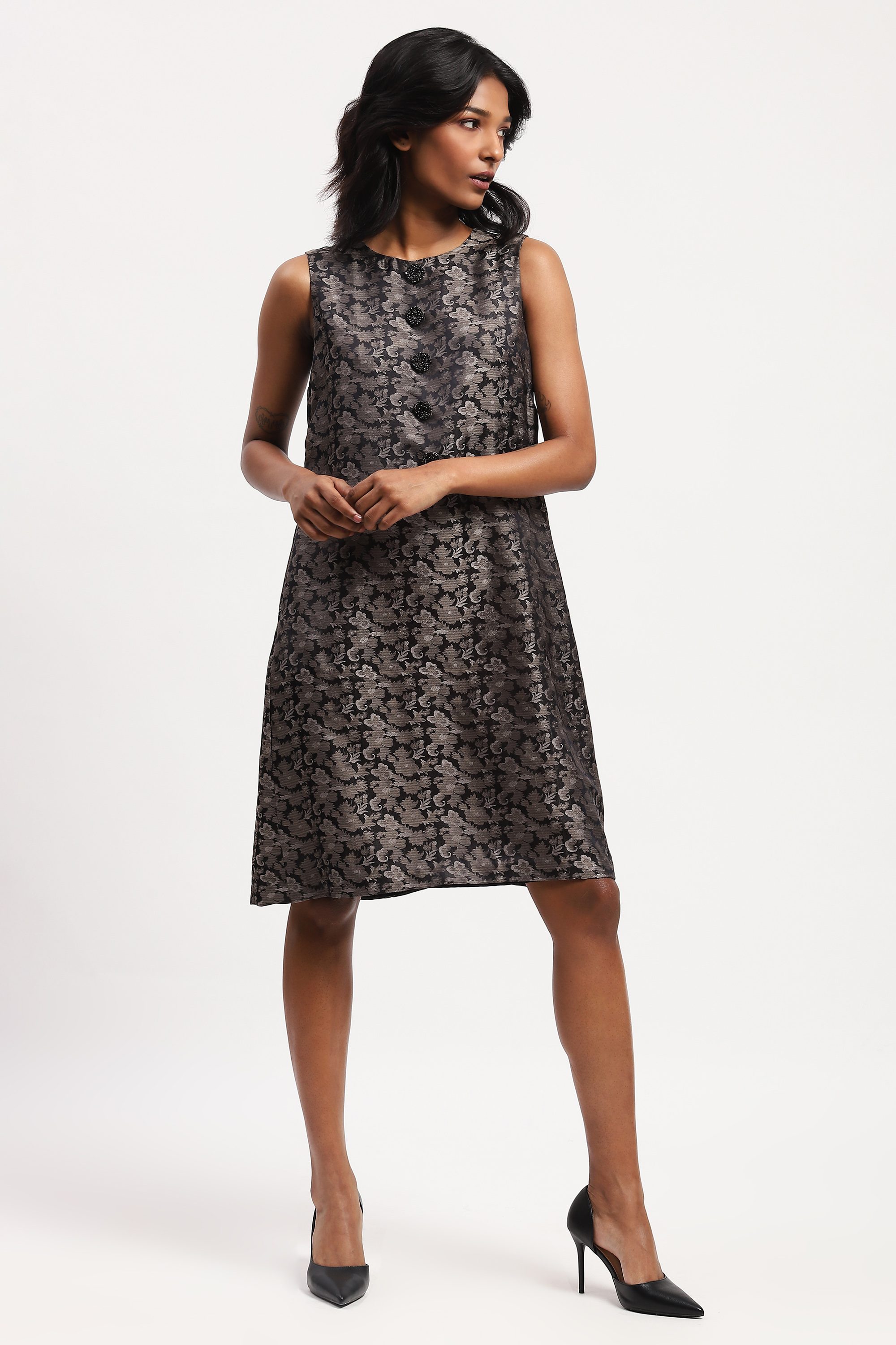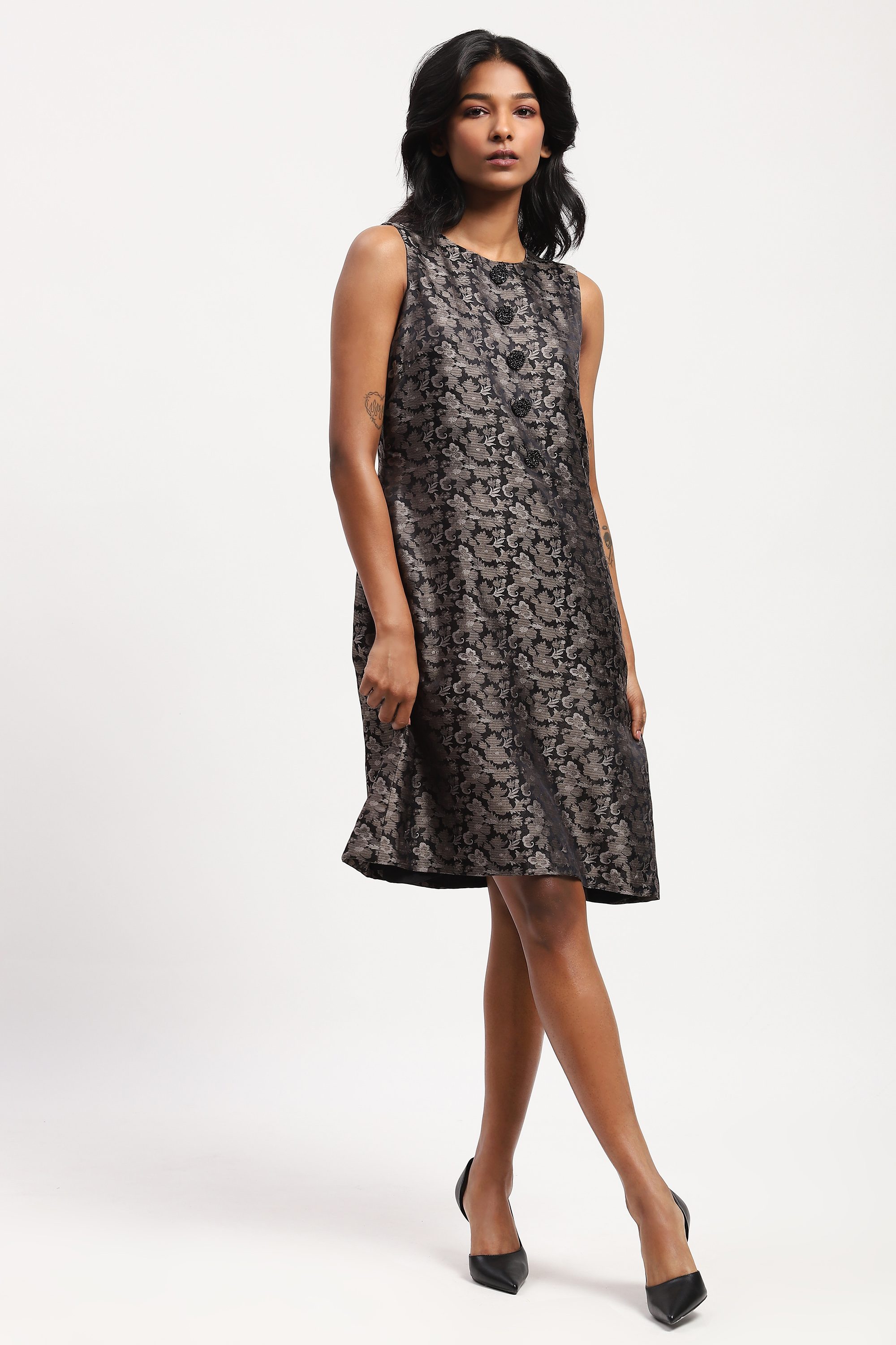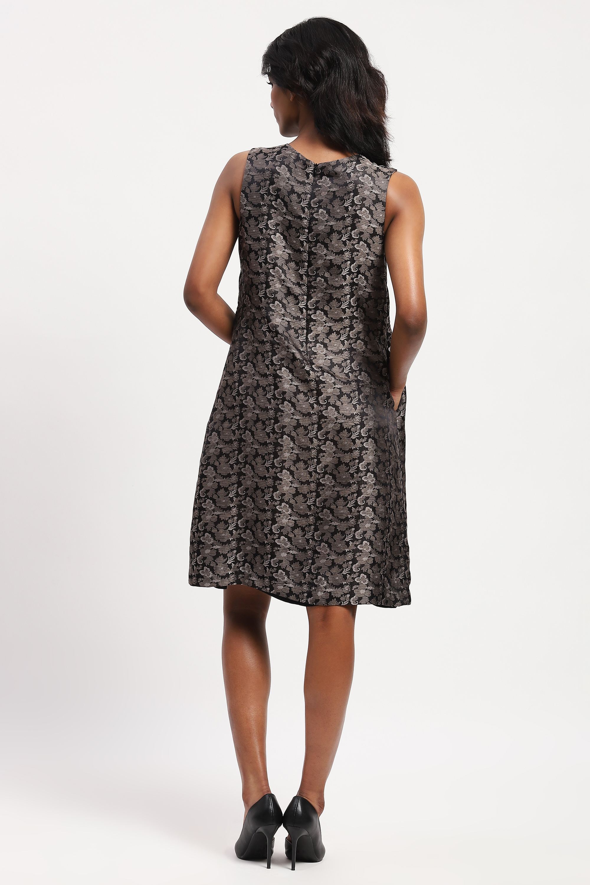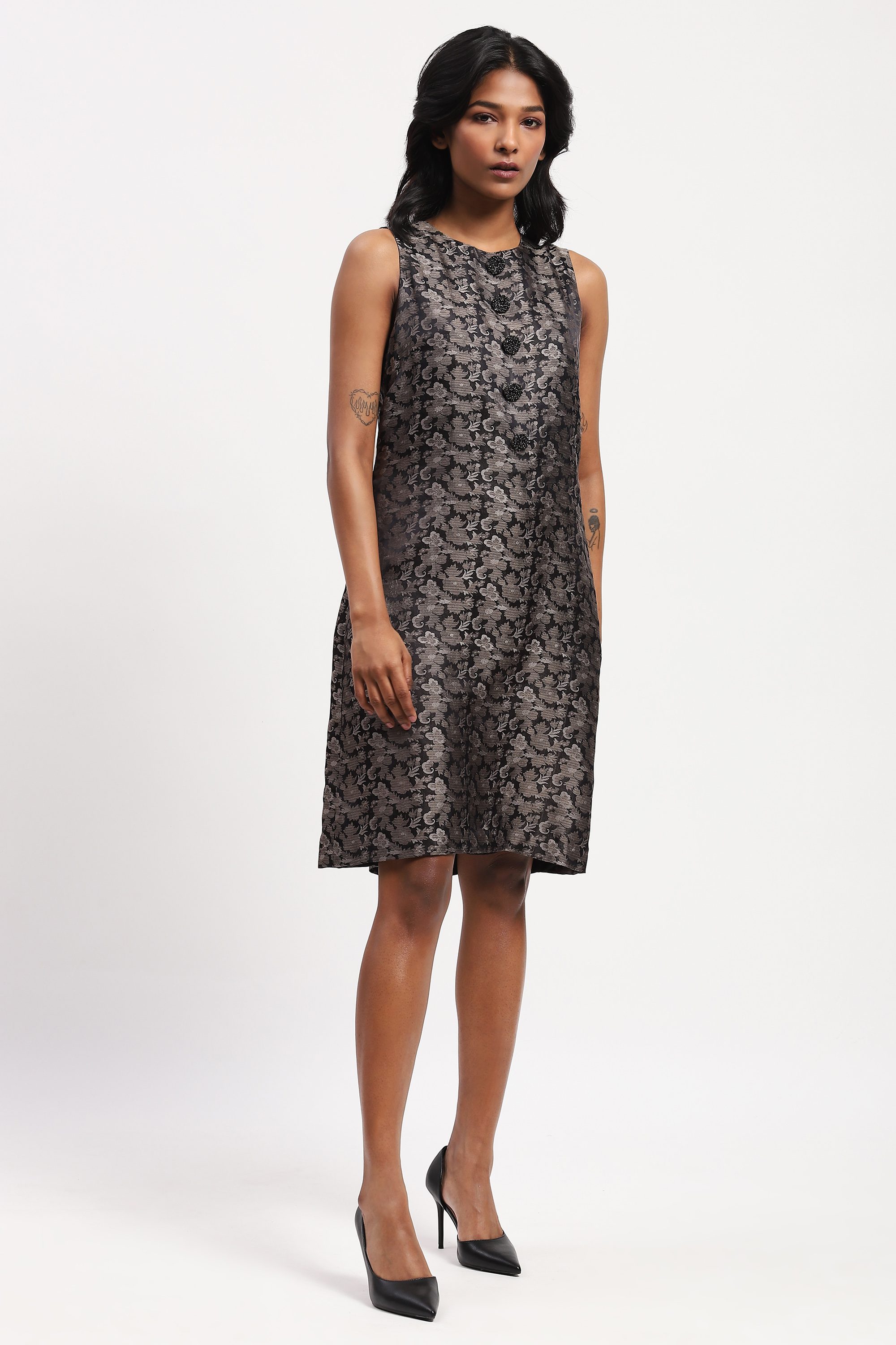 Best paired with an honest song, sung from the heart, this grey dress is crafted in soft and complex tanchoi silk. Its floral motifs are woven into the fabric using a technique similar to brocade.