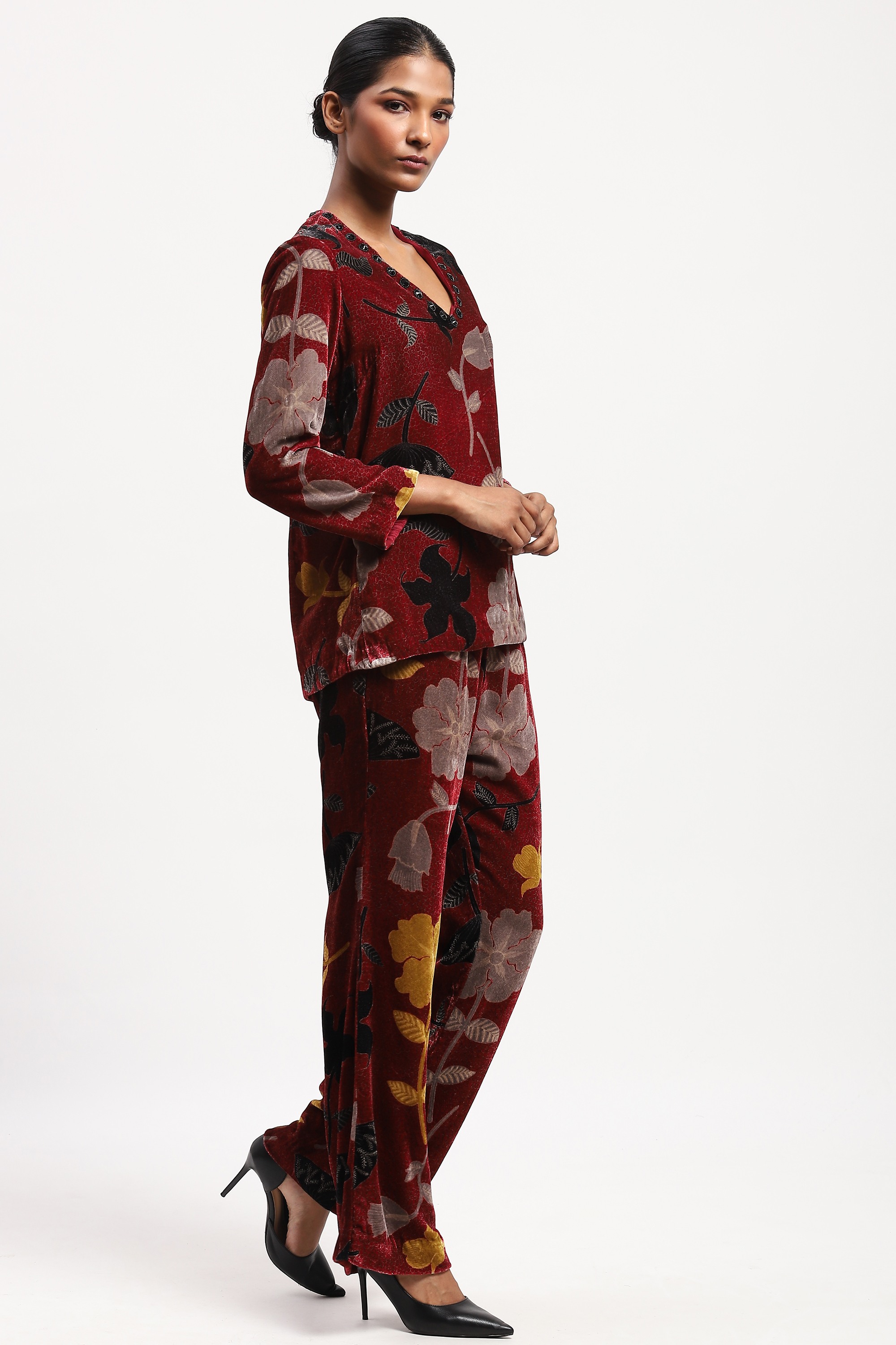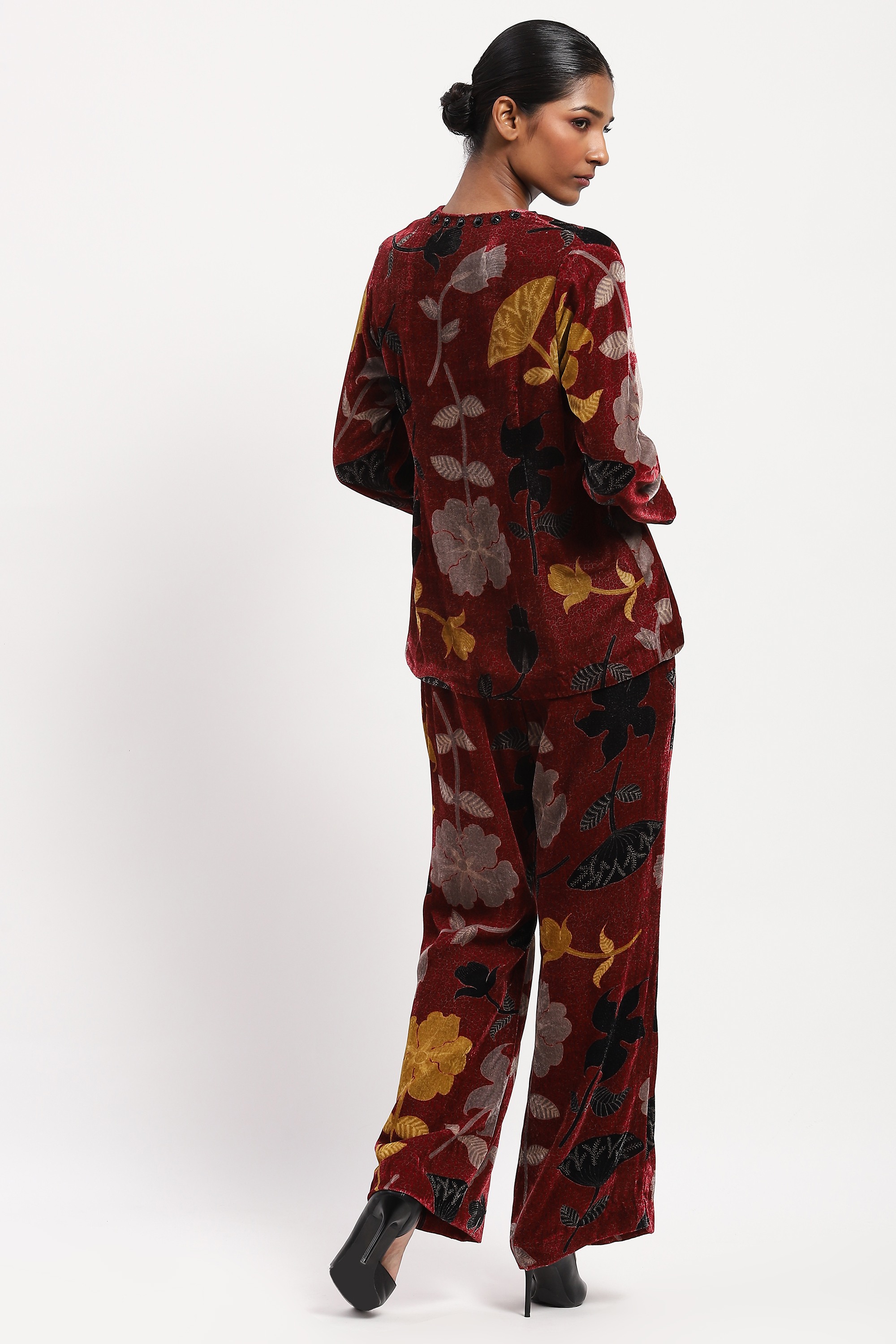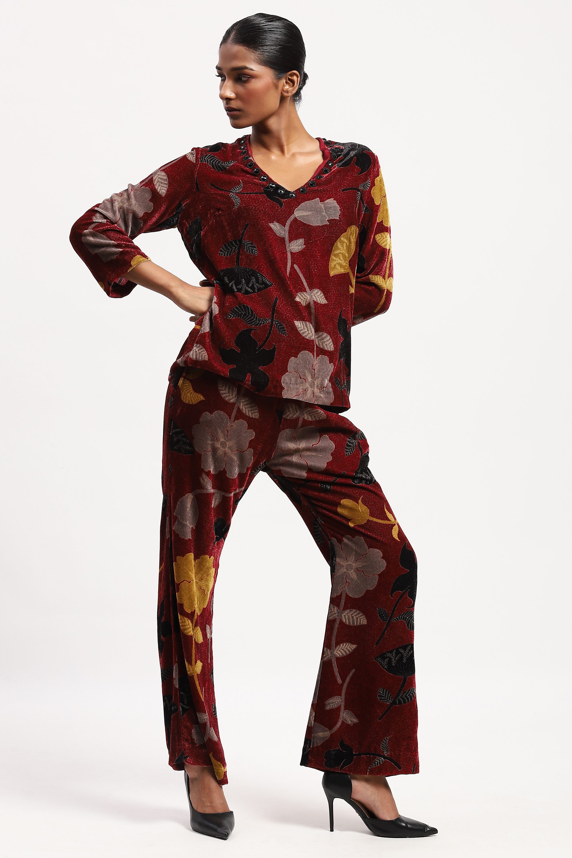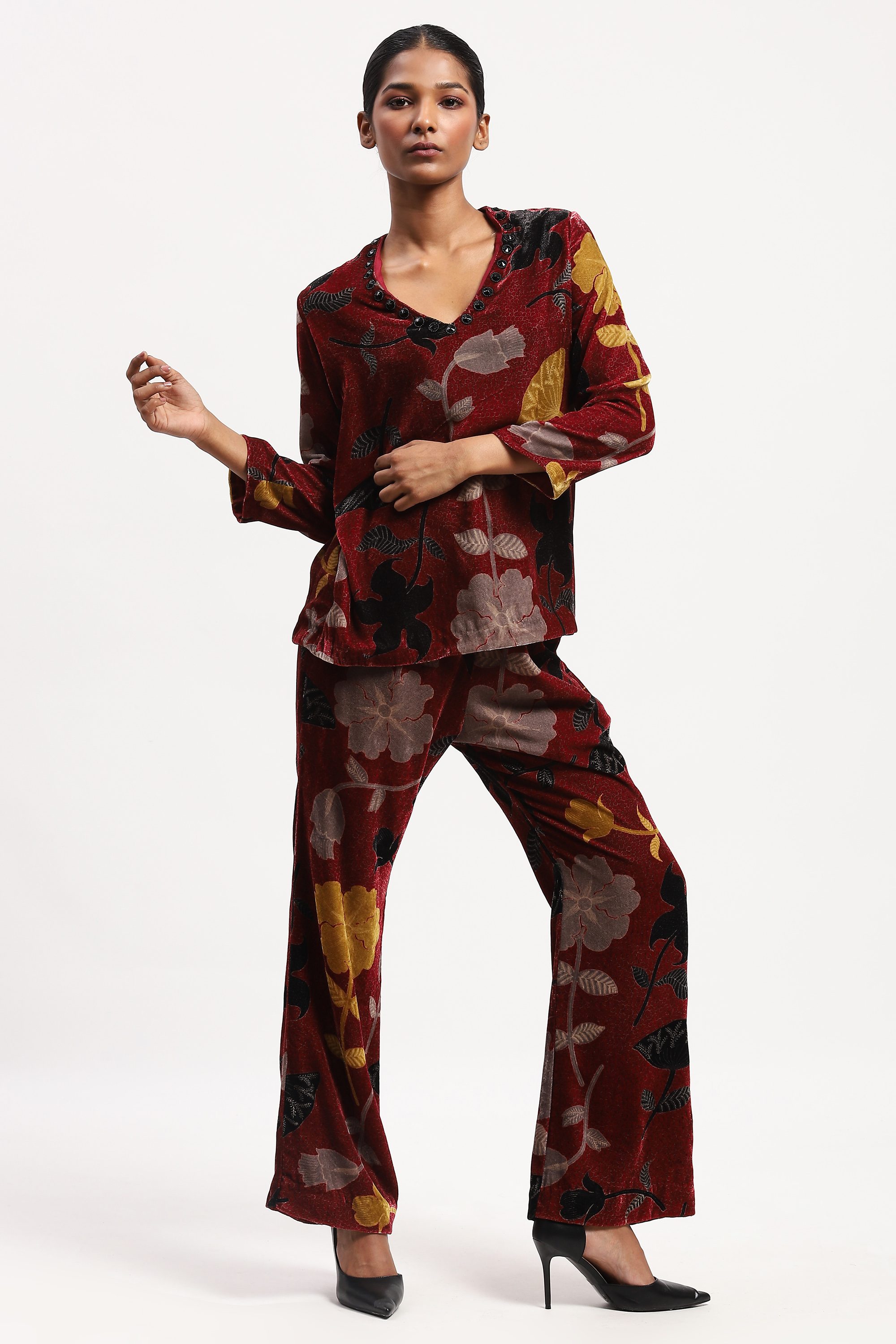 Crafted in velvet, this printed top is adda embroidered with rhinestones and beads.
