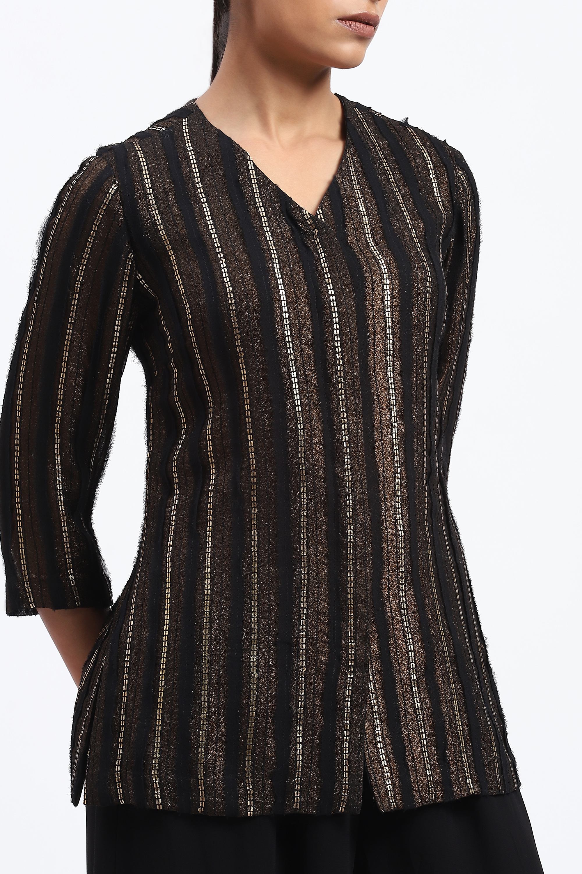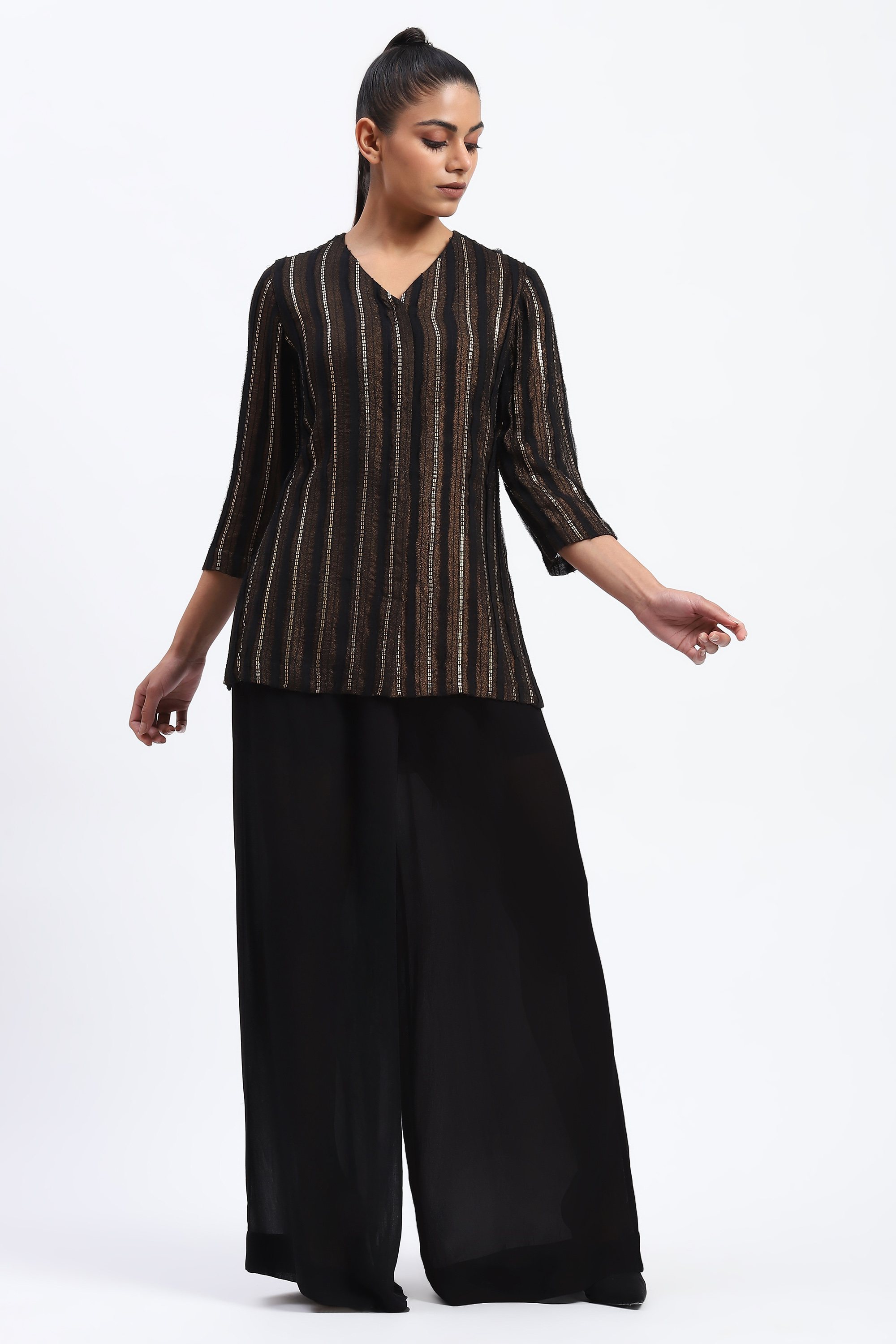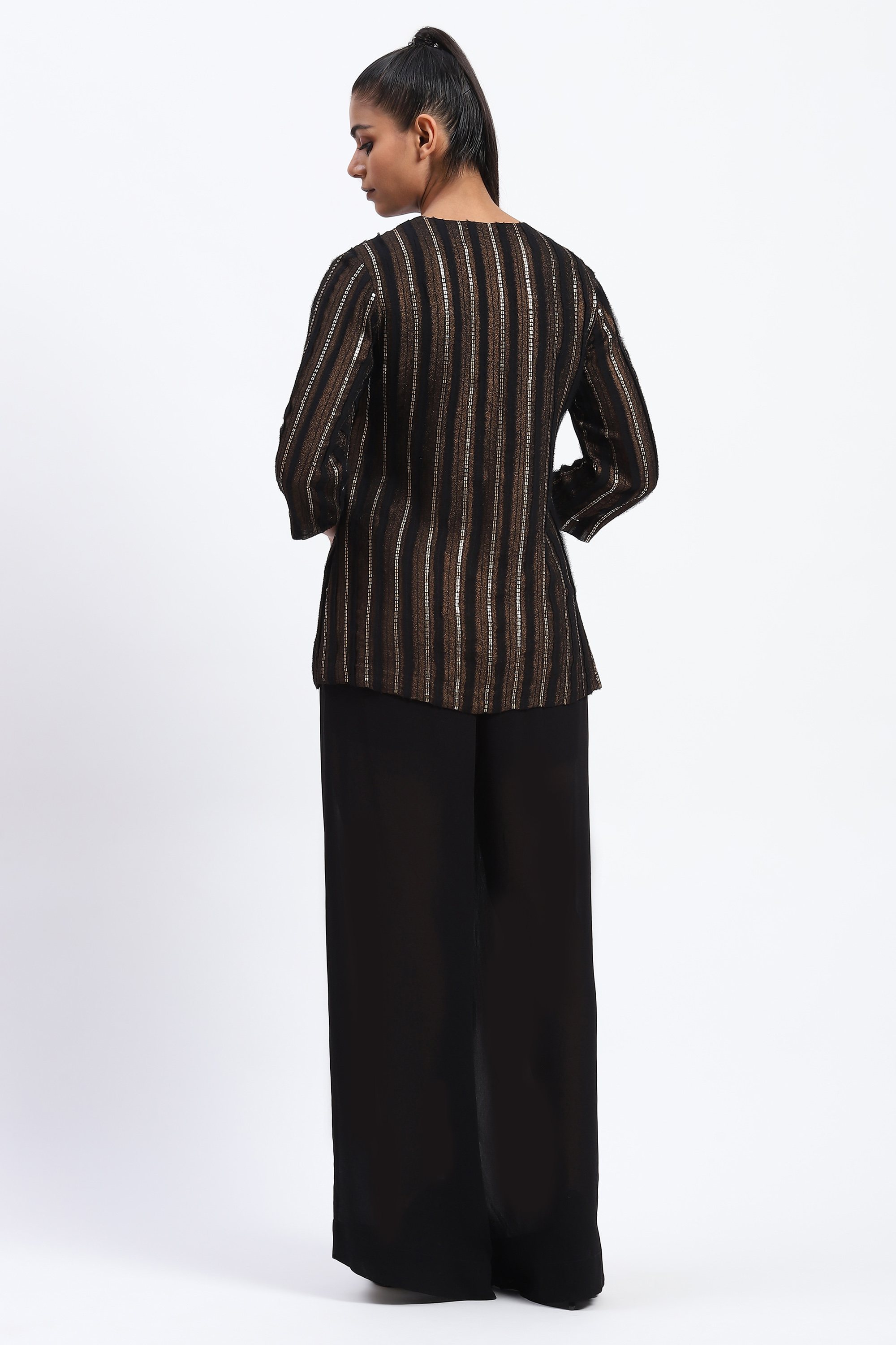 This limited edition piece has been made using a metallic gold printed georgette appliqued with hand cut georgette strips and gold sequins for evening glamour.