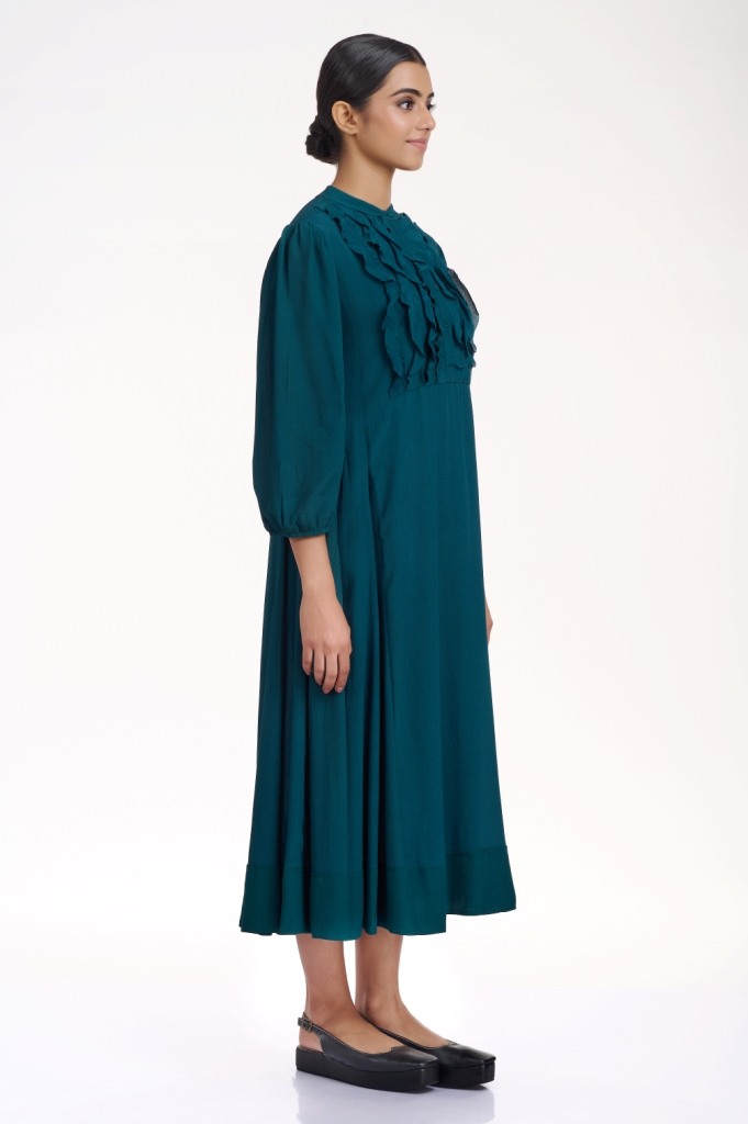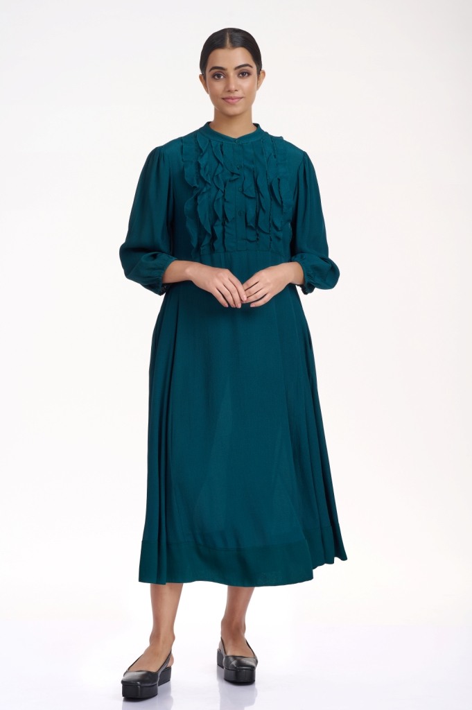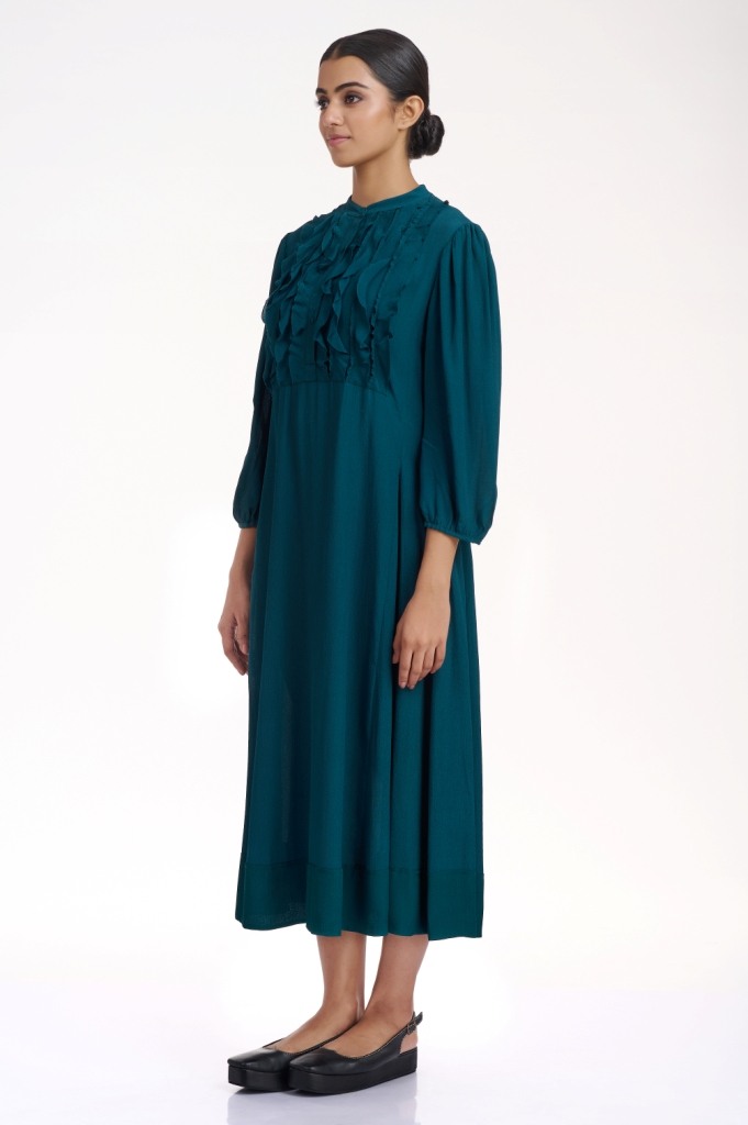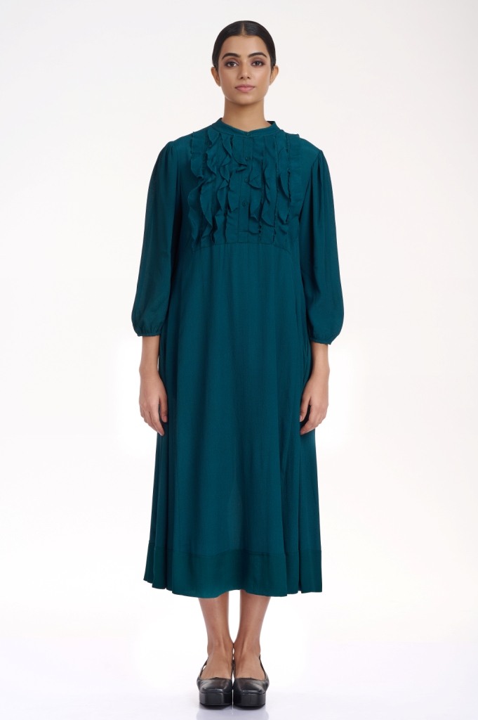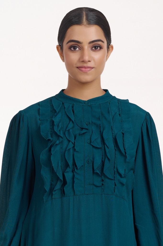 Look effortlessly elegant in a flowing silhoutte, cut from fluid crepe in forest green, detailed with self colour raw edge frills on the yoke. It has pockets in the side seams.