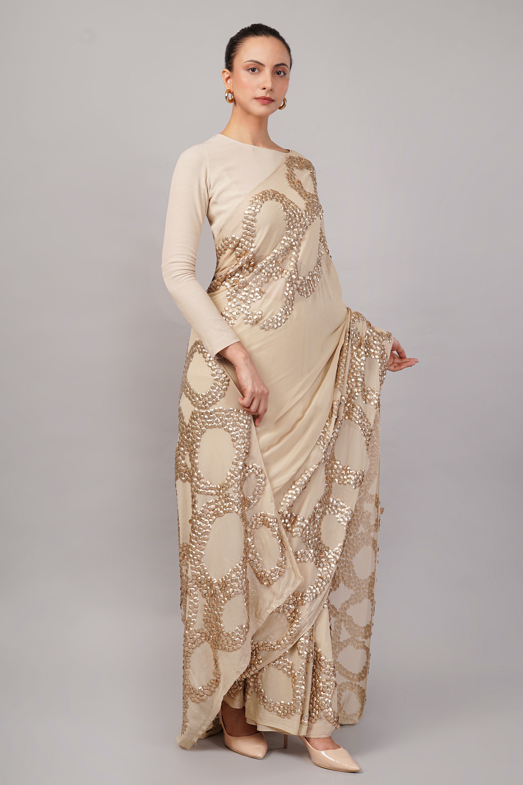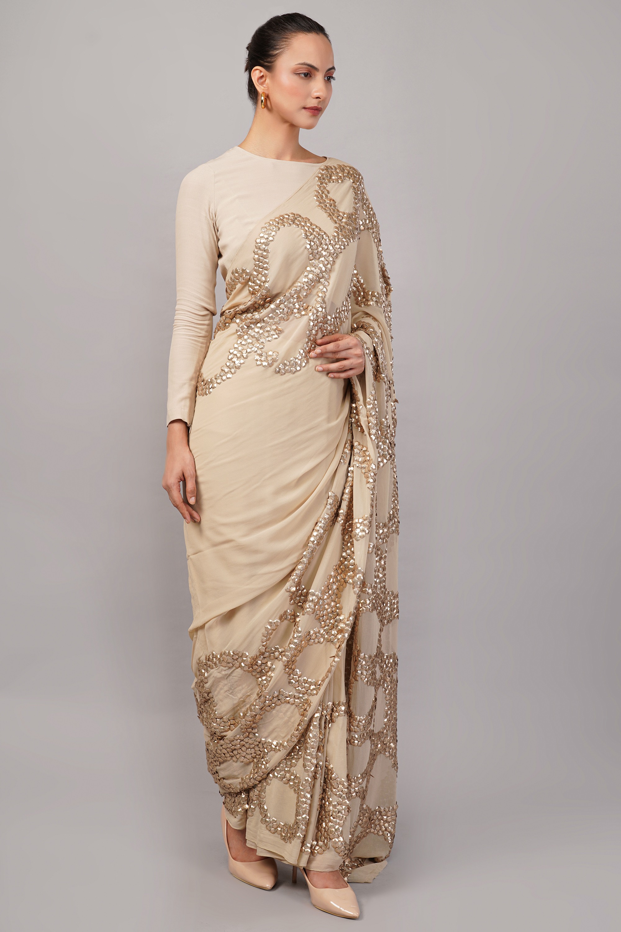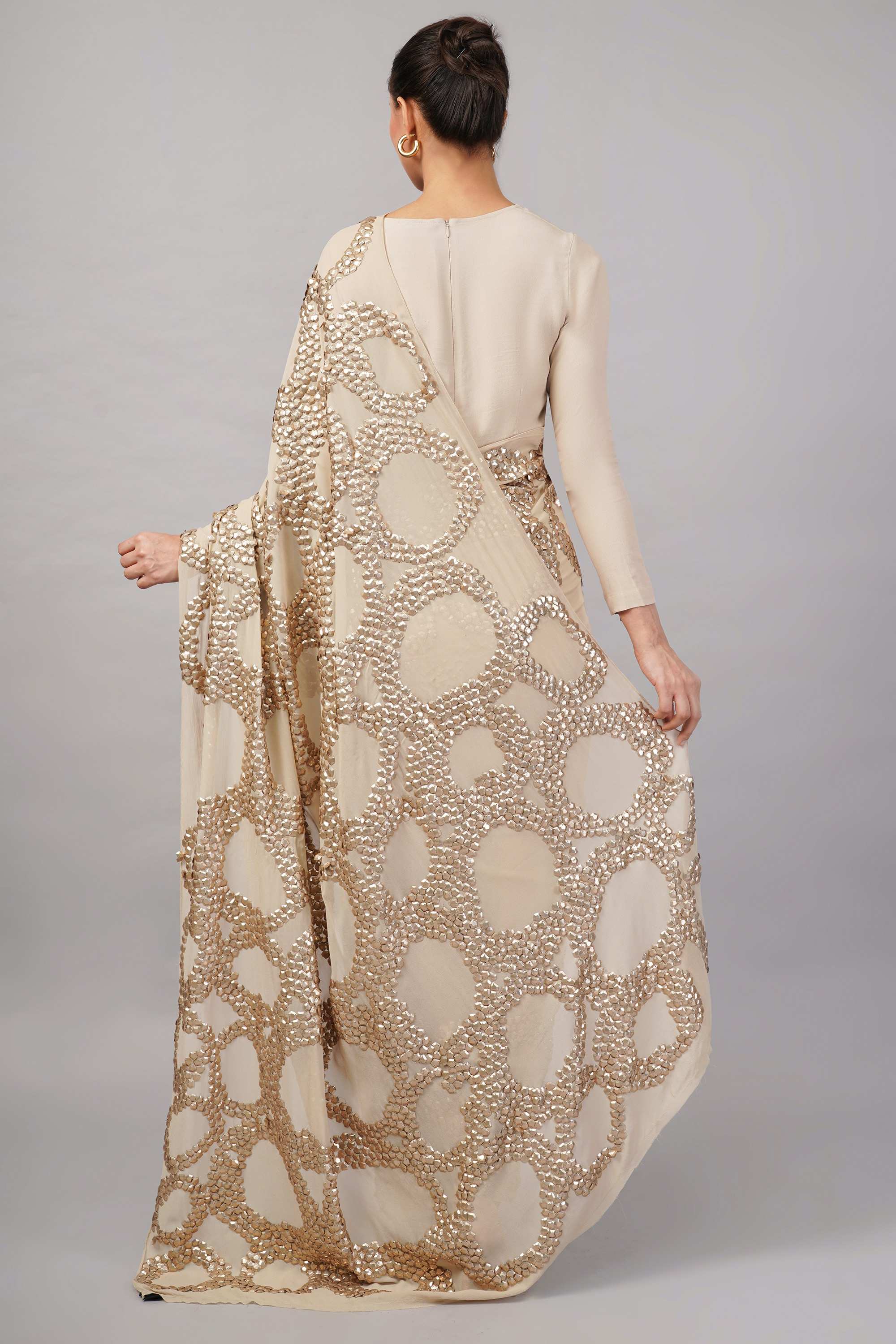 This limited edition saree has been made using organza fabric which has been hand embroidered with metallic sequins in an all over ring pateern. A must for evening glamour.