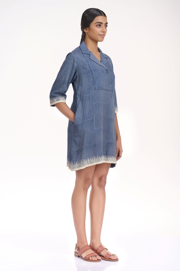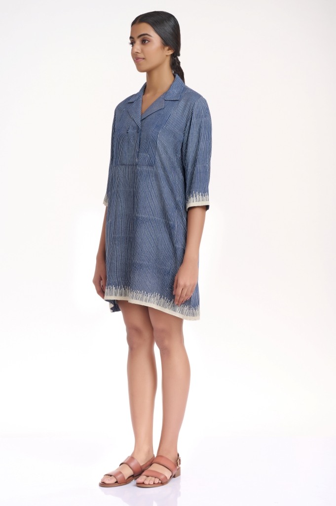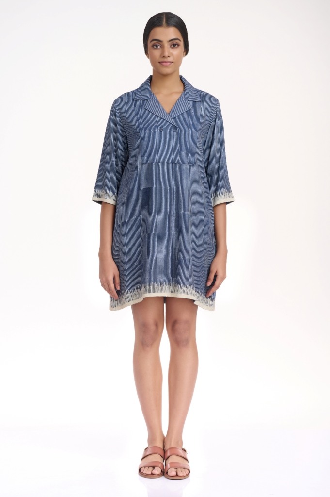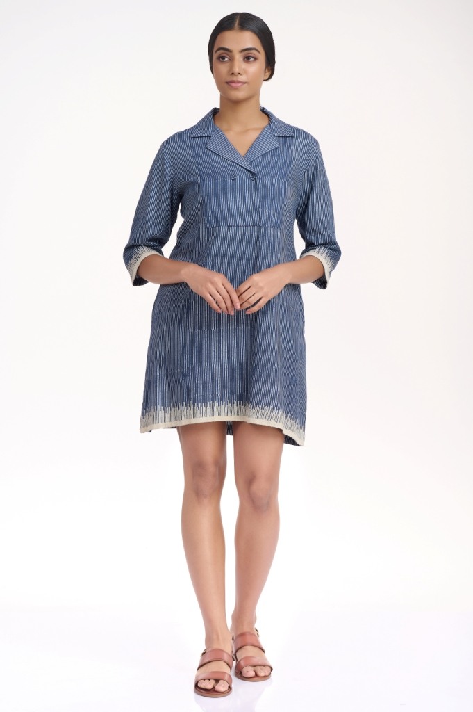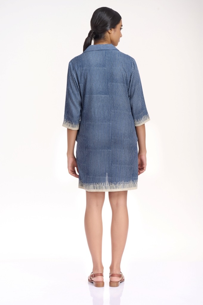 Suited for everyday this casual shirt dress in indigo, delicately embroidered allover geometric pattern, crafted from cellulose sustainable fabric with fine printed lines. Detailed with fabric buttons and a front opening. Added pockets in the side seams. An easy look for the day at work or a business meeting. Could wear yours as a dress and knee length boots or team it with cropped pants with flat sandals.