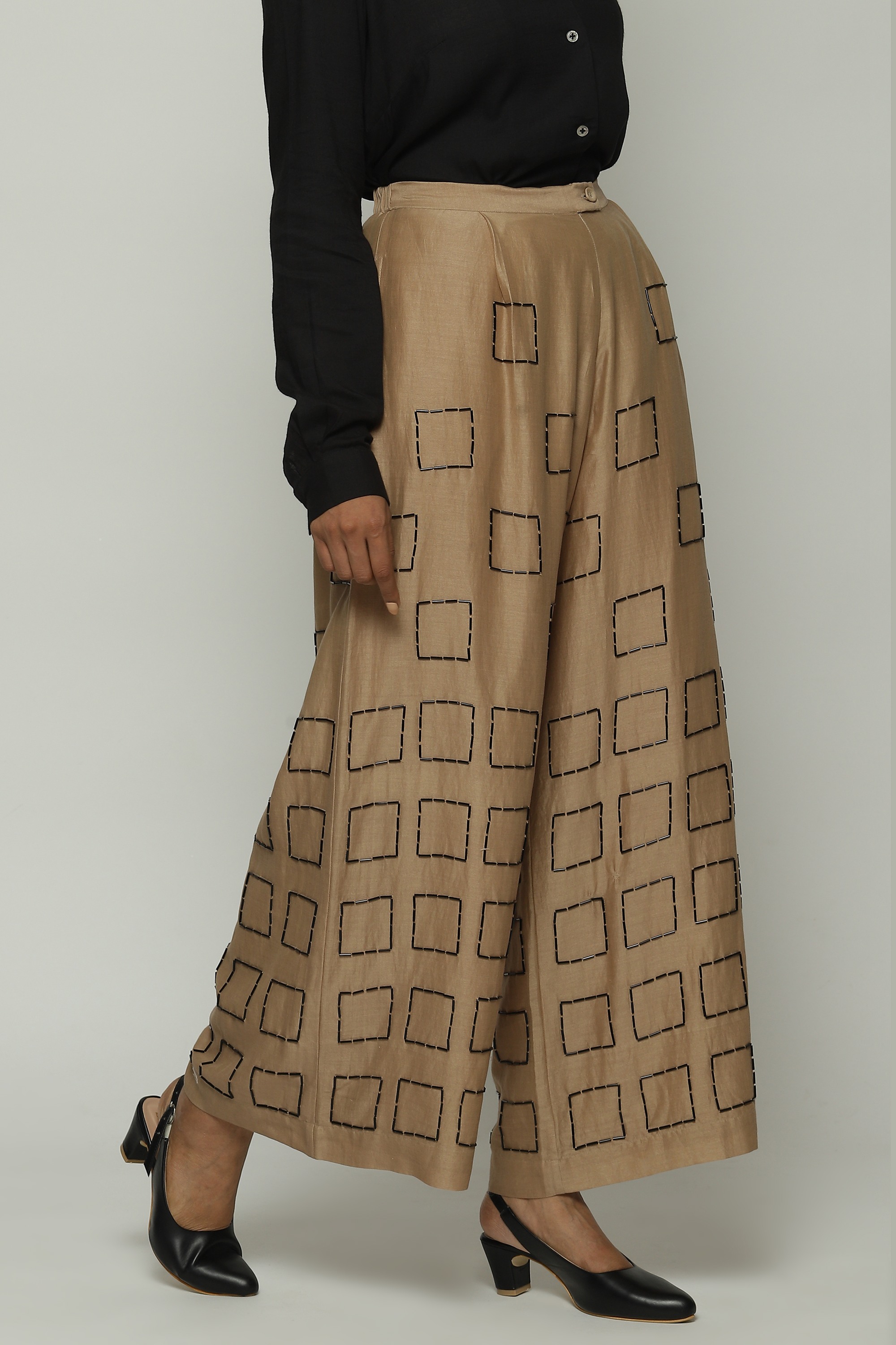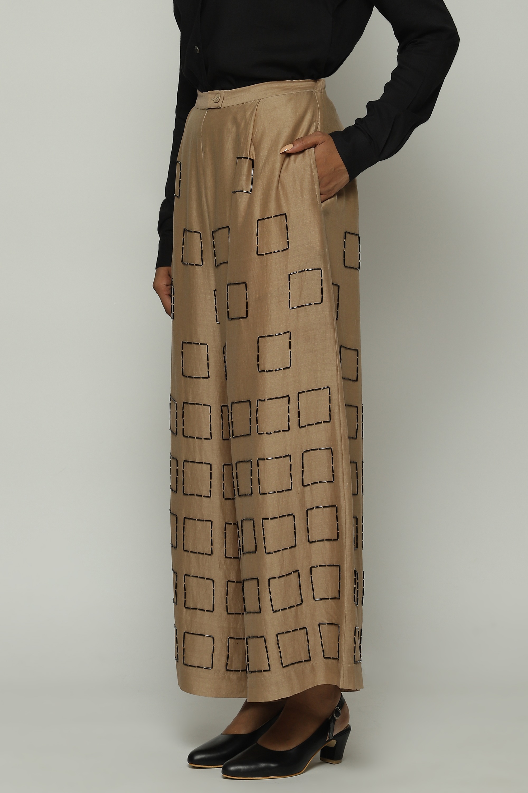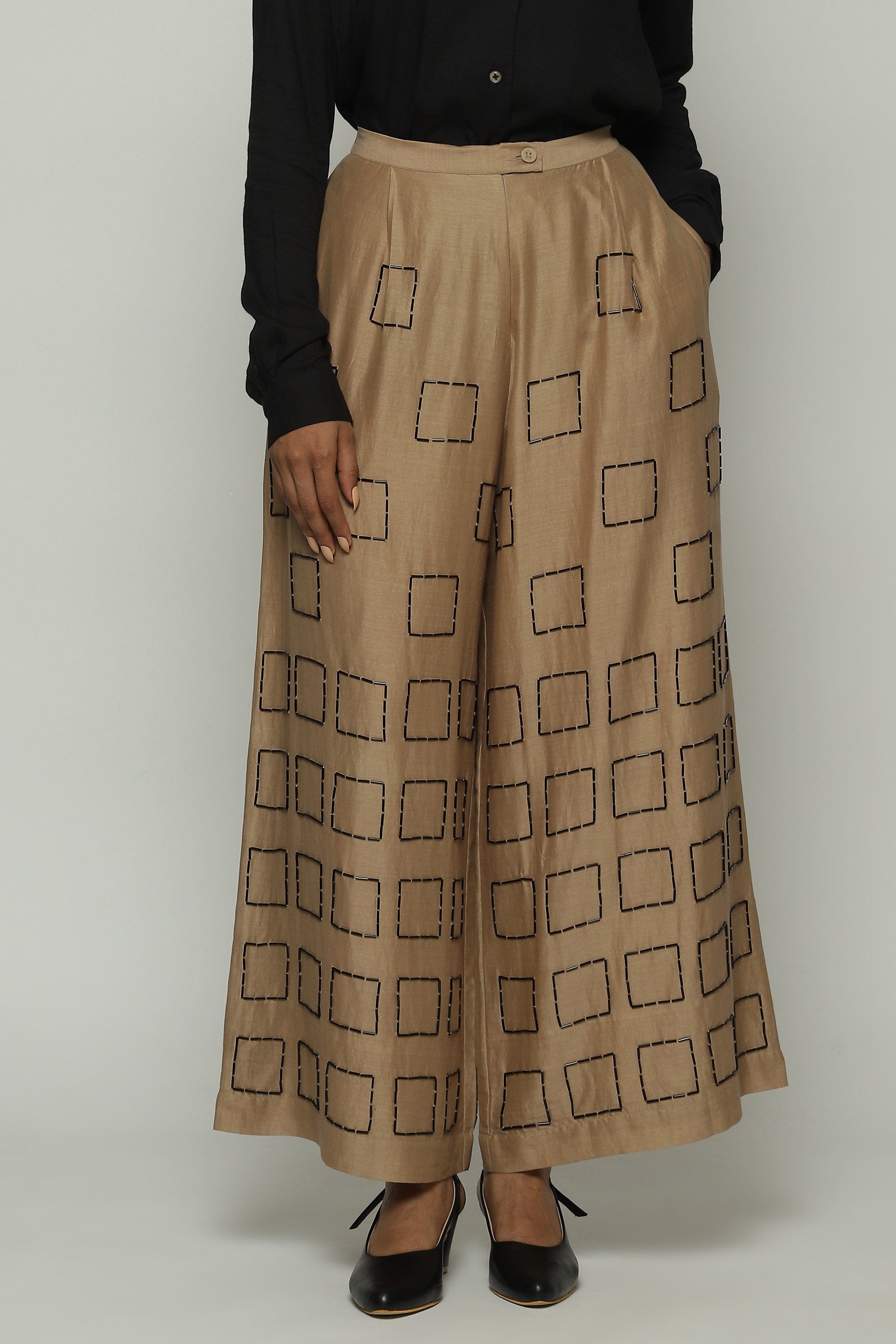 Geometric square embroidery lends structure to this pair of biscuit-brown palazzos.