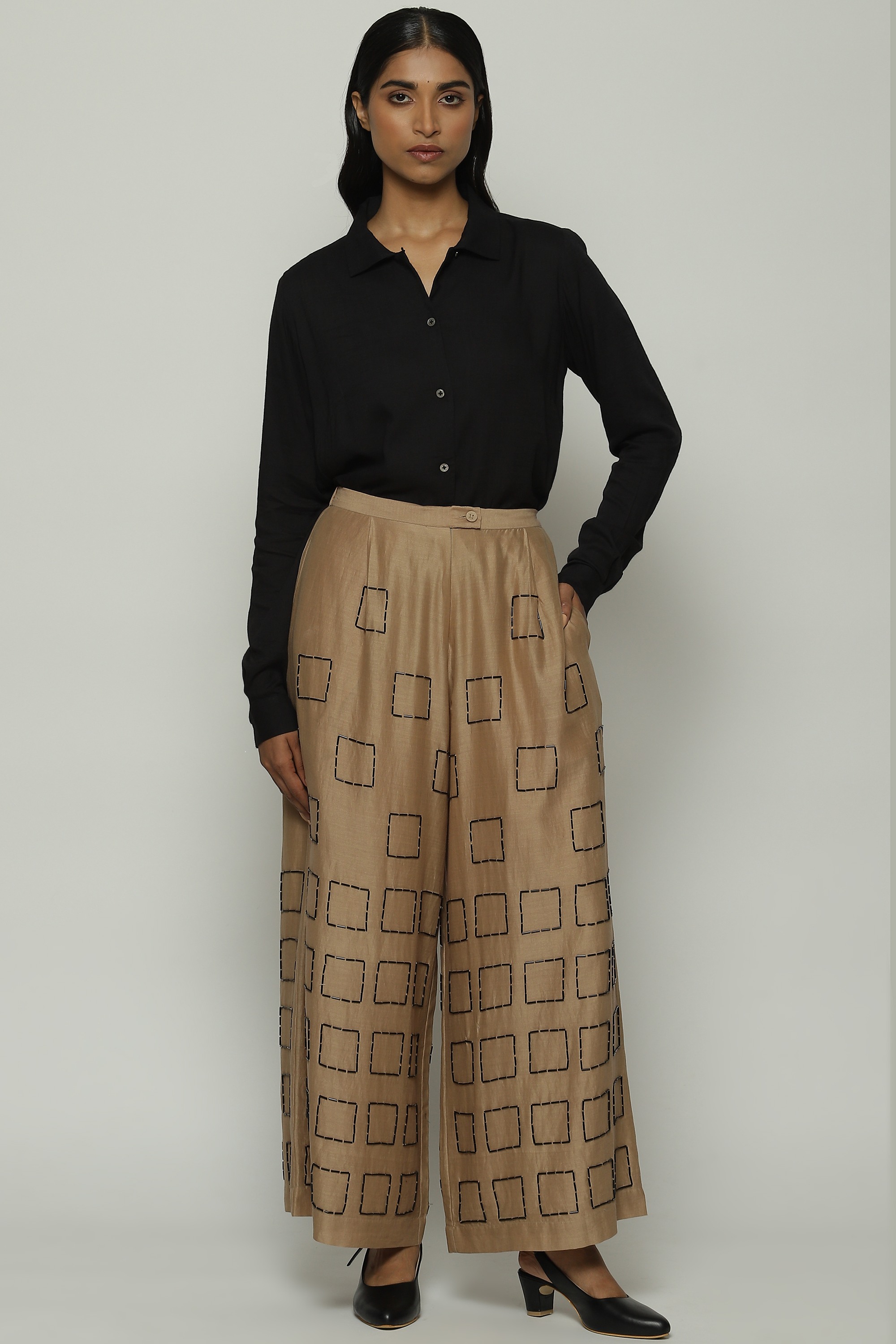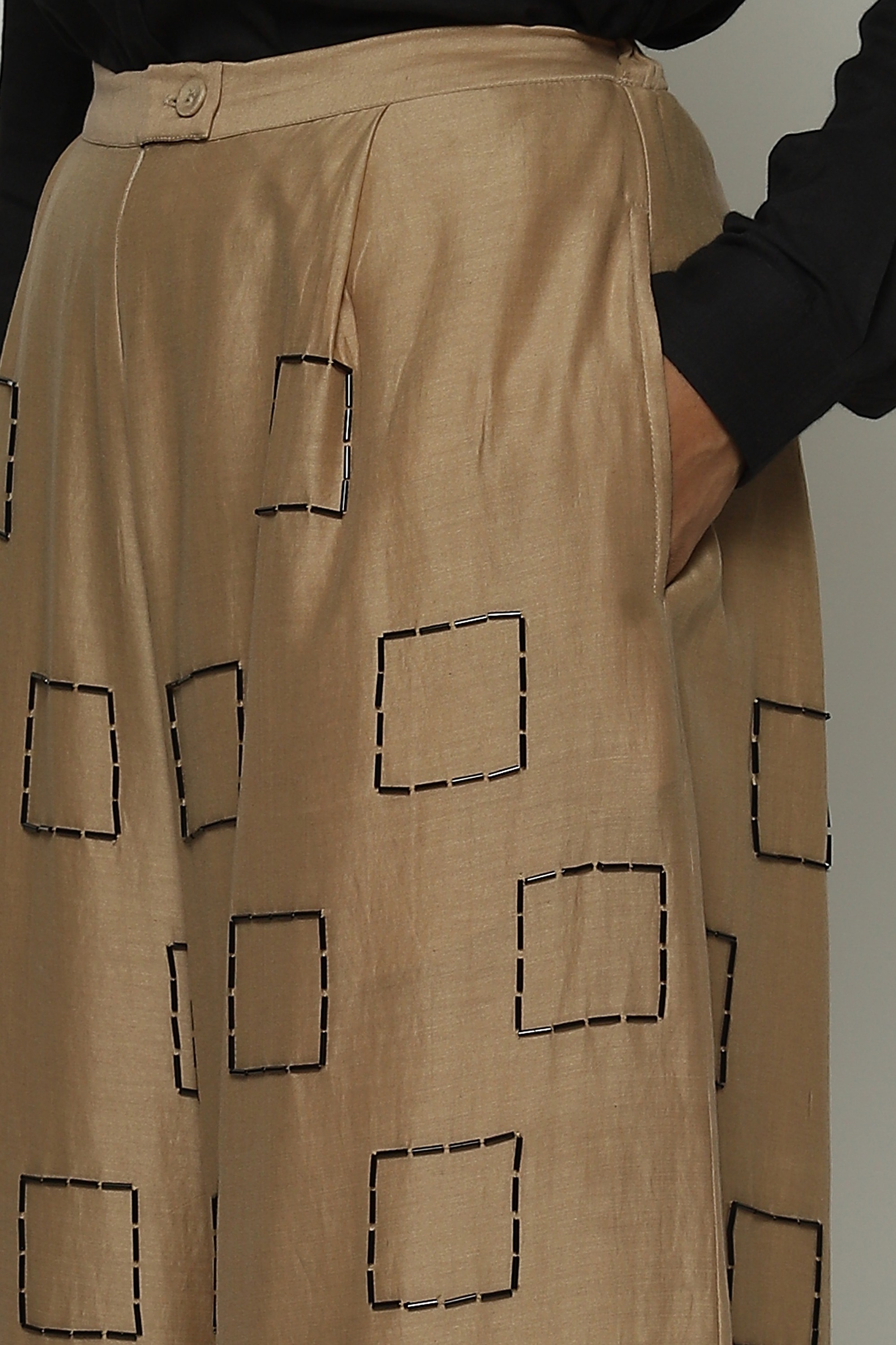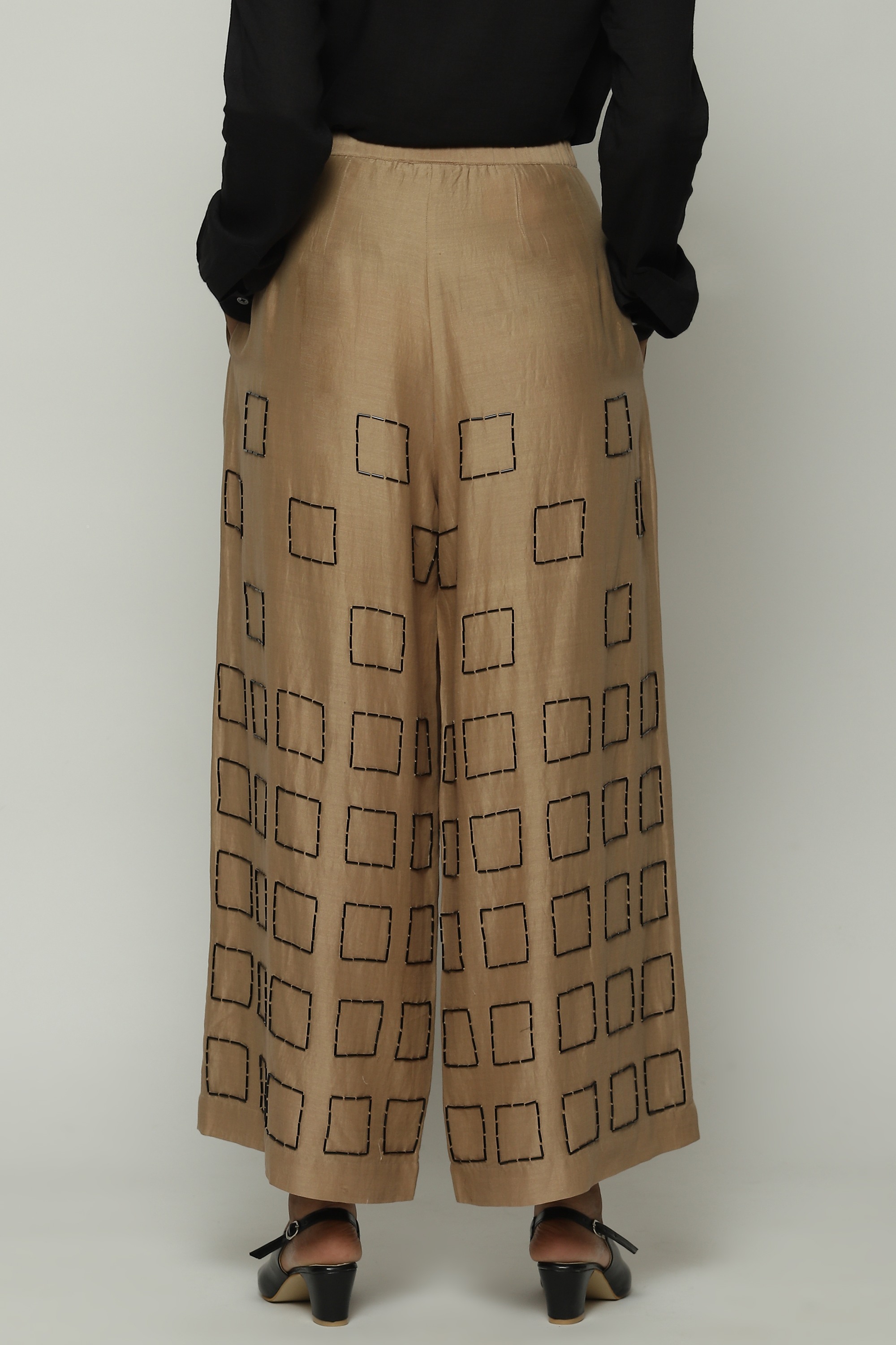Geometric square embroidery lends structure to this pair of biscuit-brown palazzos.