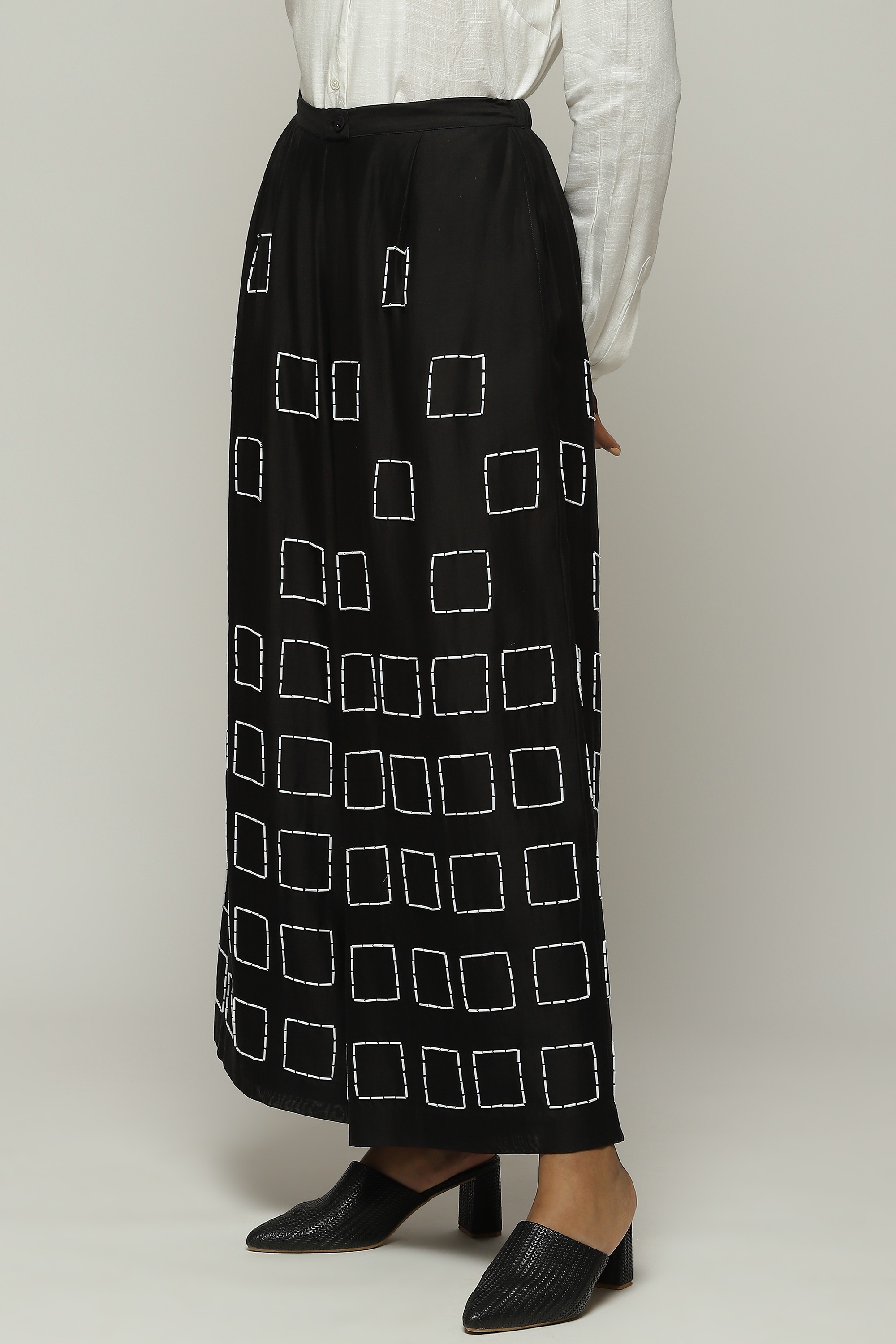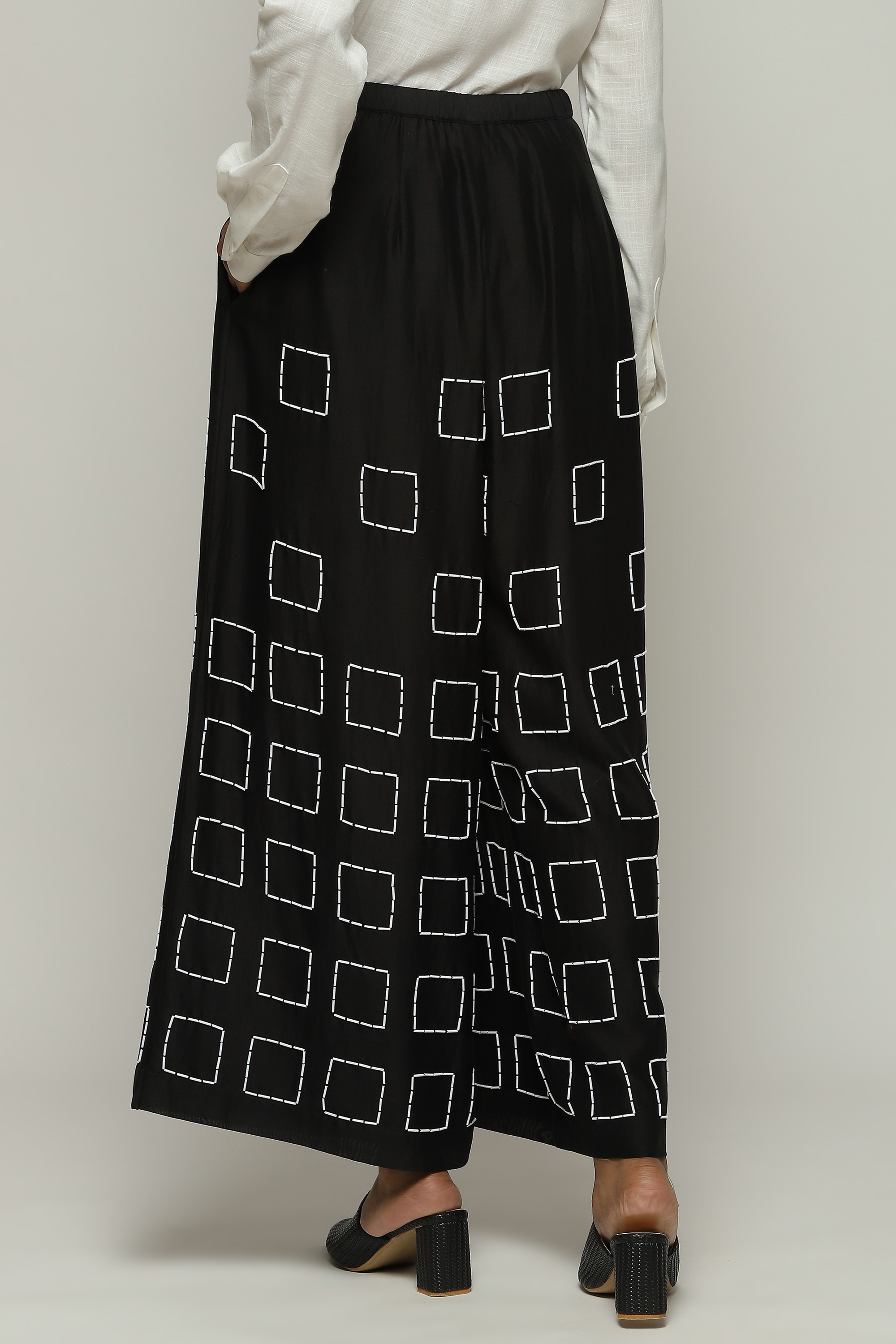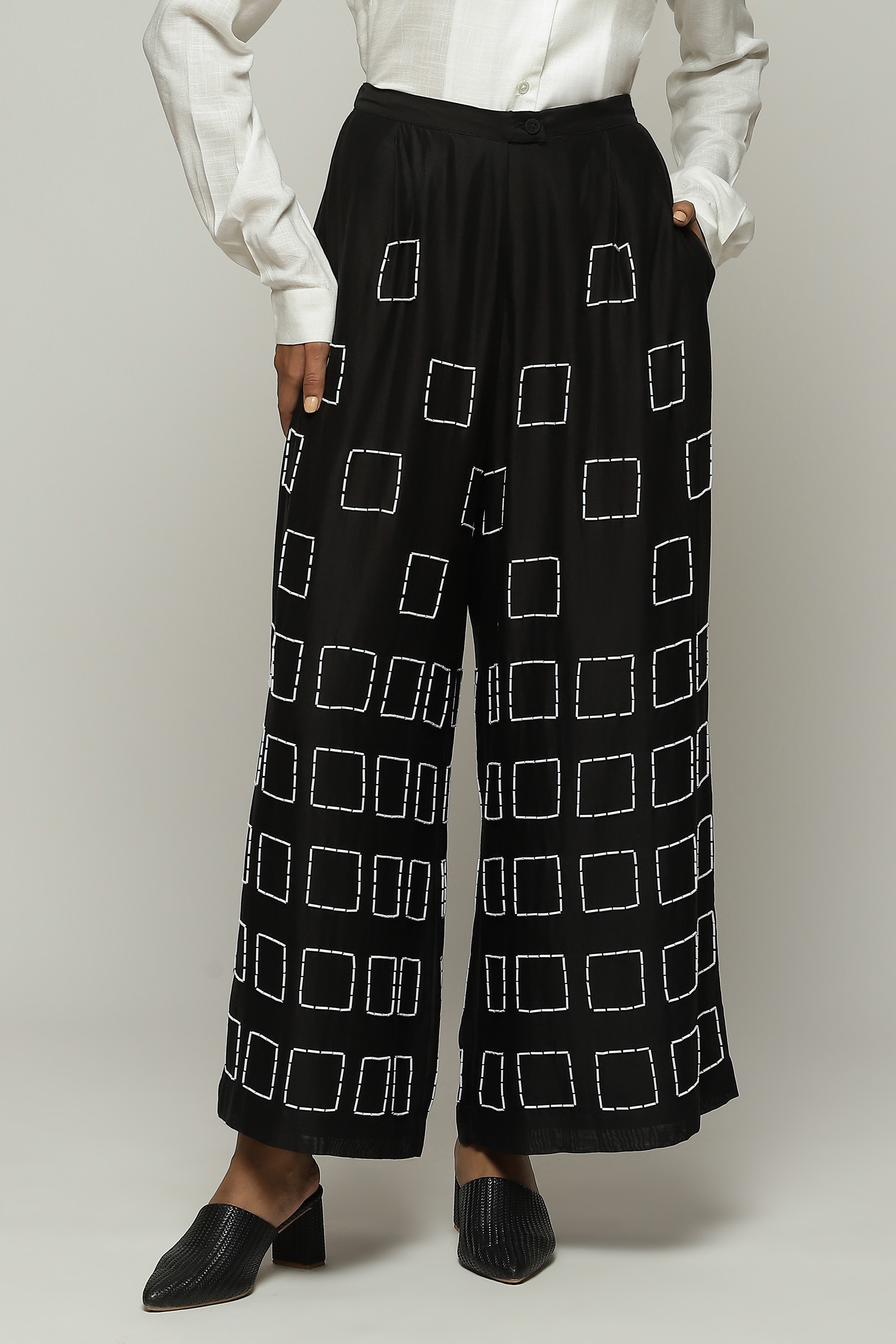 Geometric square embroidery lends structure to this pair of black palazzos.