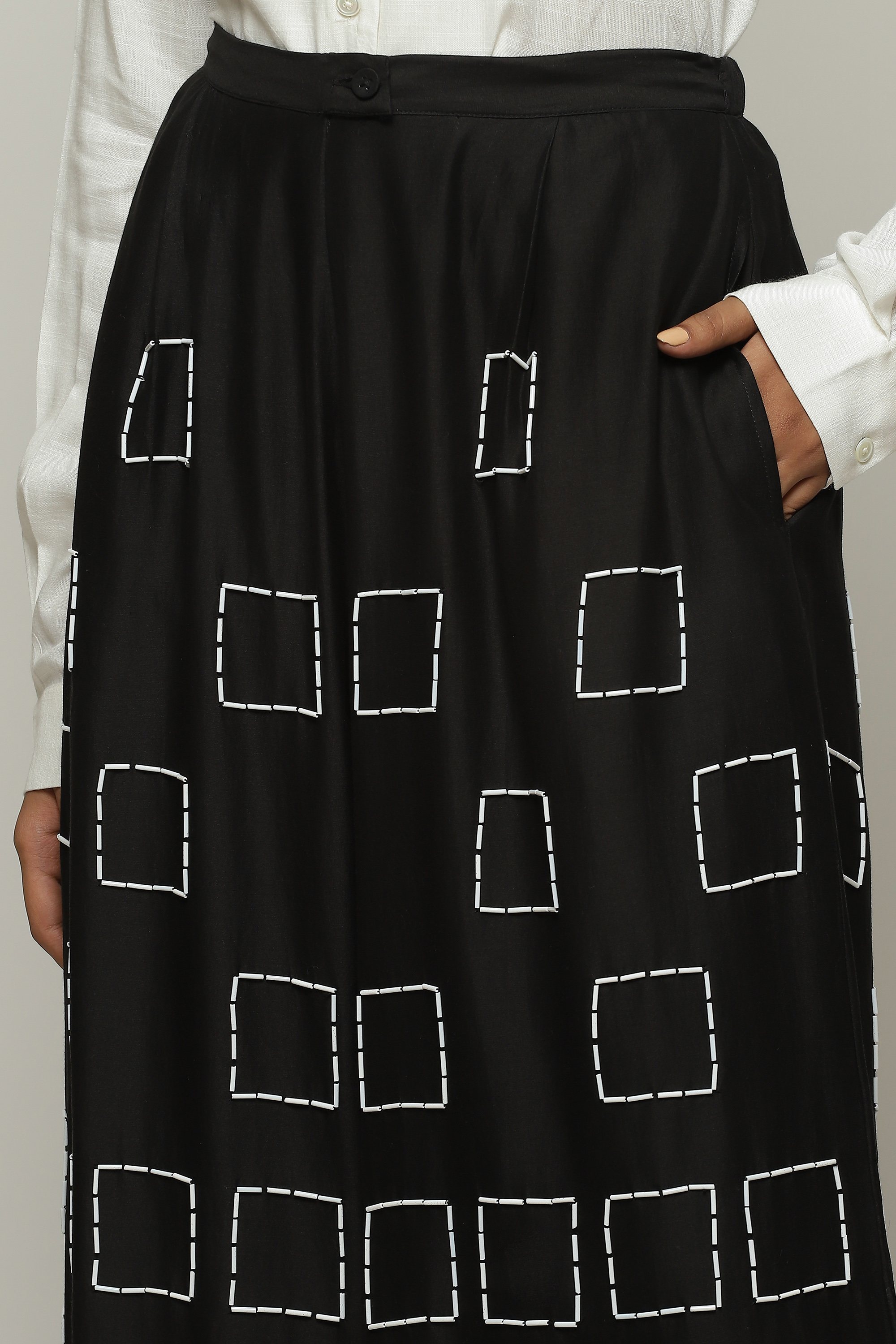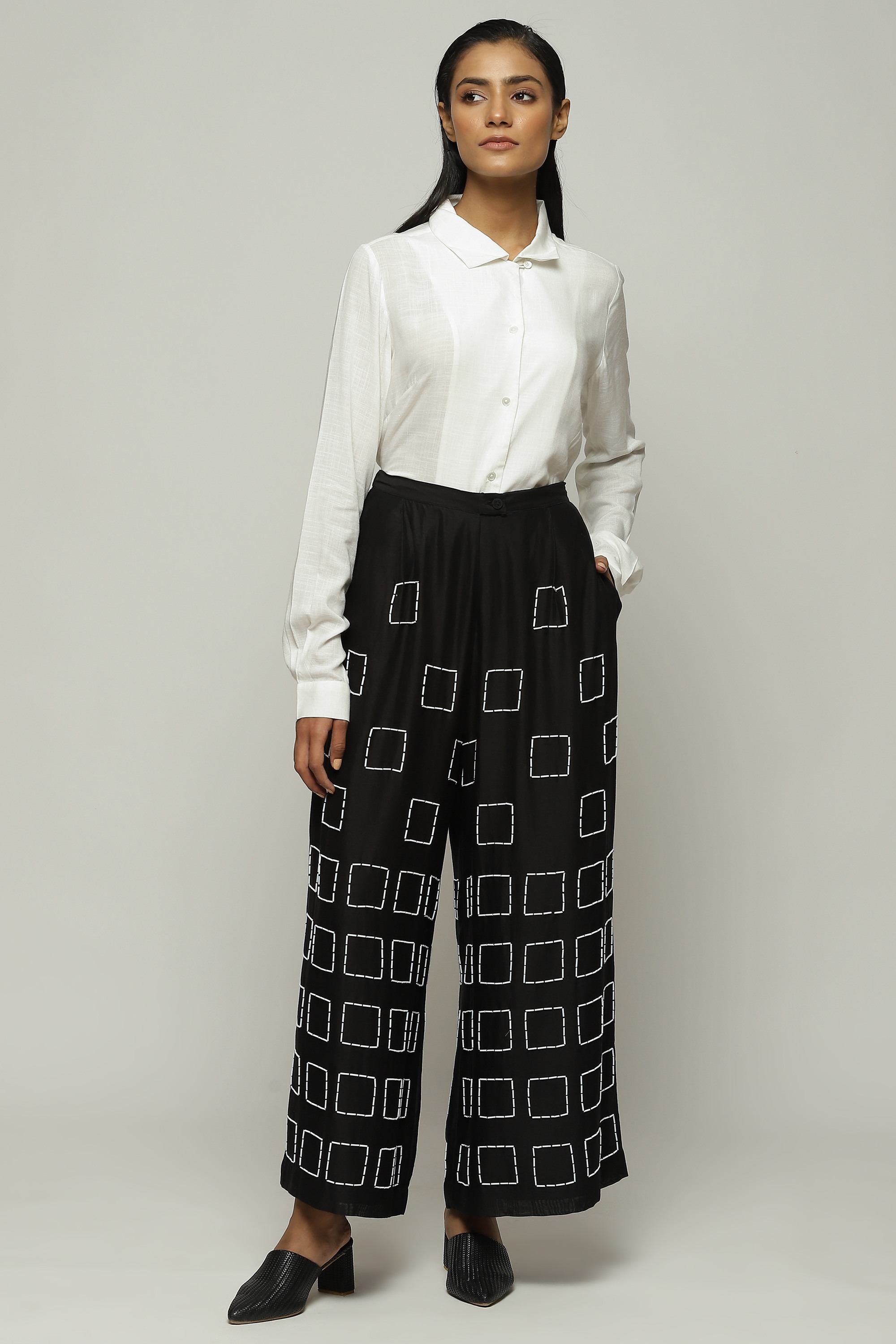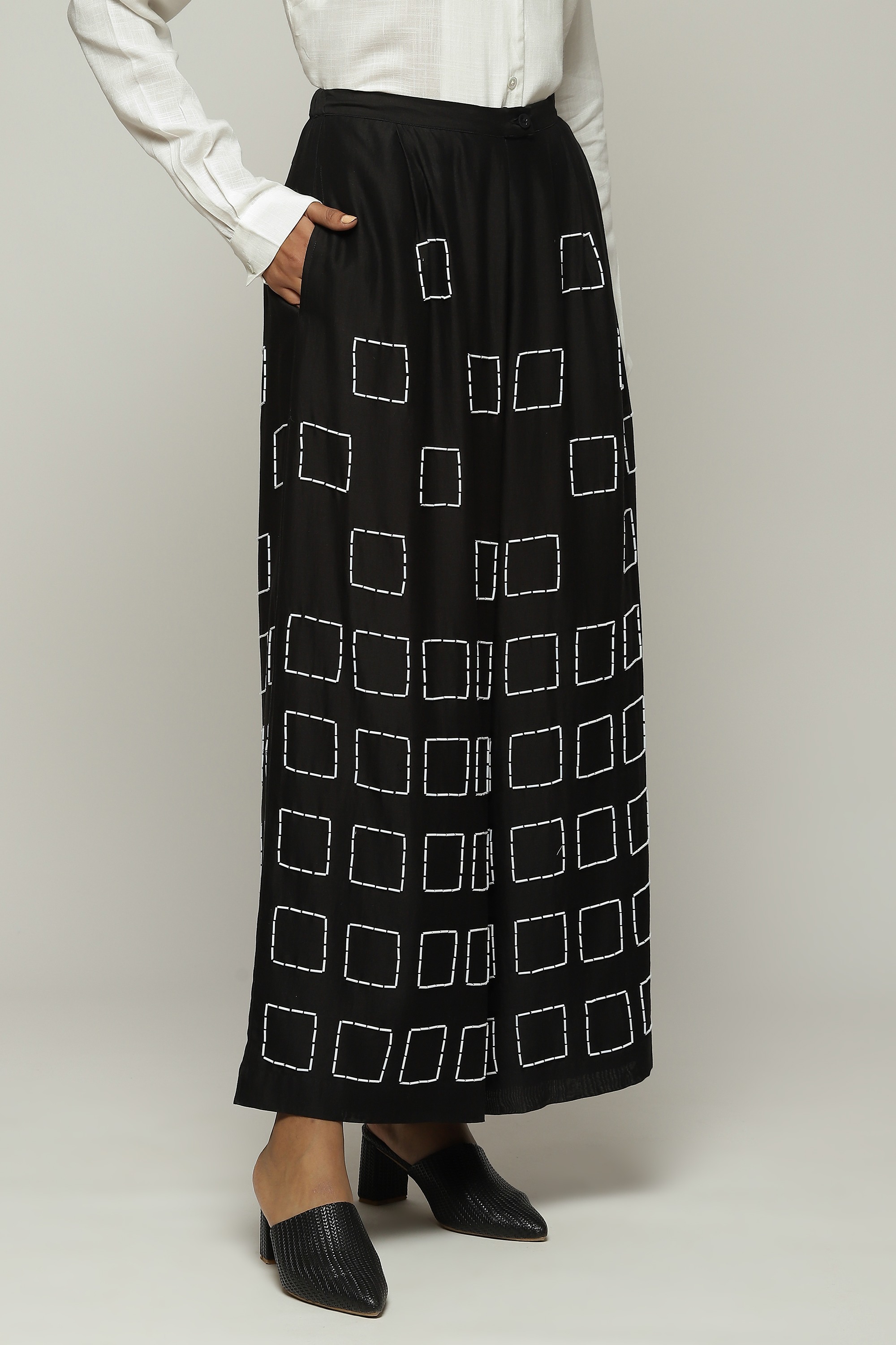 Geometric square embroidery lends structure to this pair of black palazzos.