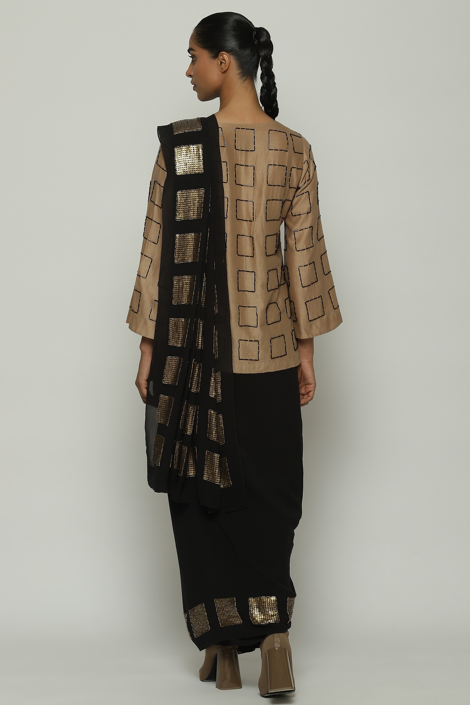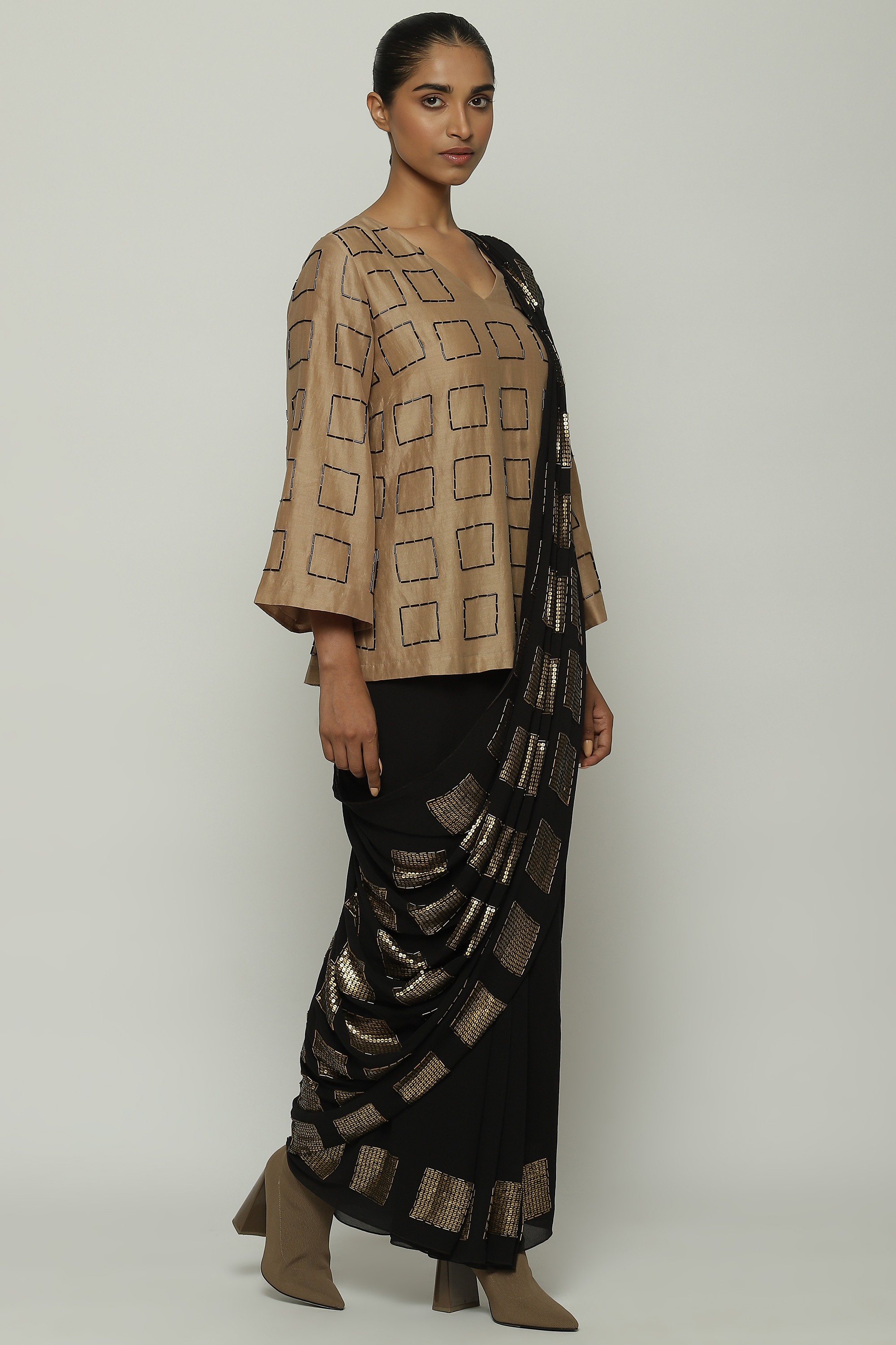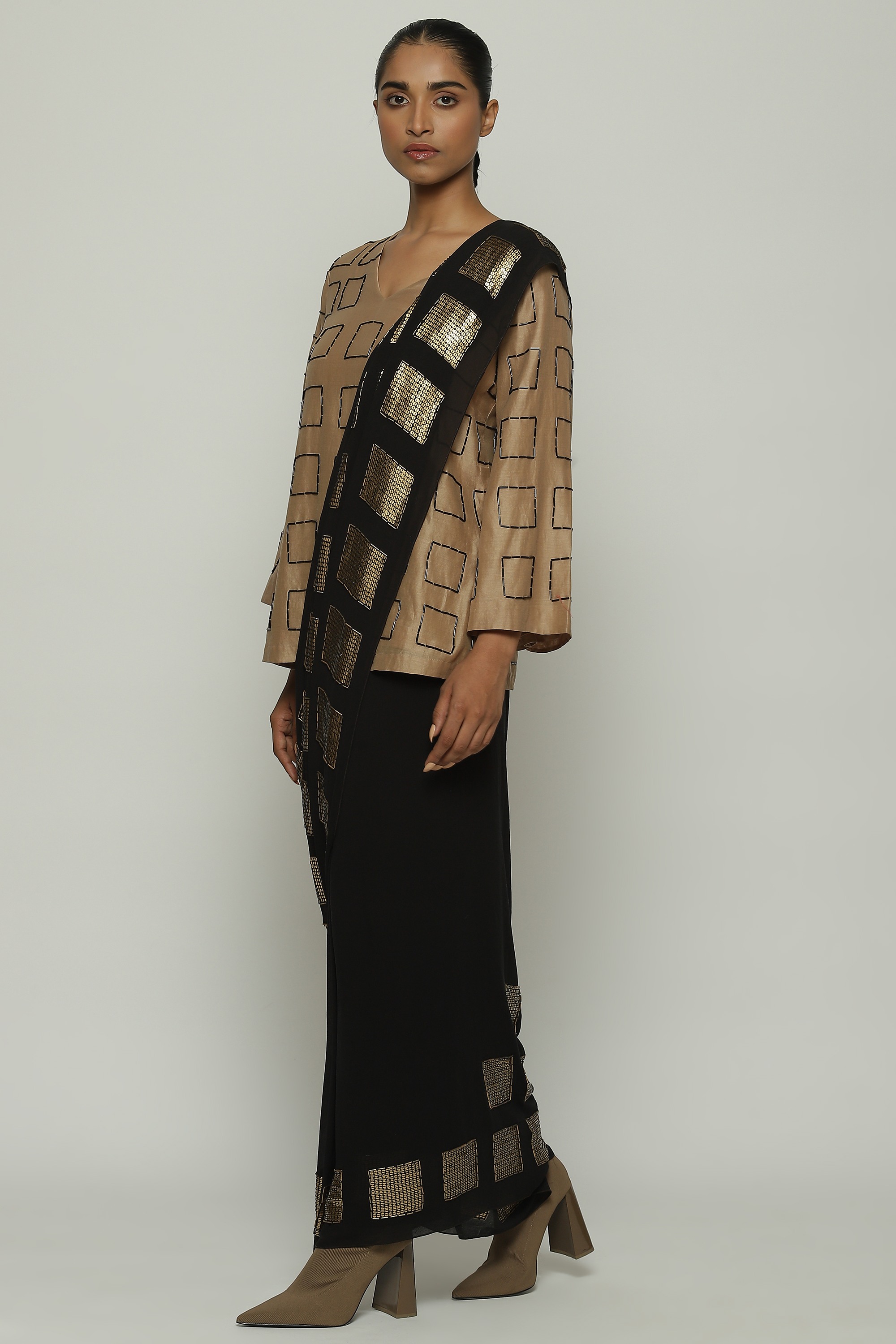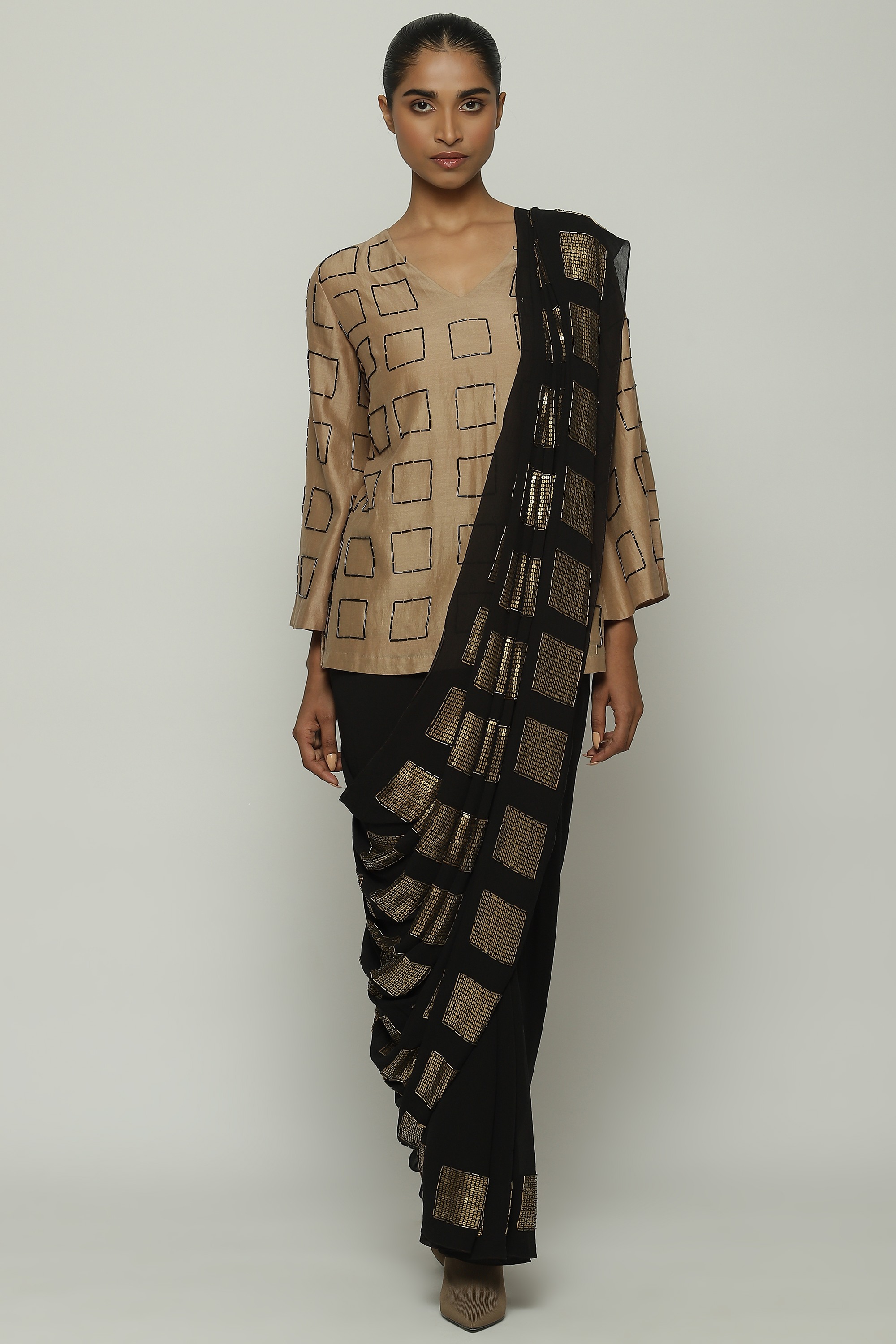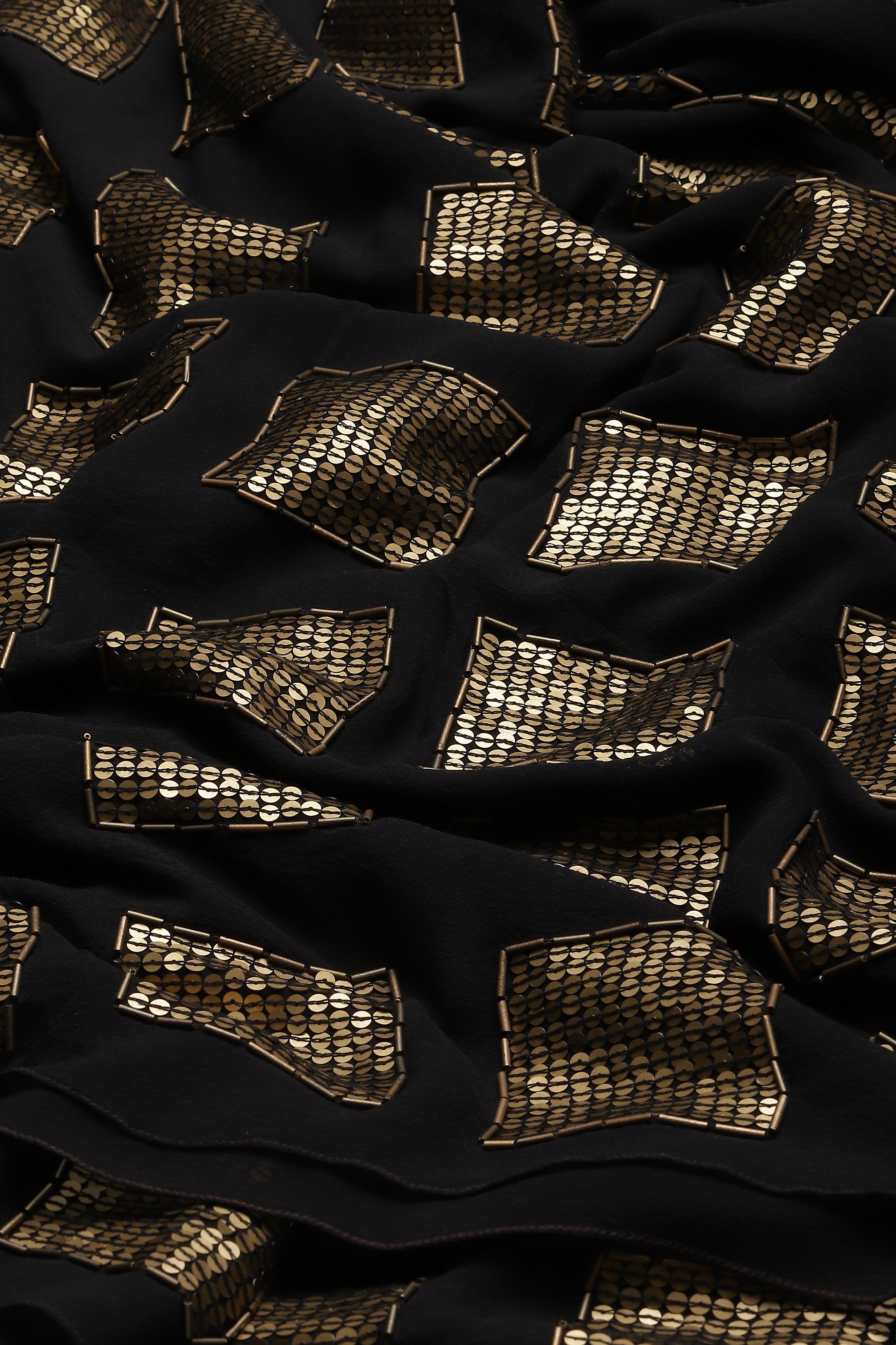 A geometric saree in black, embroidered with squares of gold.