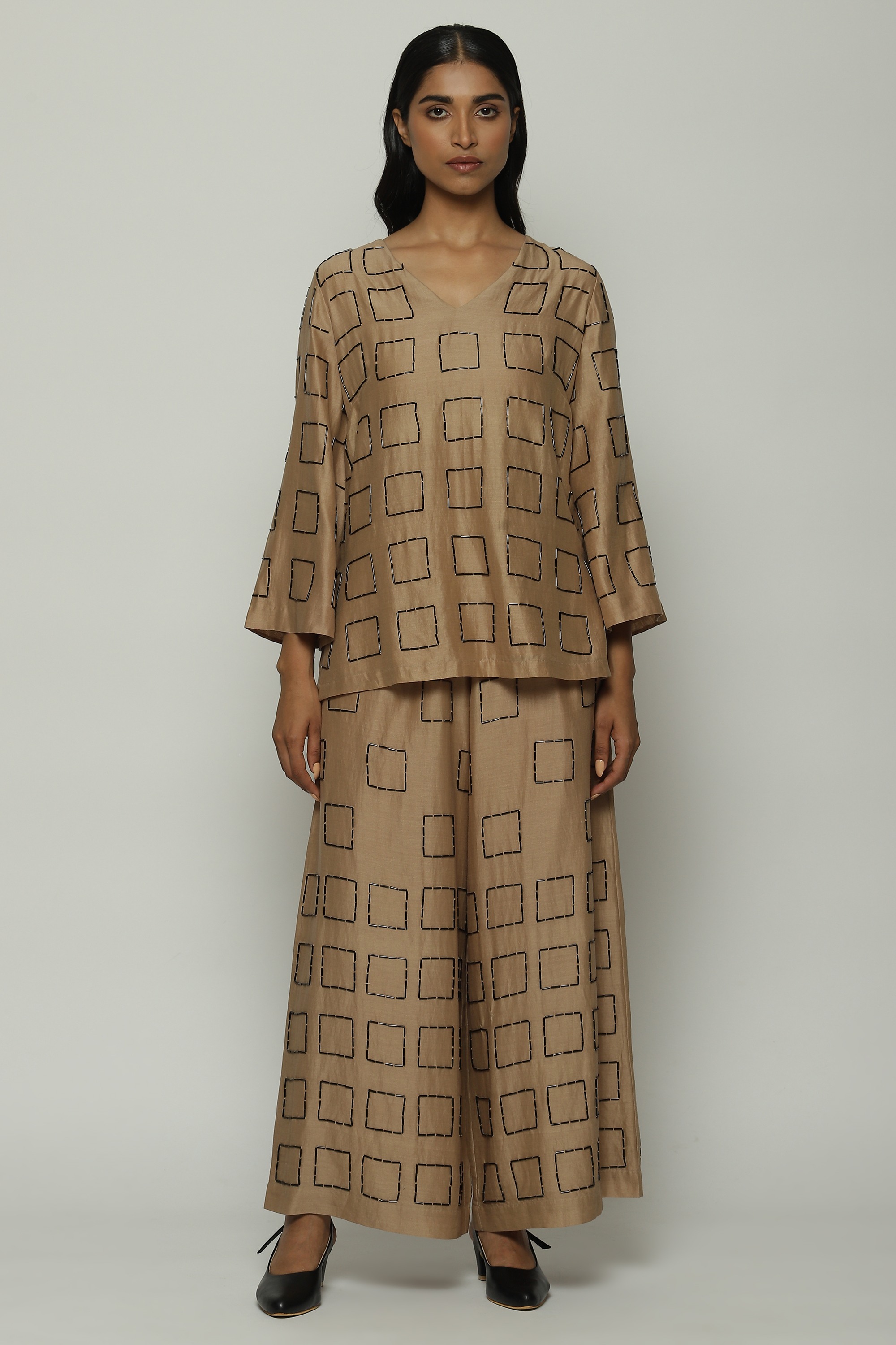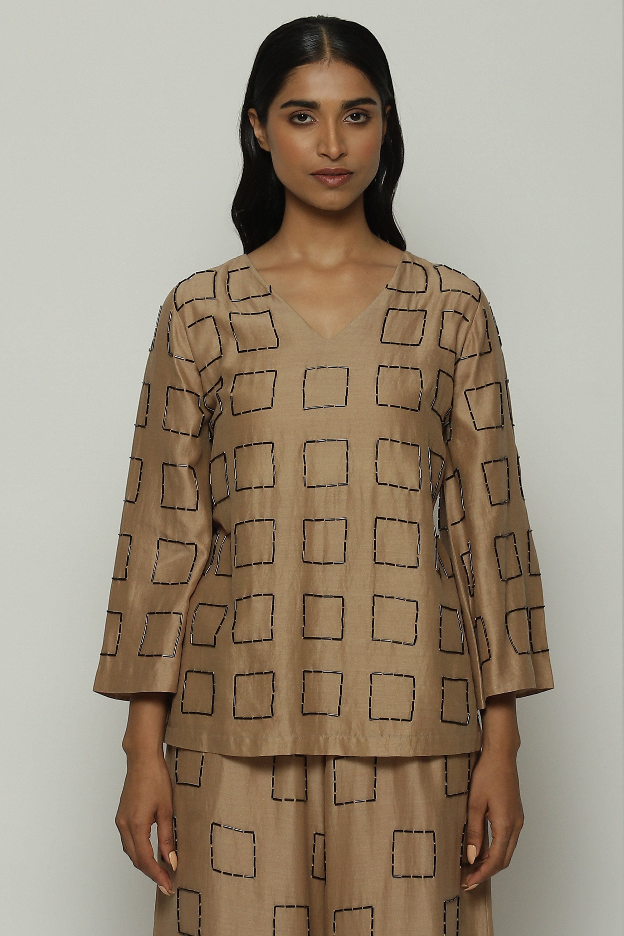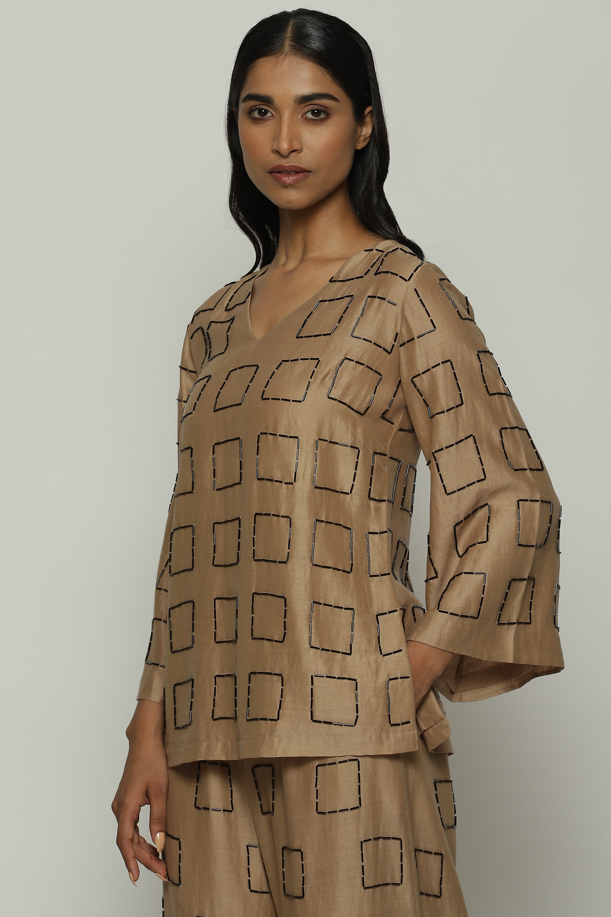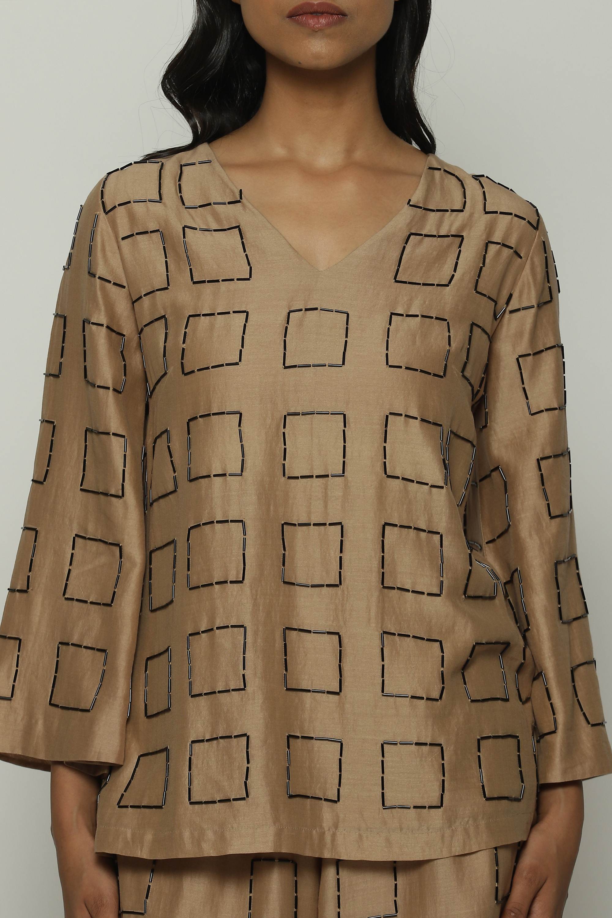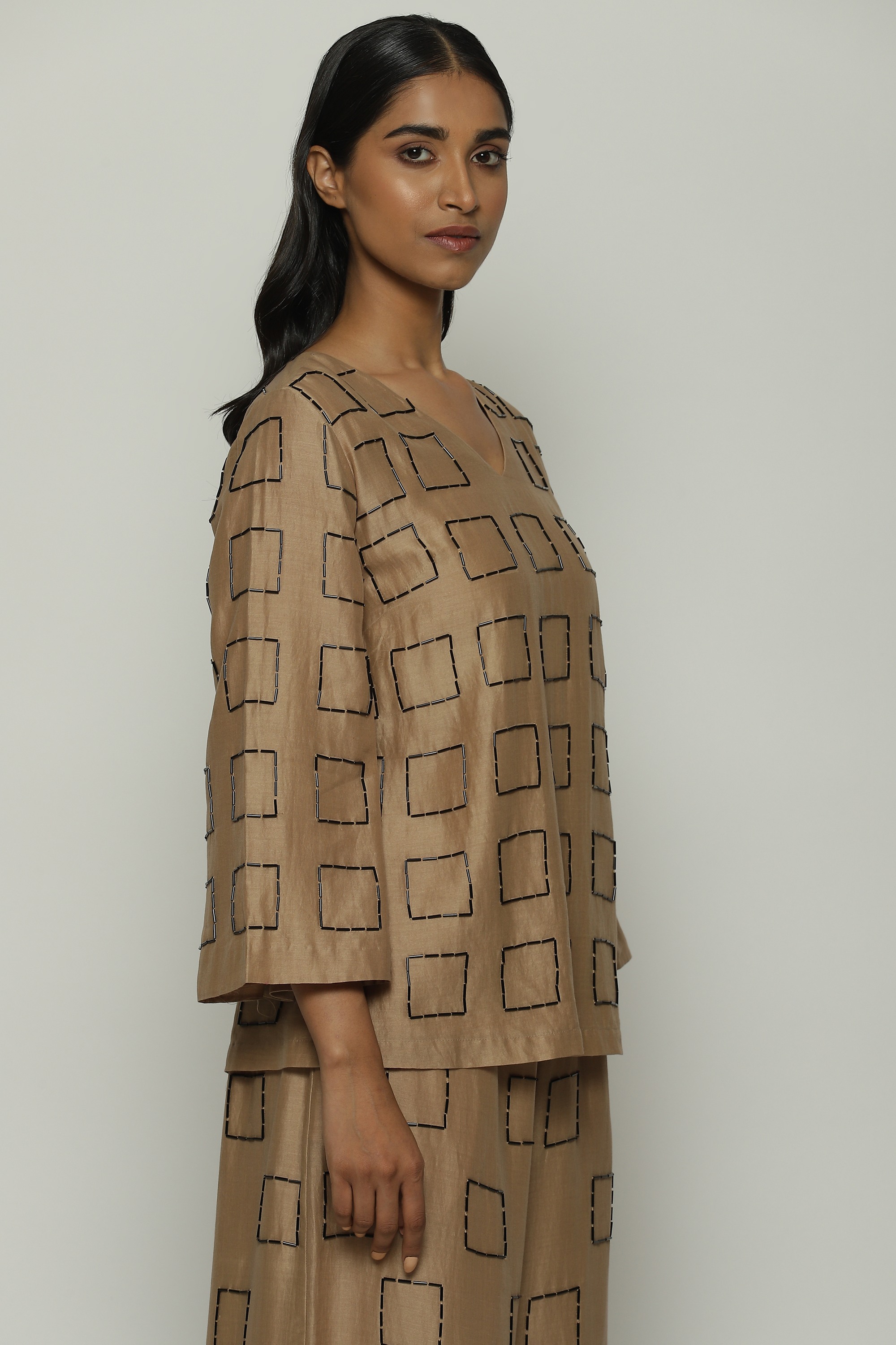 Geometric square embroidery lends structure to this biscuit-brown tunic.