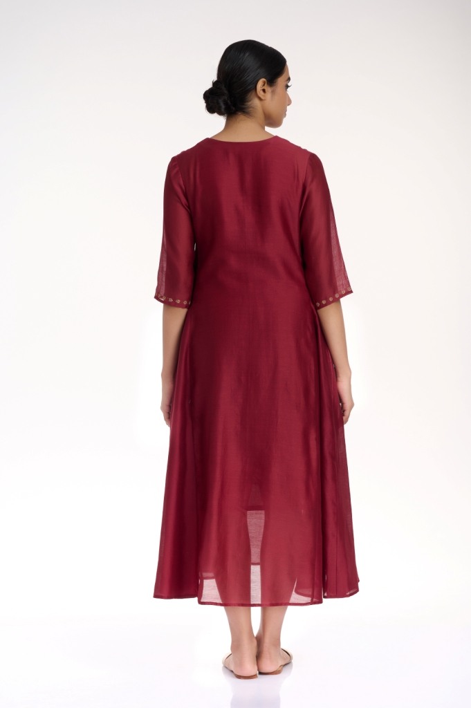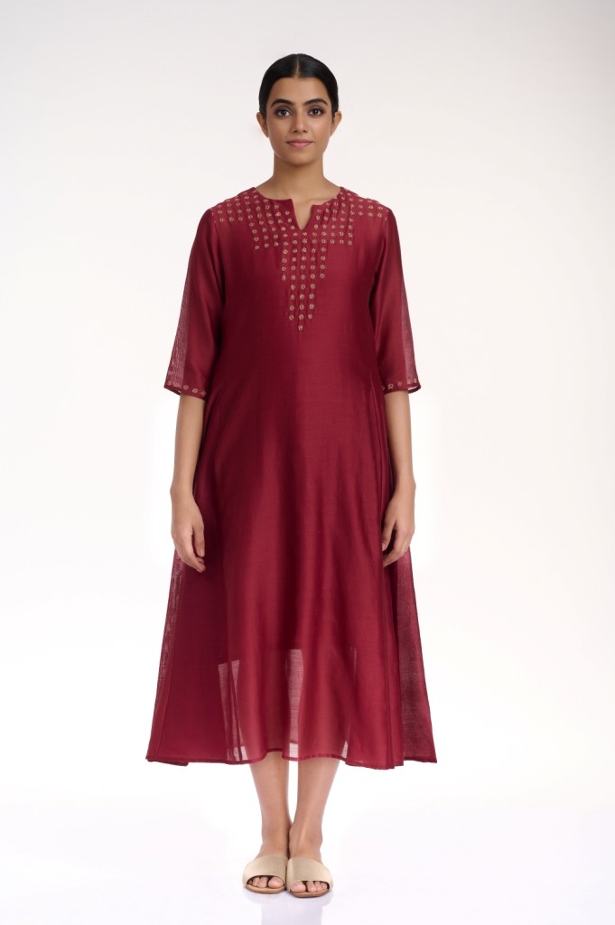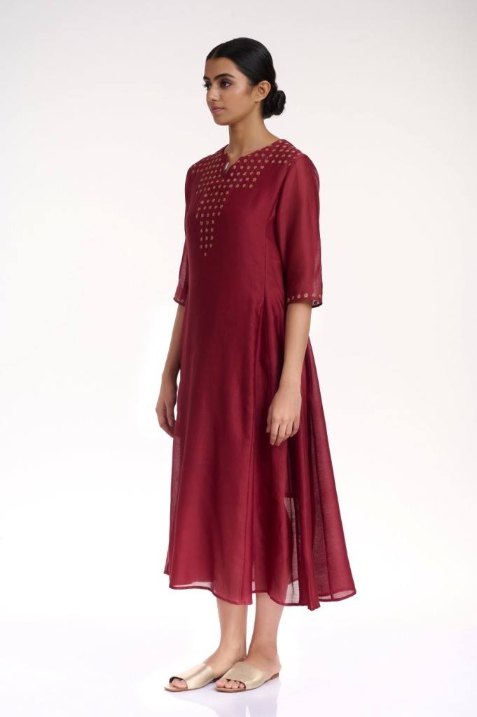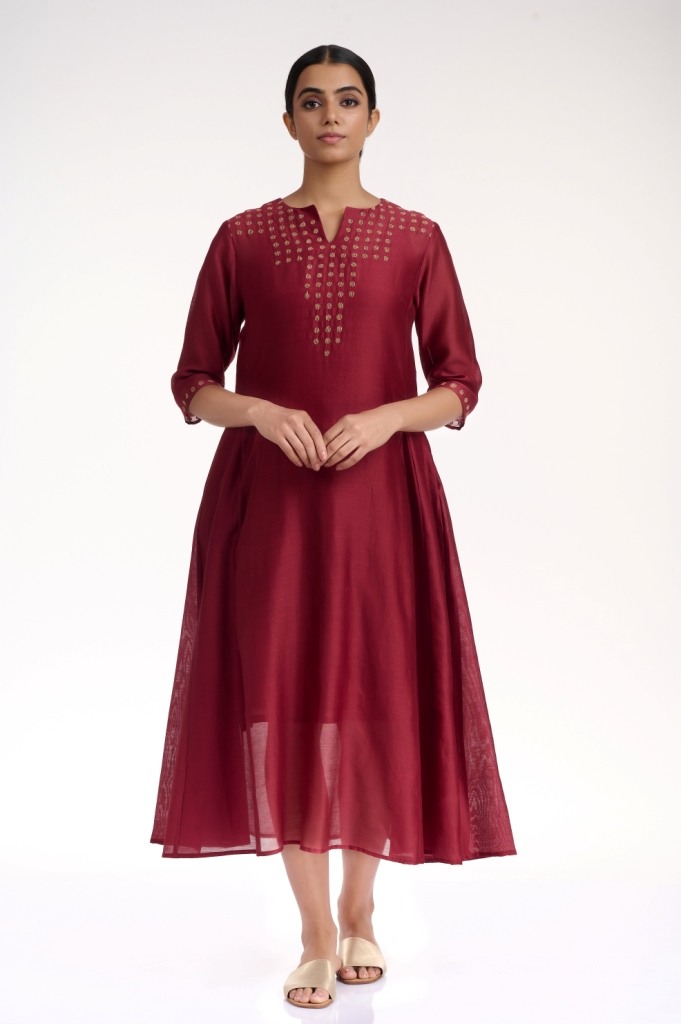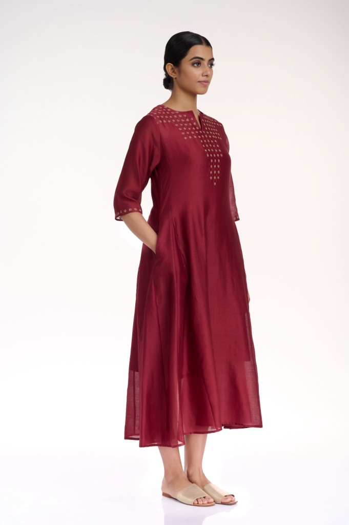 Add glamour and elegance in burgundy and gold, a soft flowing kali dress, crafted from silk-cotton fabric, detailed with gold thread embroidered dots on the yoke and sleeves. Added pockets in the side seams.