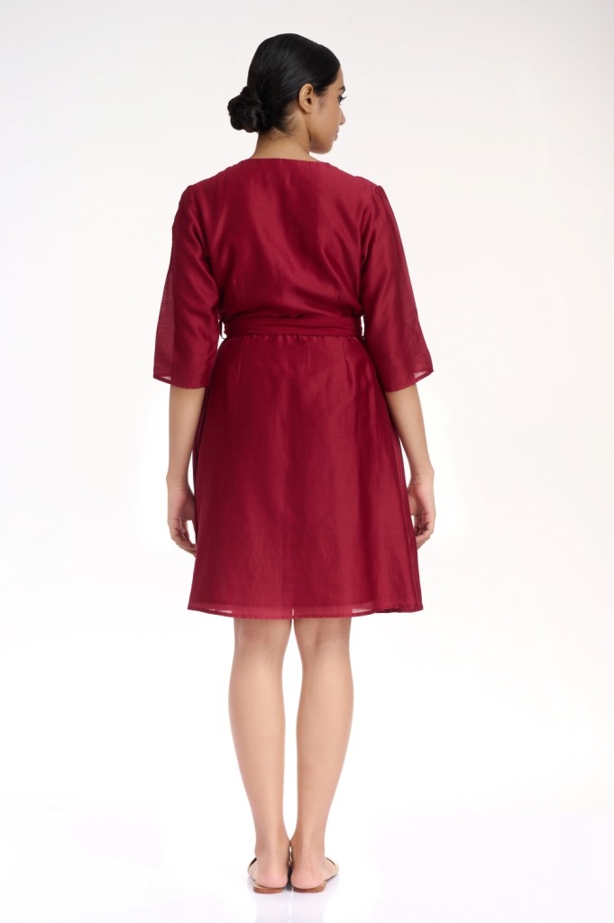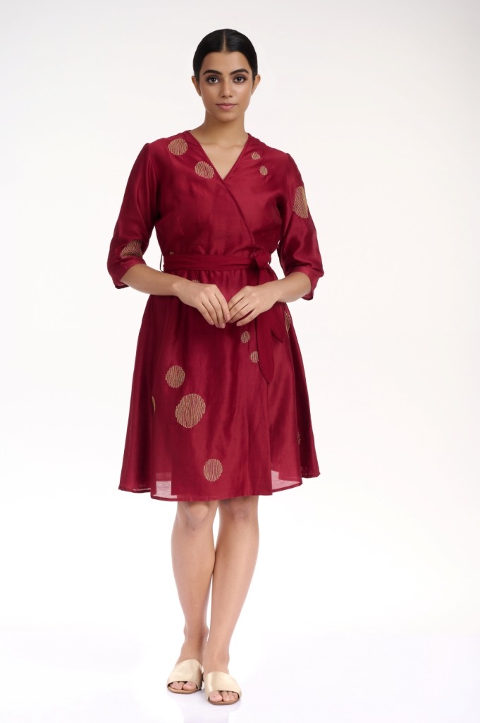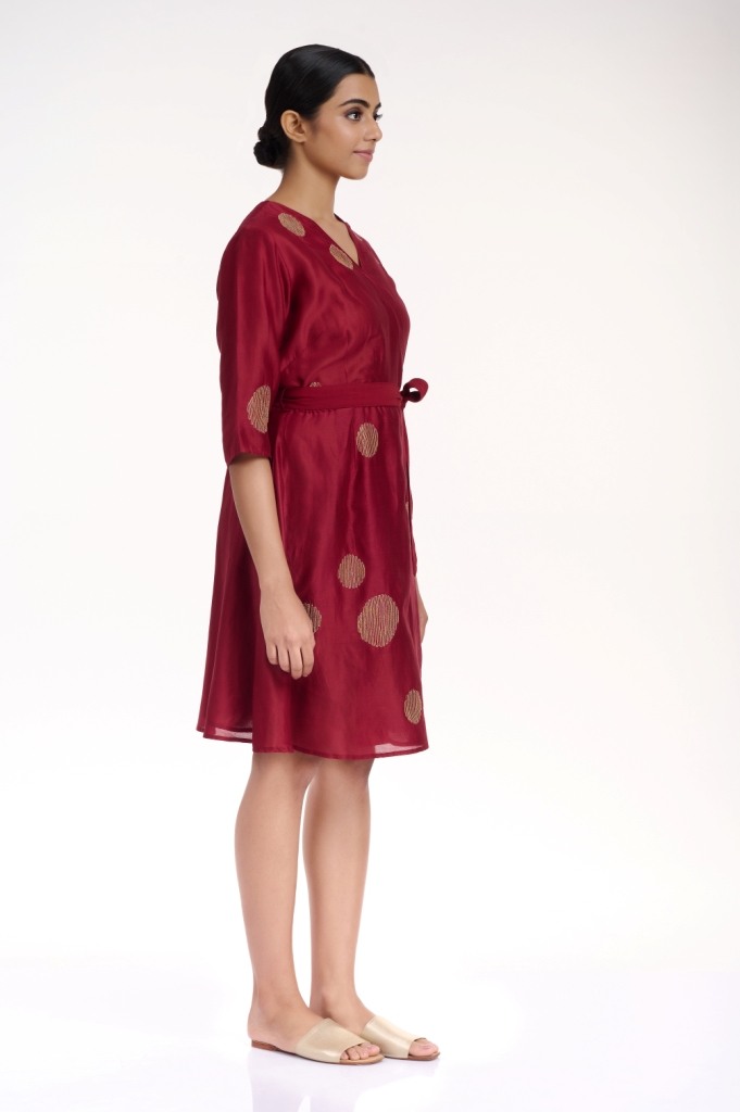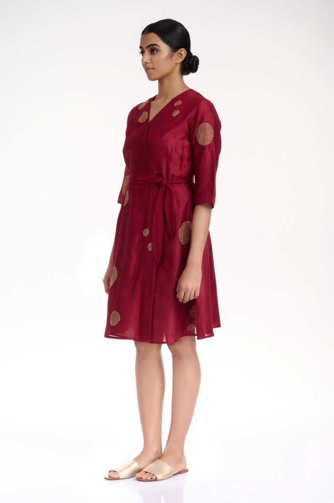 Elegant faux-wrap dress with a V-shaped neckline in burgundy, engineered embroidered gold thread dots, crafted from silk-cotton, with fabric belt and loops on the side seams. Detailed with a slim elasticated waist for an easy fit.