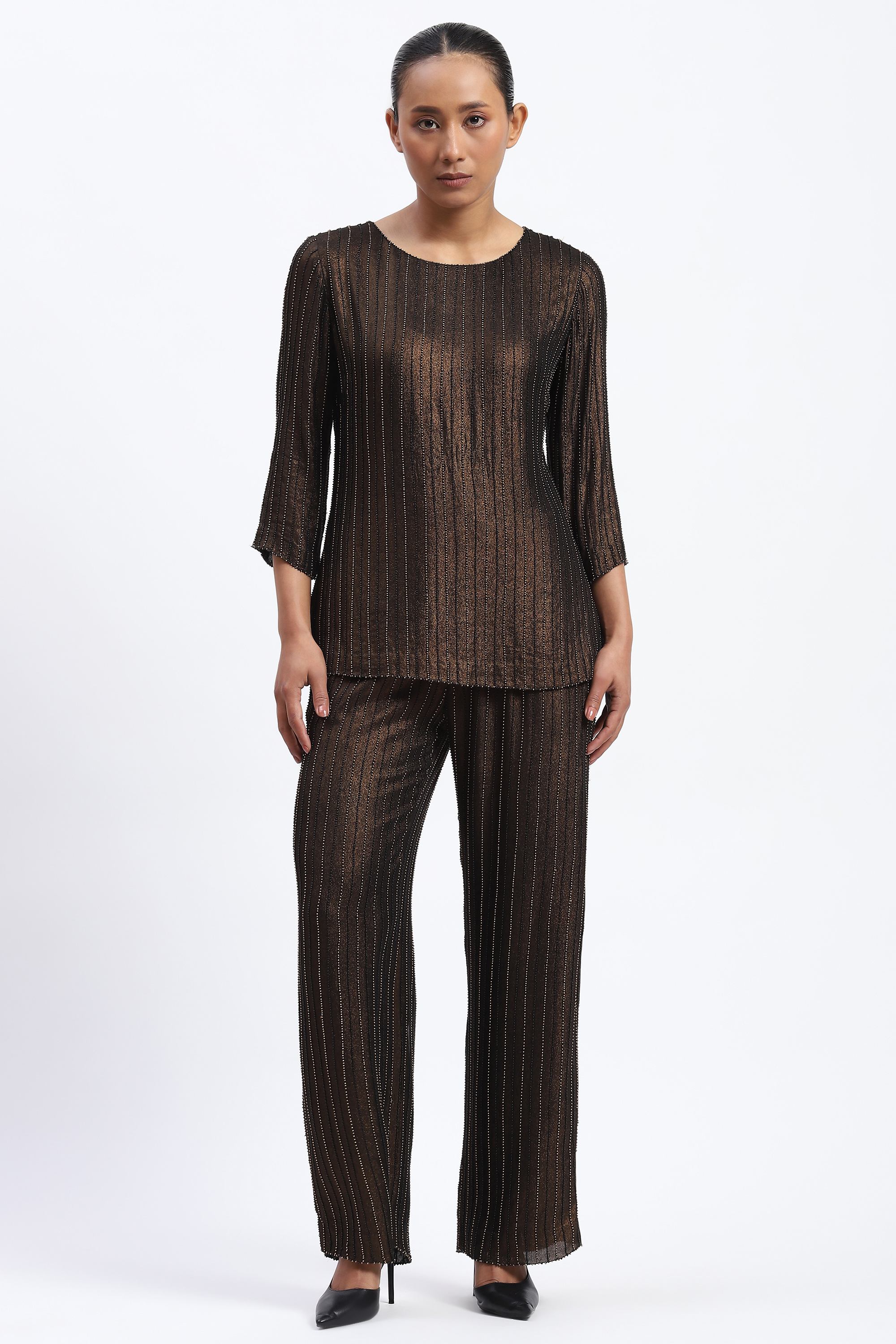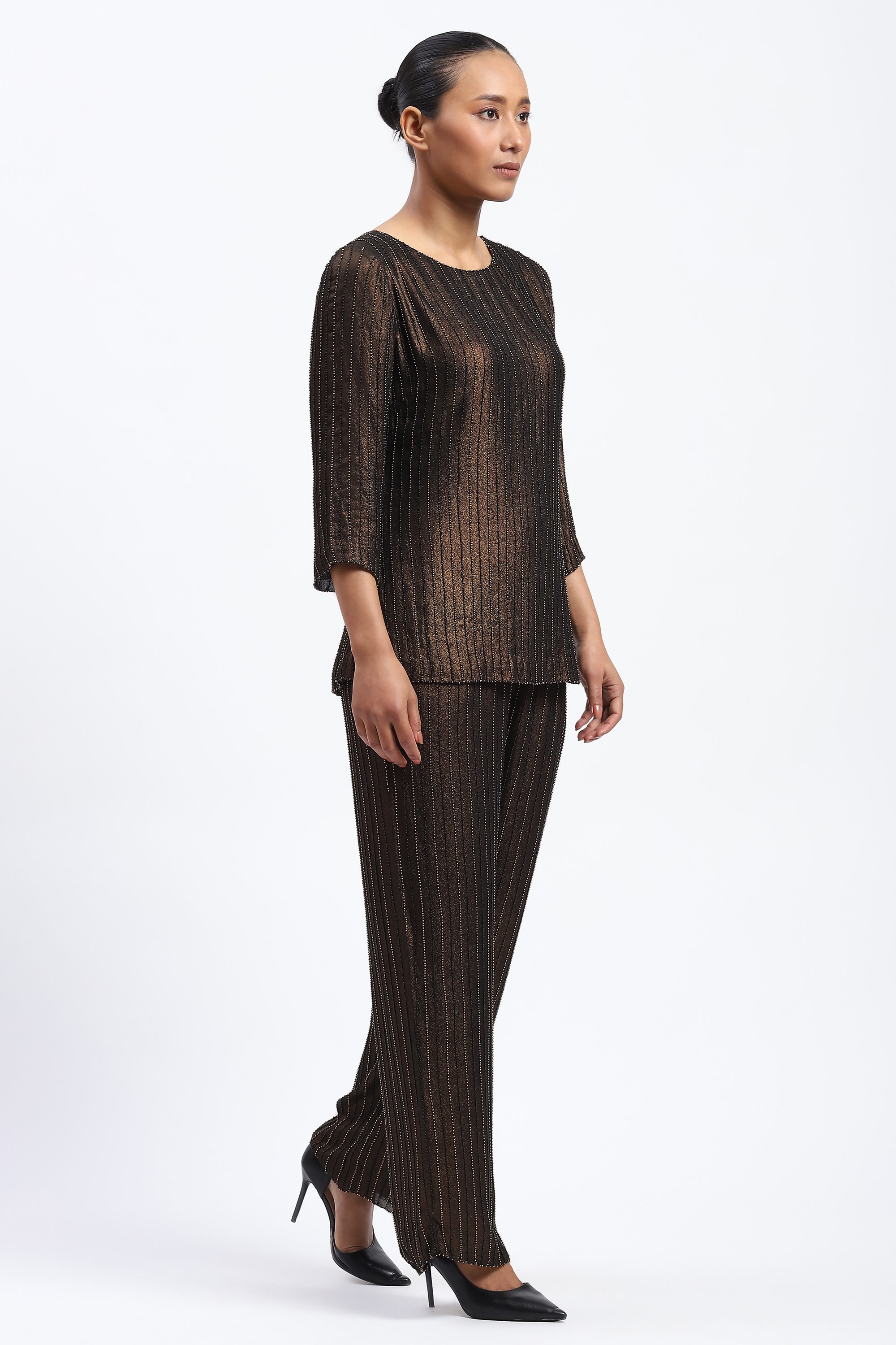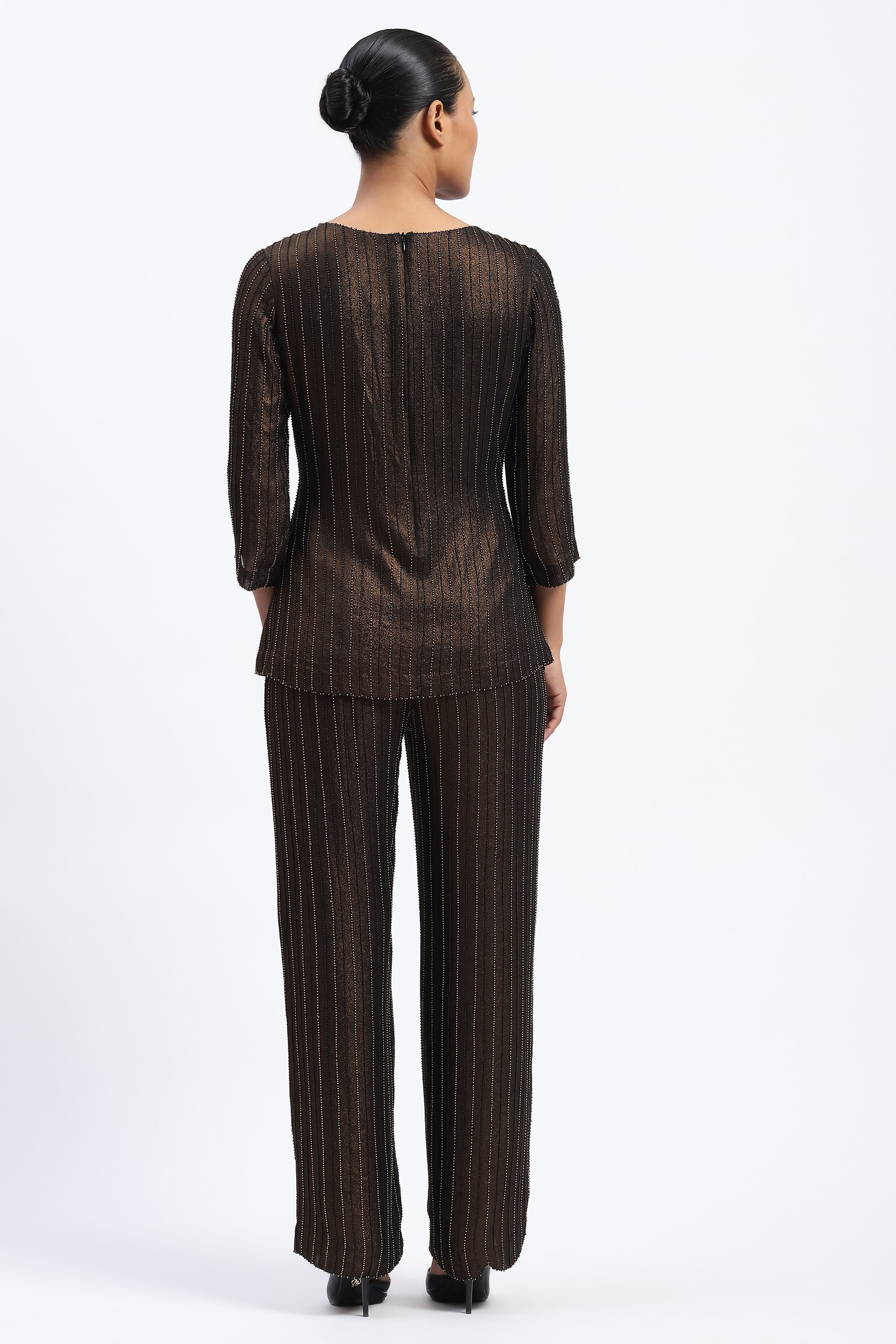 This limited edition piece has been made using a metallic gold printed georgette embellished with black and gold beads for subtle evening glamour.