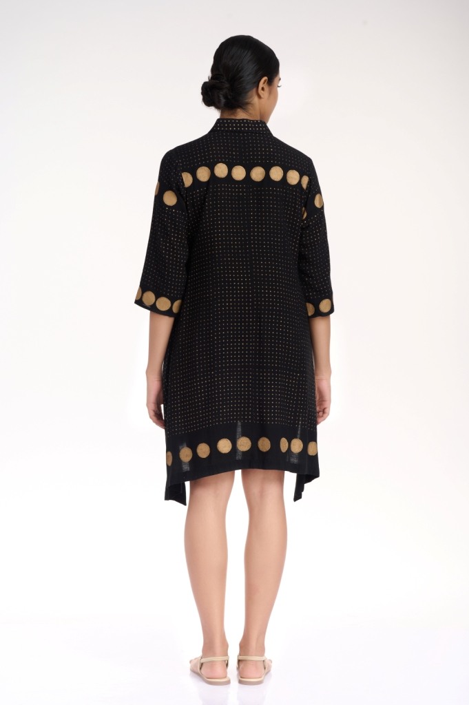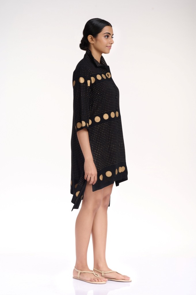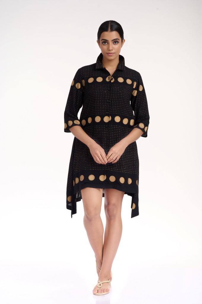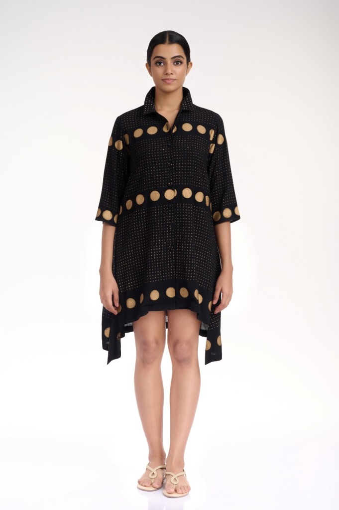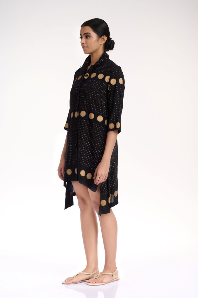 Easy glamour in black and gold, hand printed gold khari in fine and polka dots, crafted on a soft cellulose sustainable fabric. Detailed with a collar and fabric buttons.