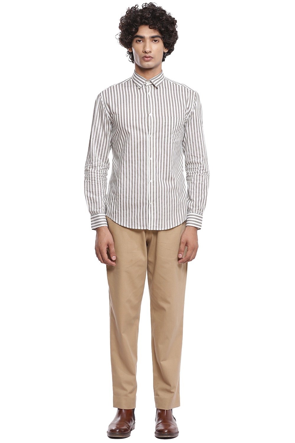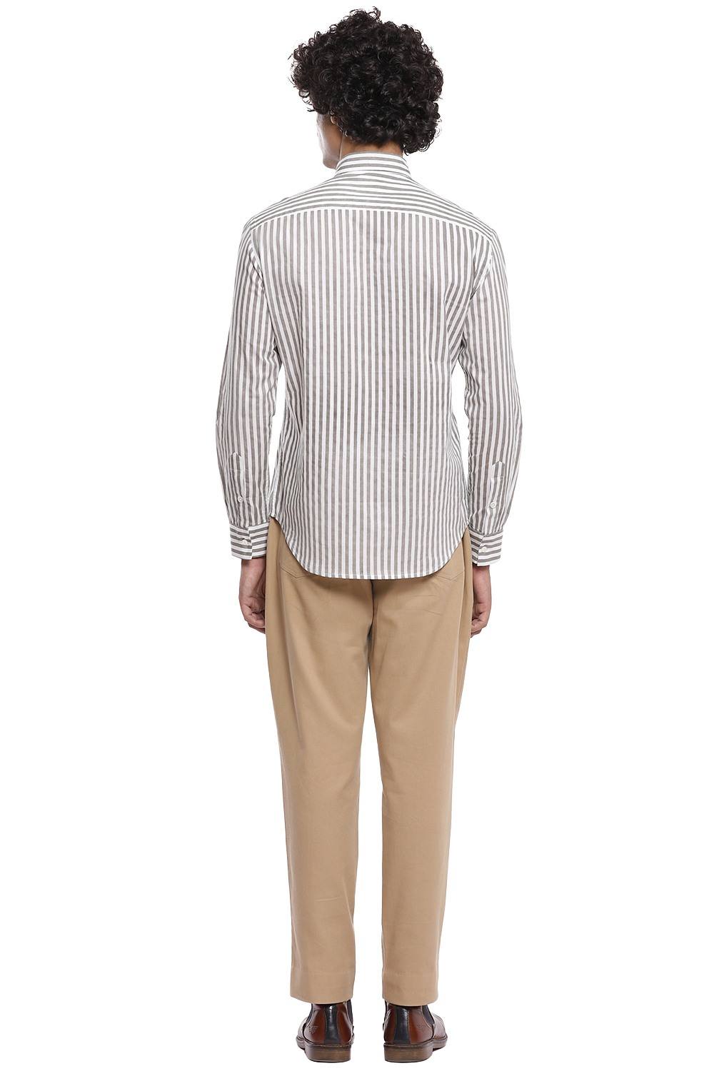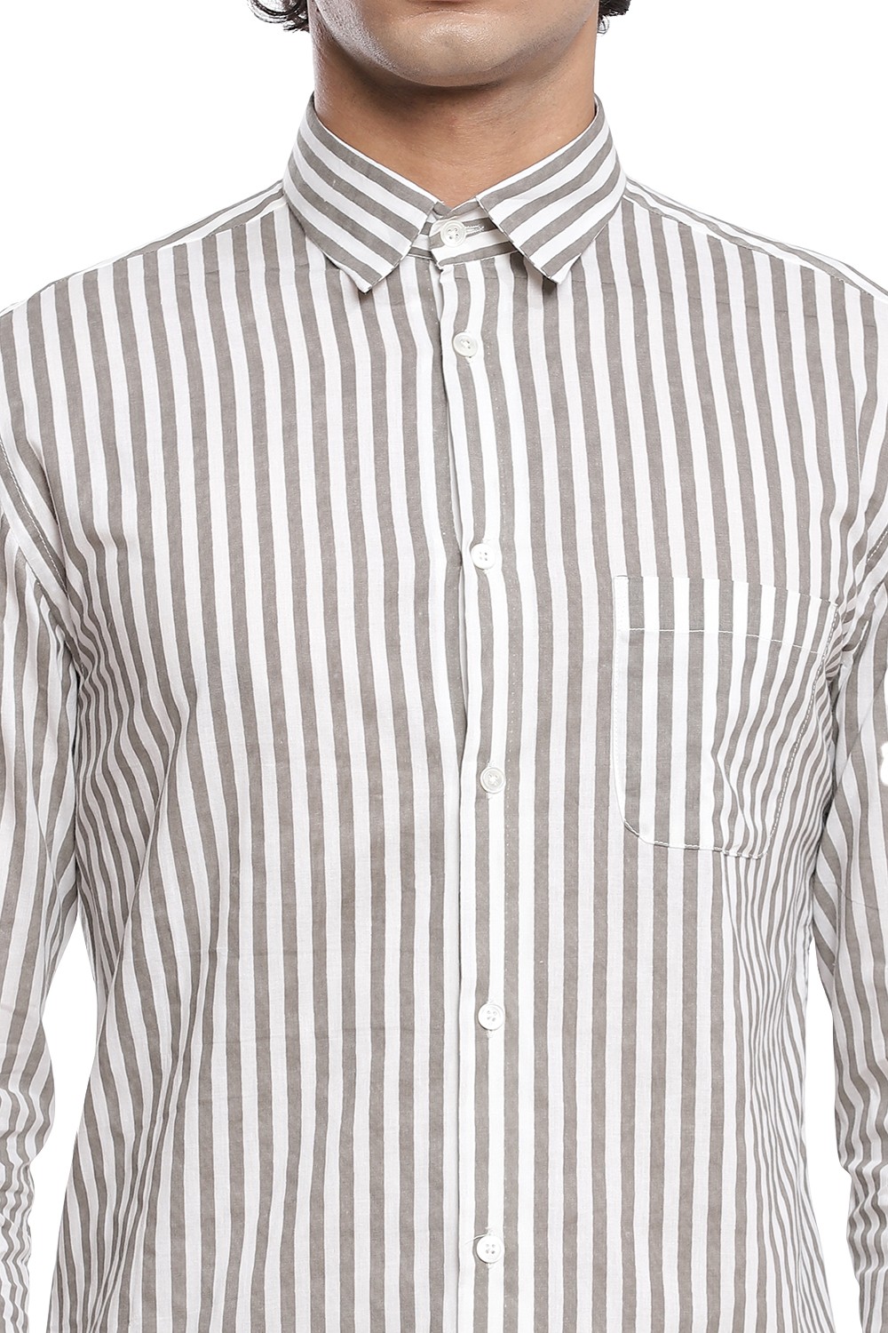 A staple vertical hand block printed stripes, crafted from cotton cambric in ivory and grey. This shirt is cut for a relaxed and comfortable fit.