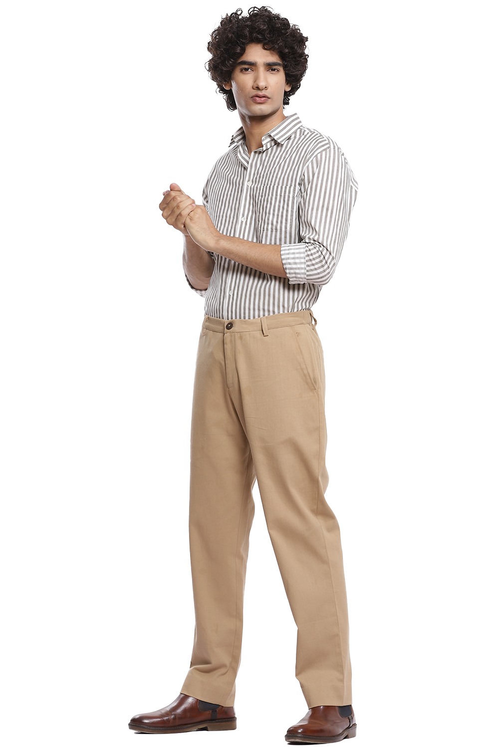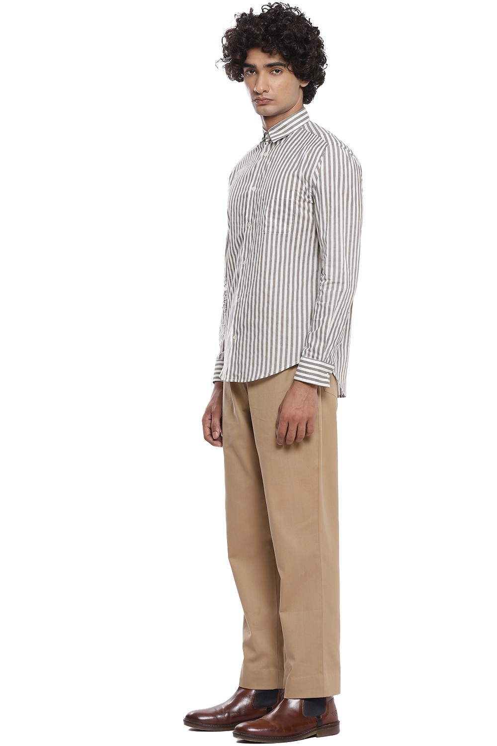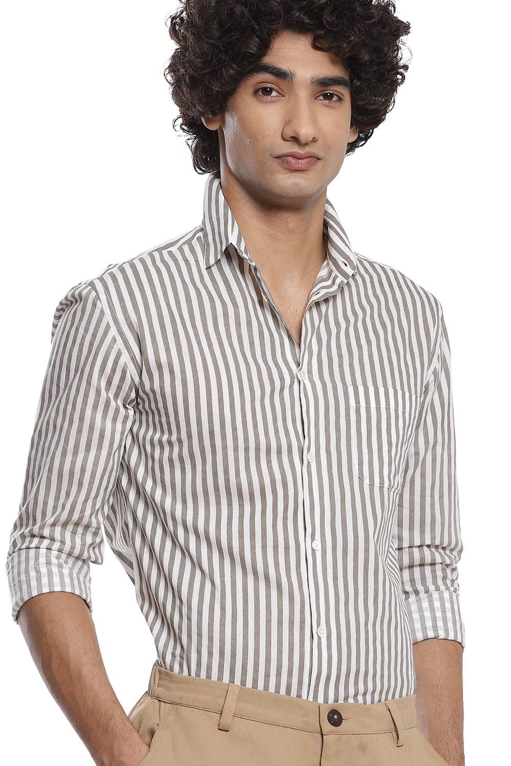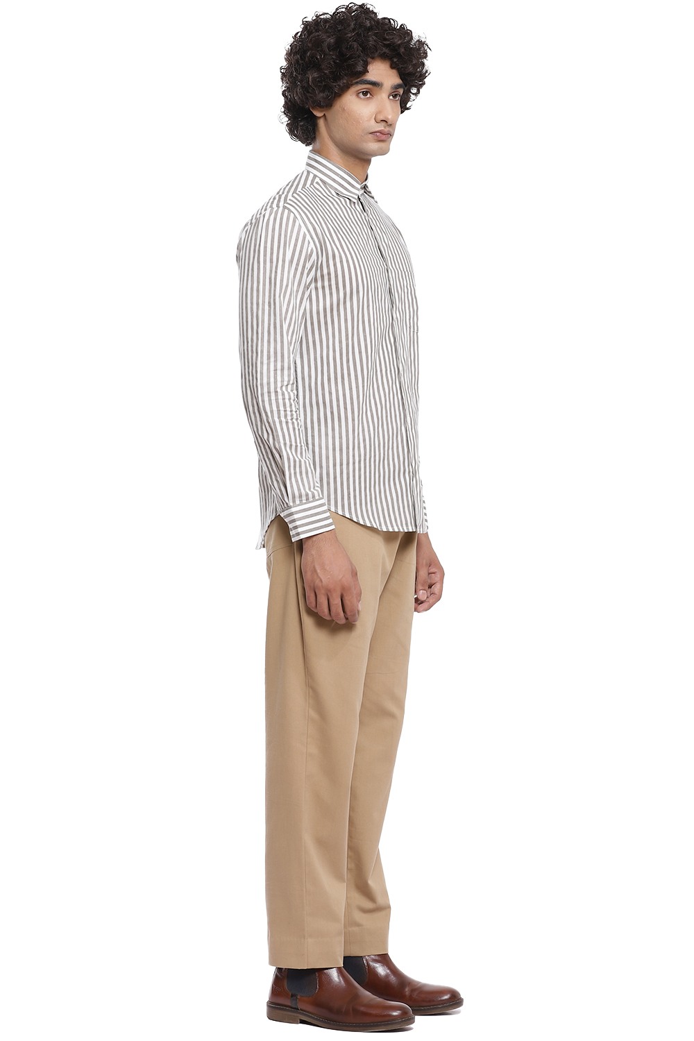 A staple vertical hand block printed stripes, crafted from cotton cambric in ivory and grey. This shirt is cut for a relaxed and comfortable fit.