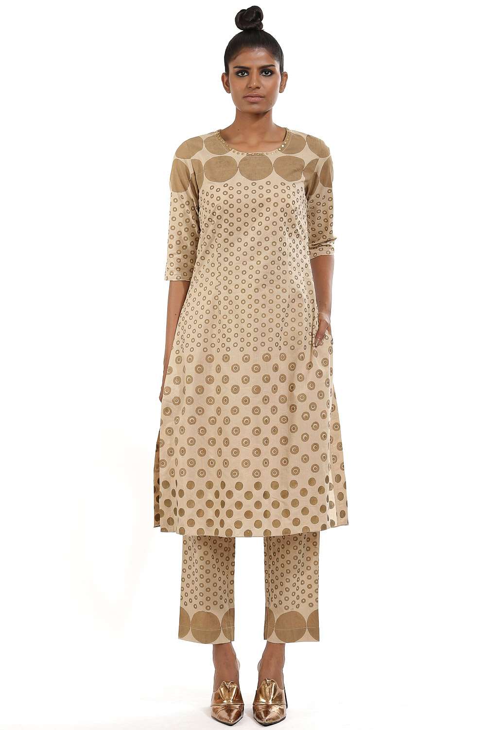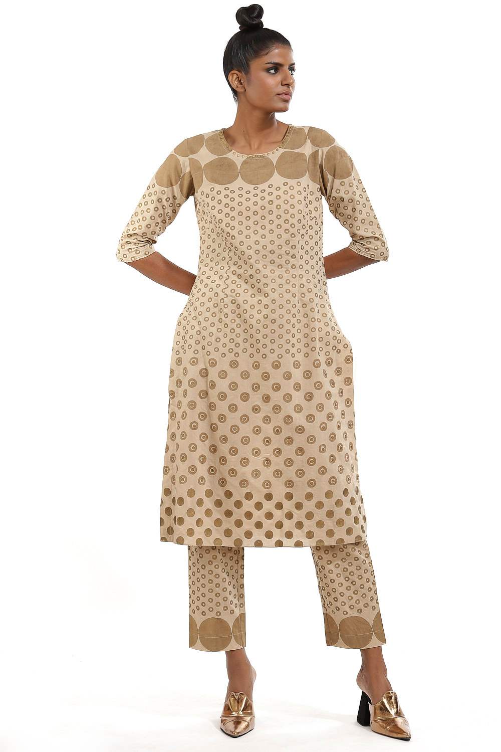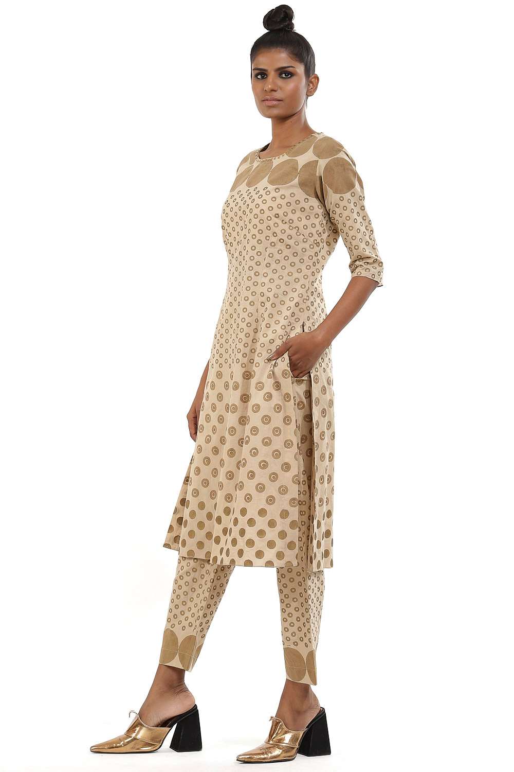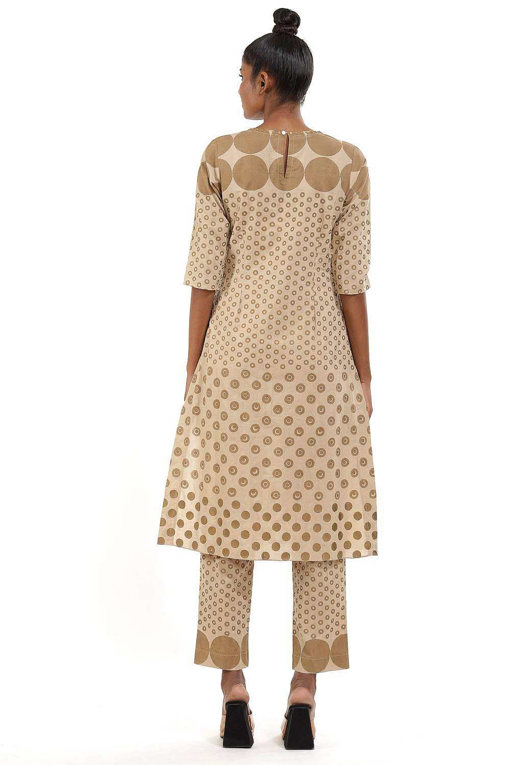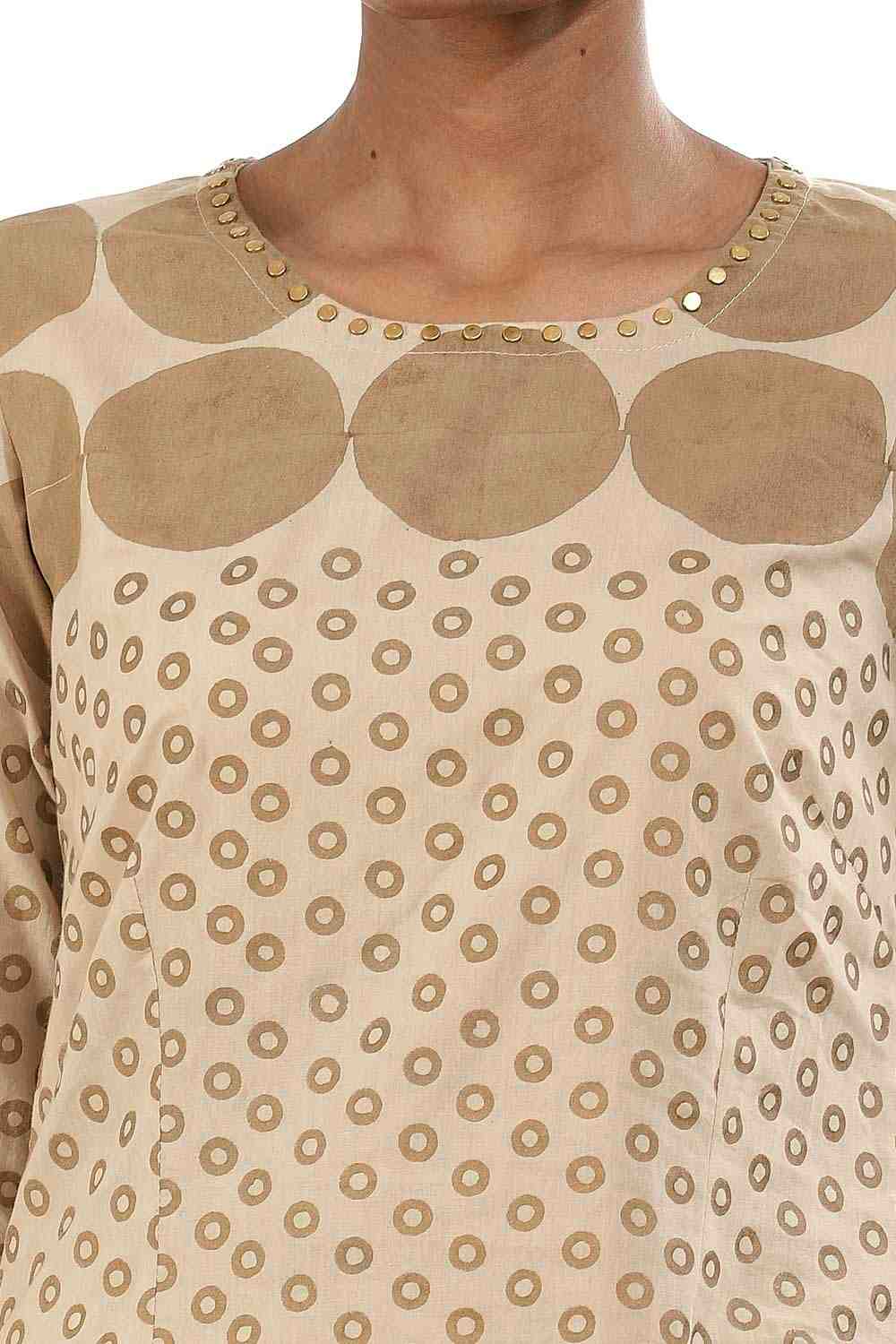 Hand block print circle and dots with metal stud. This garment is exclusively handcrafted using an environmentally sustainable viscose.