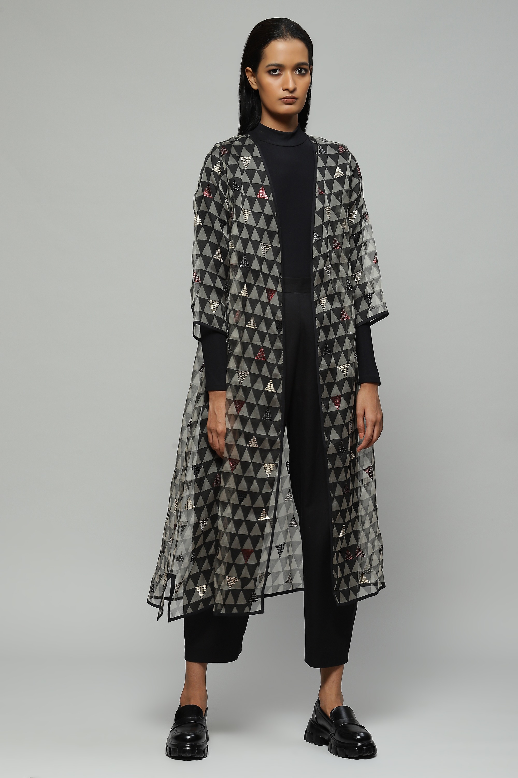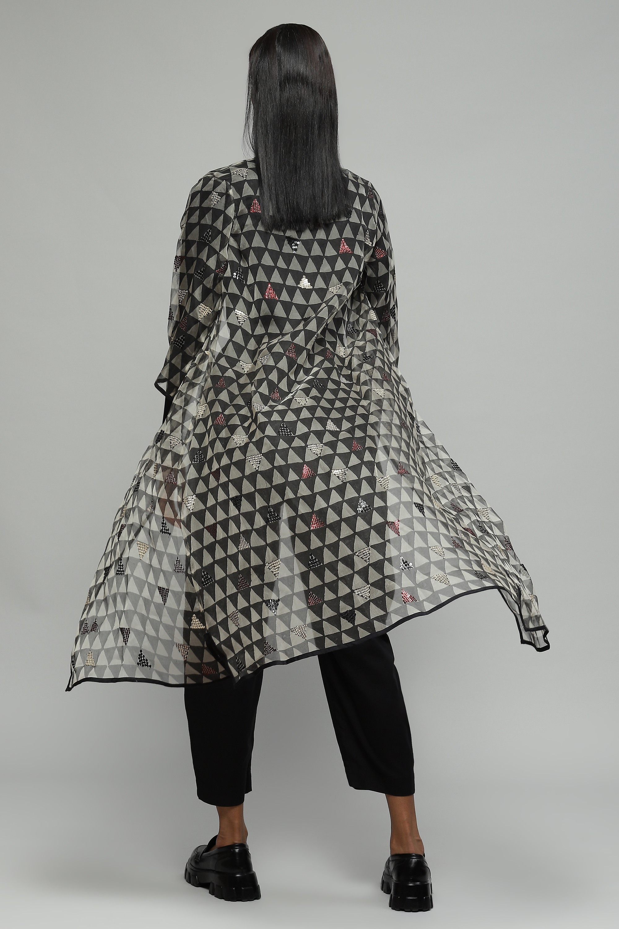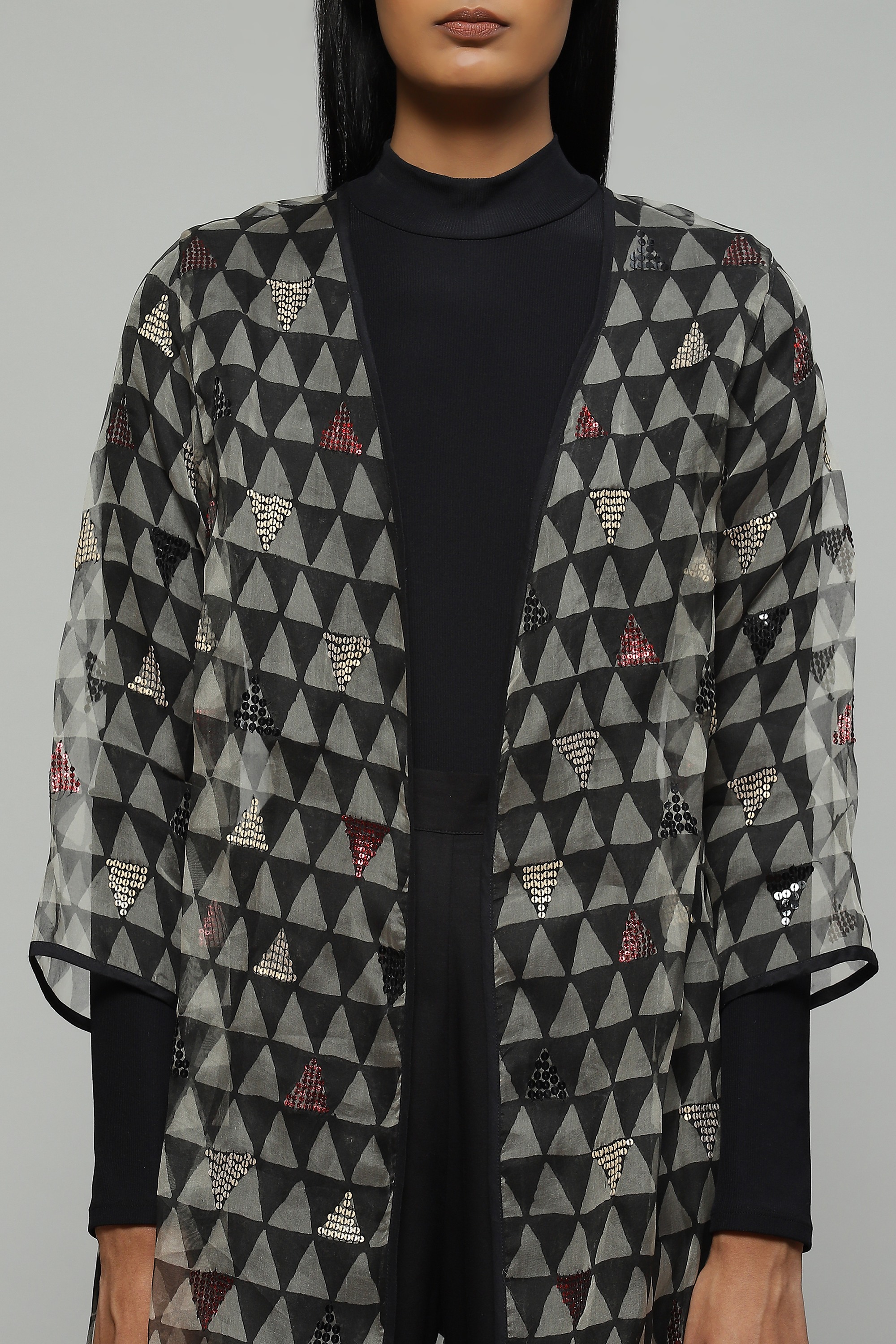 A black jacket crafted in silk organza and bearing a handblock printed triangle pattern
