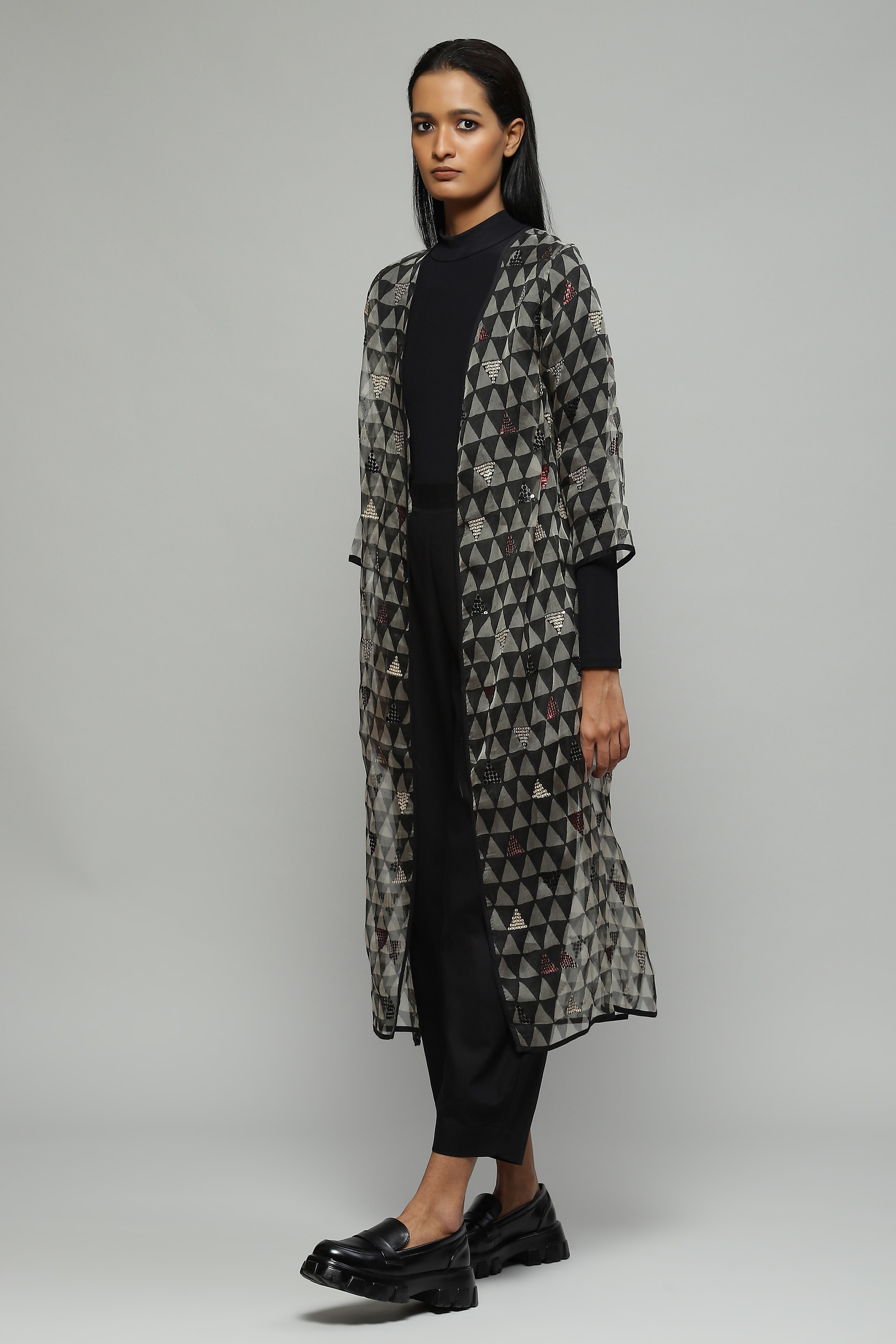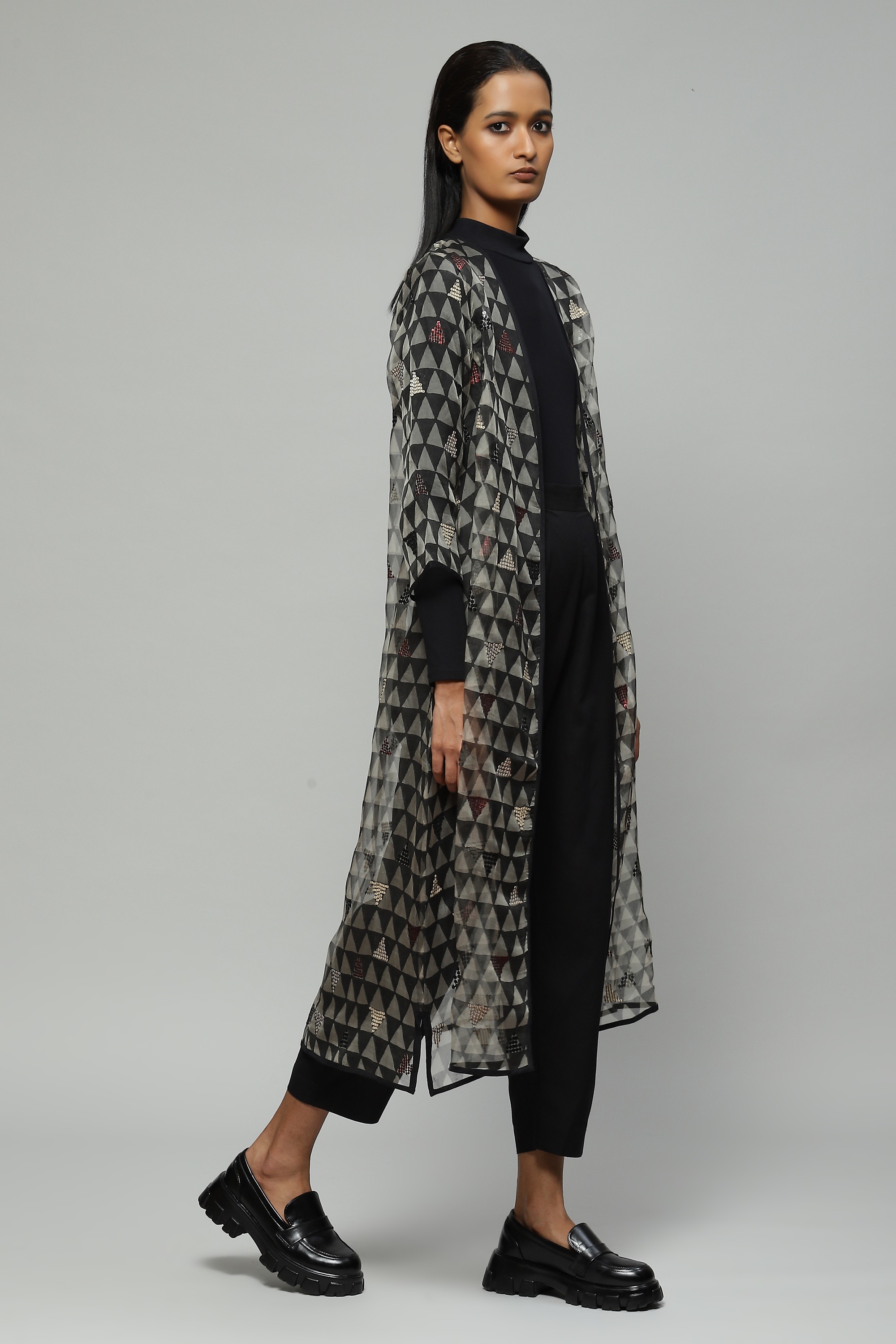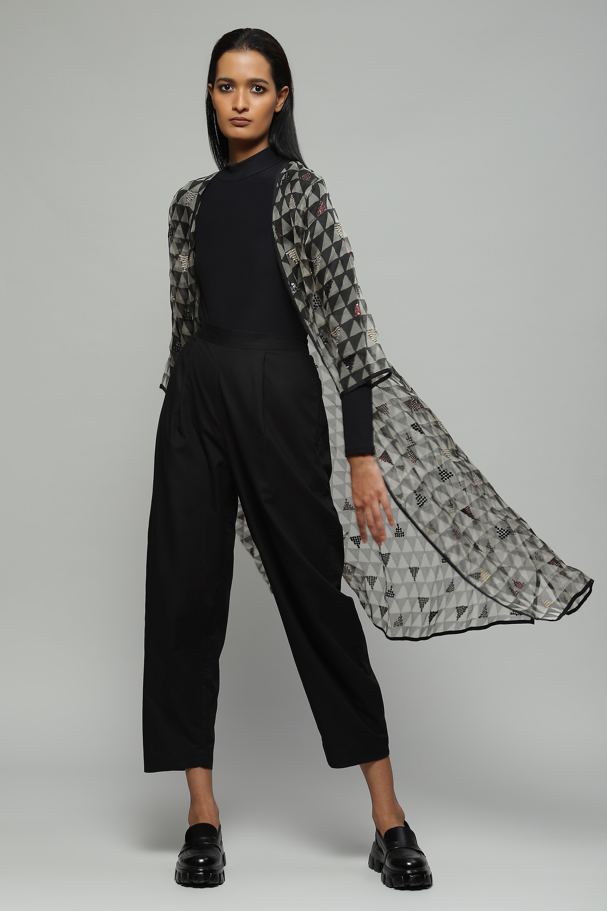 A black jacket crafted in silk organza and bearing a handblock printed triangle pattern