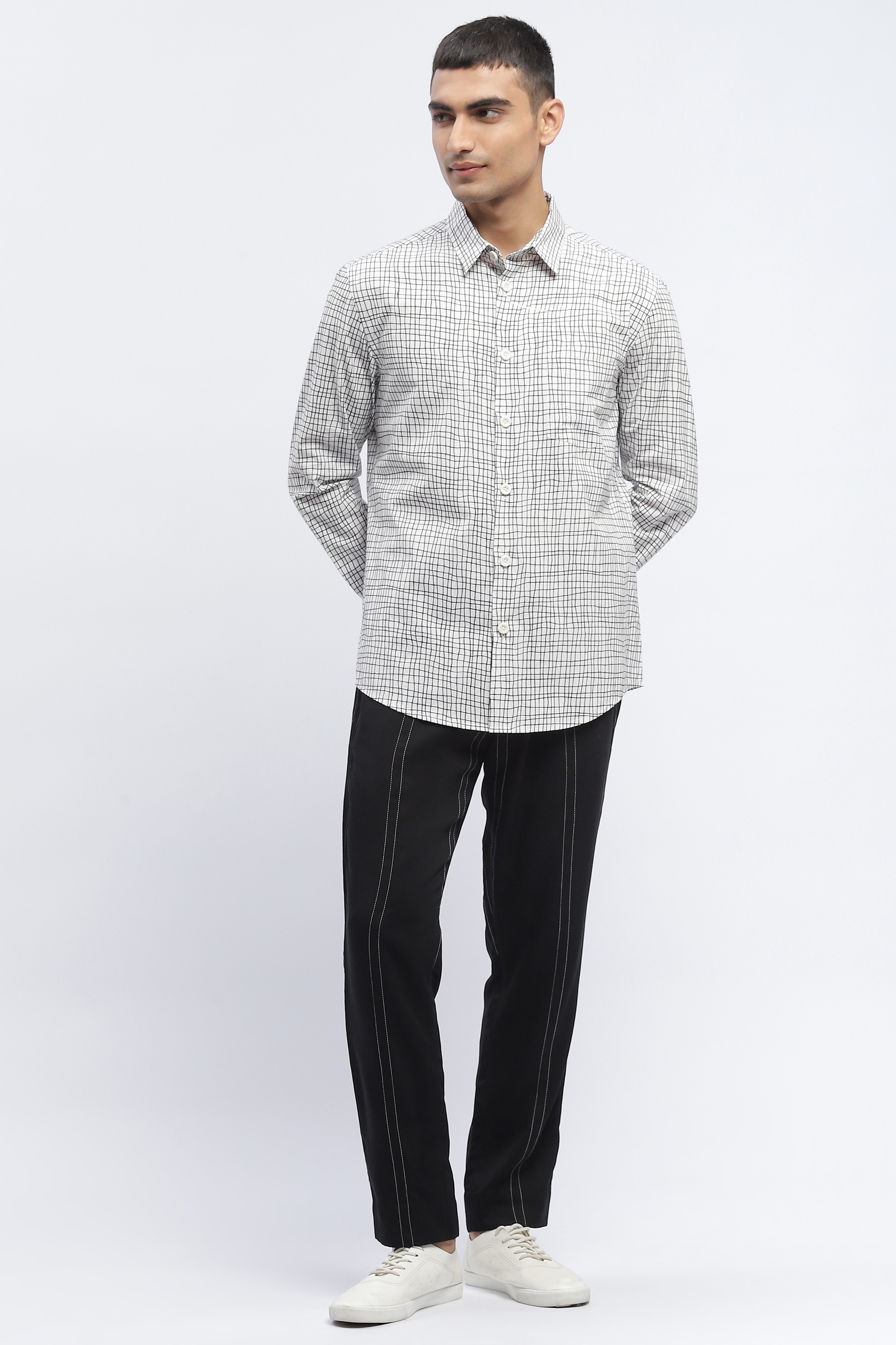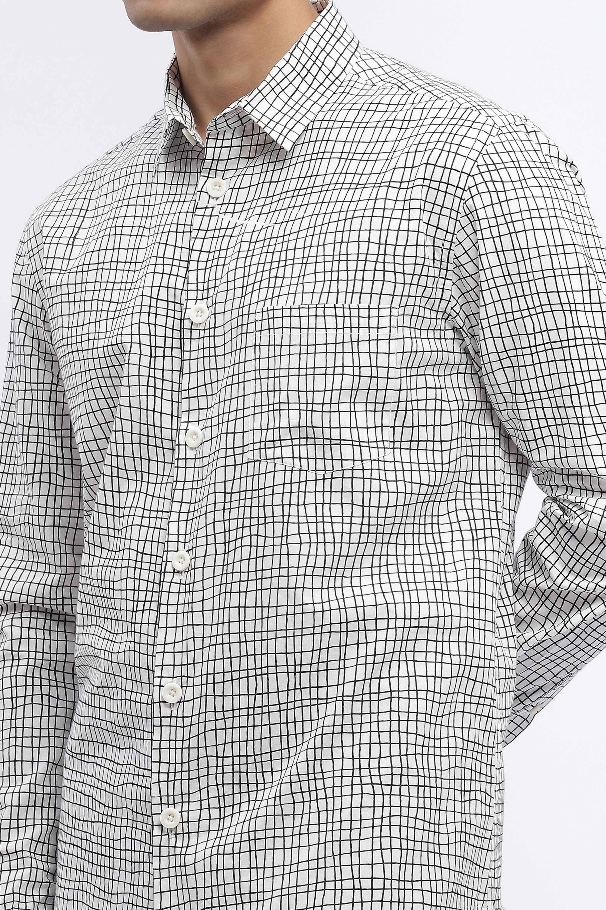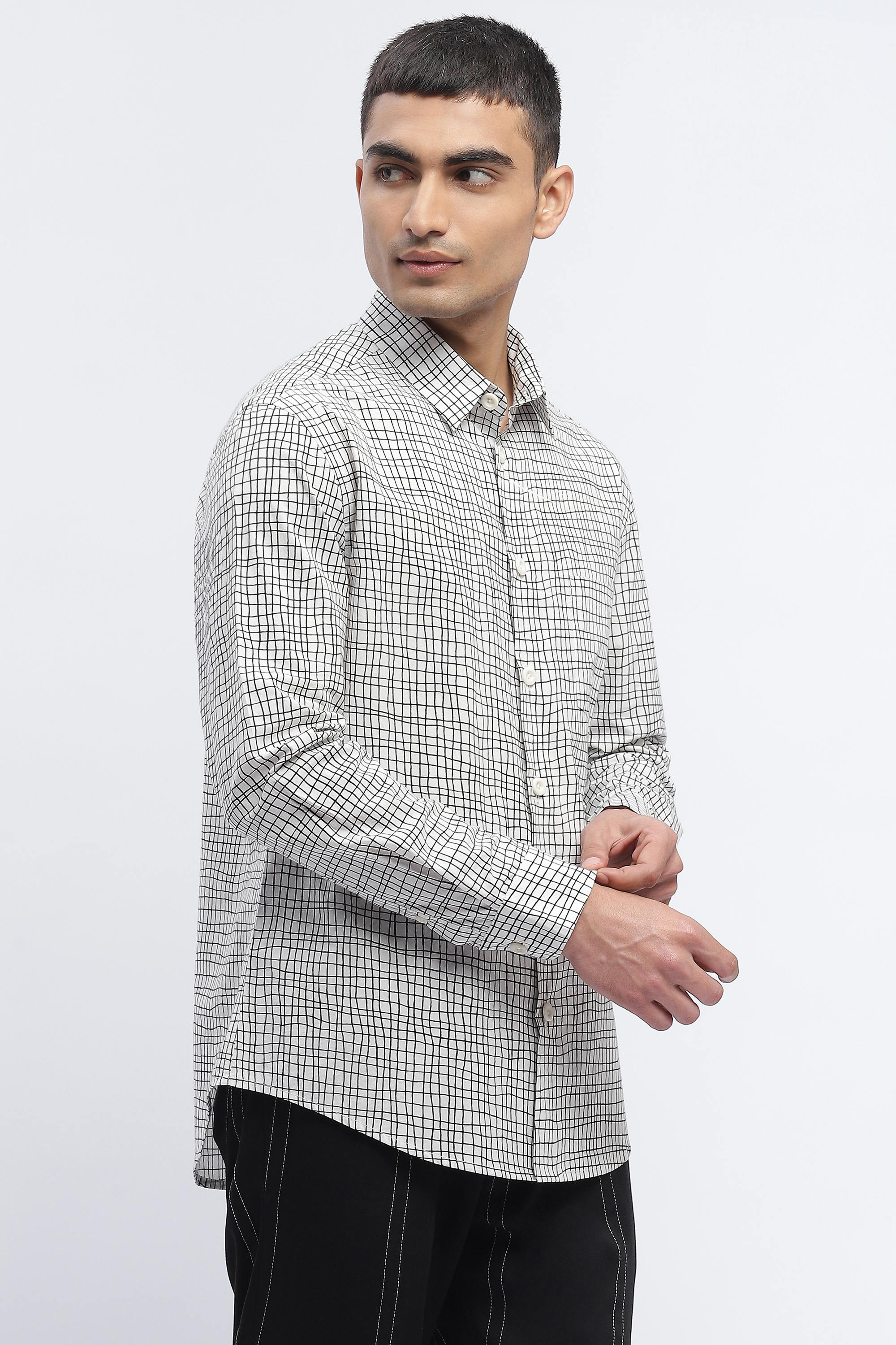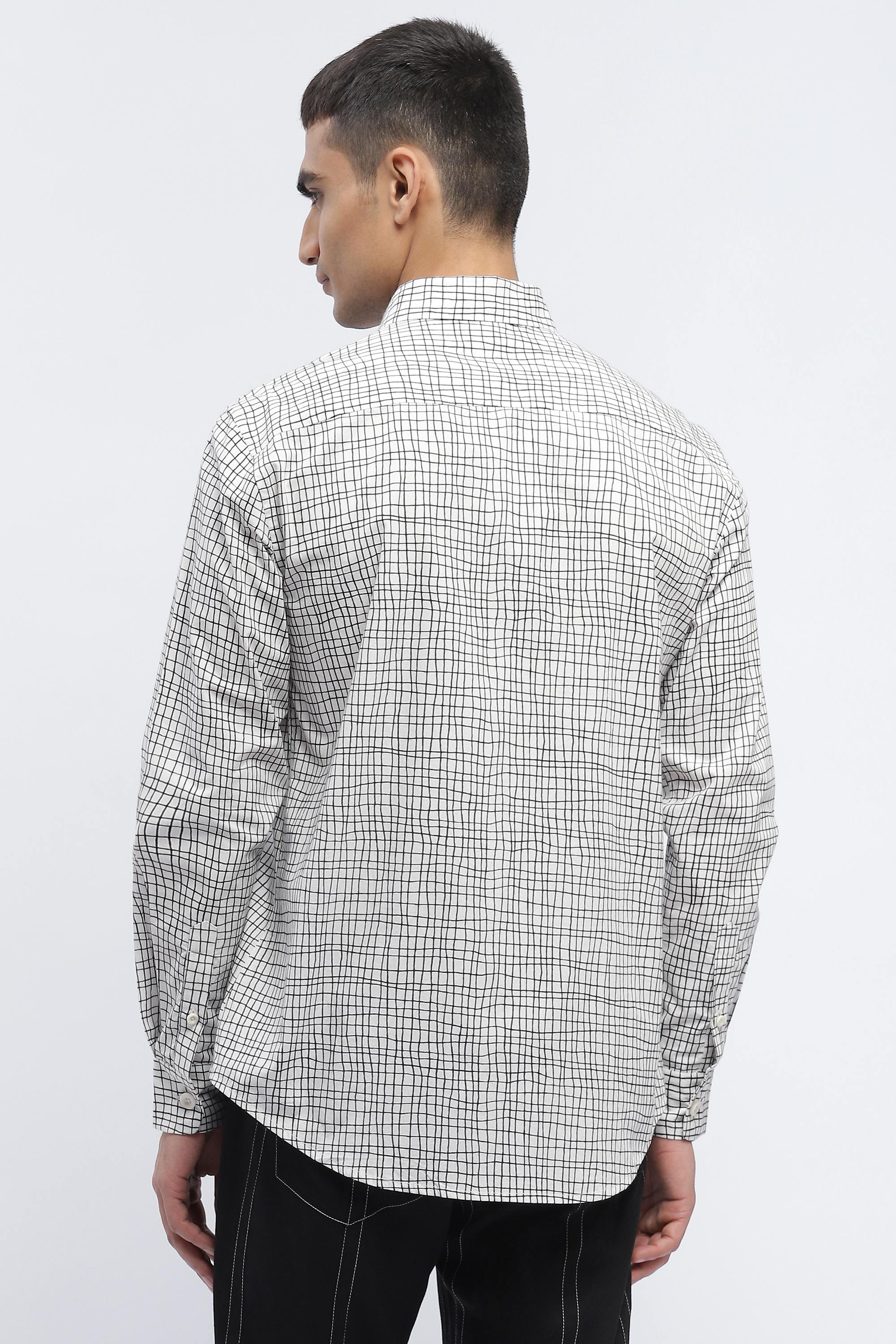 Best paired with an eye for symmetry, this ivory shirt is crafted in breathable cotton poplin. A jungle of digitally printed lines creates an ecstatic escape from a static life.