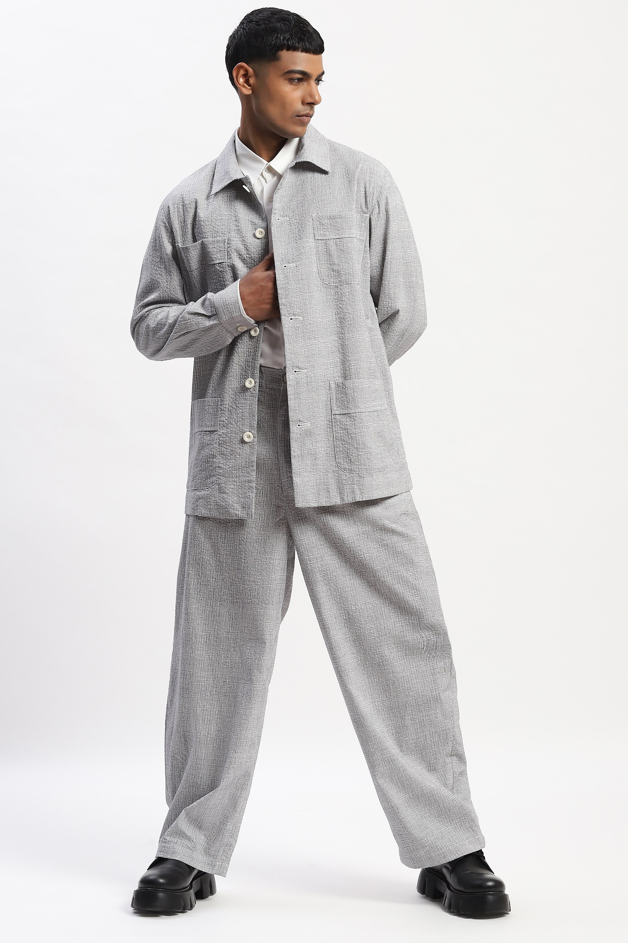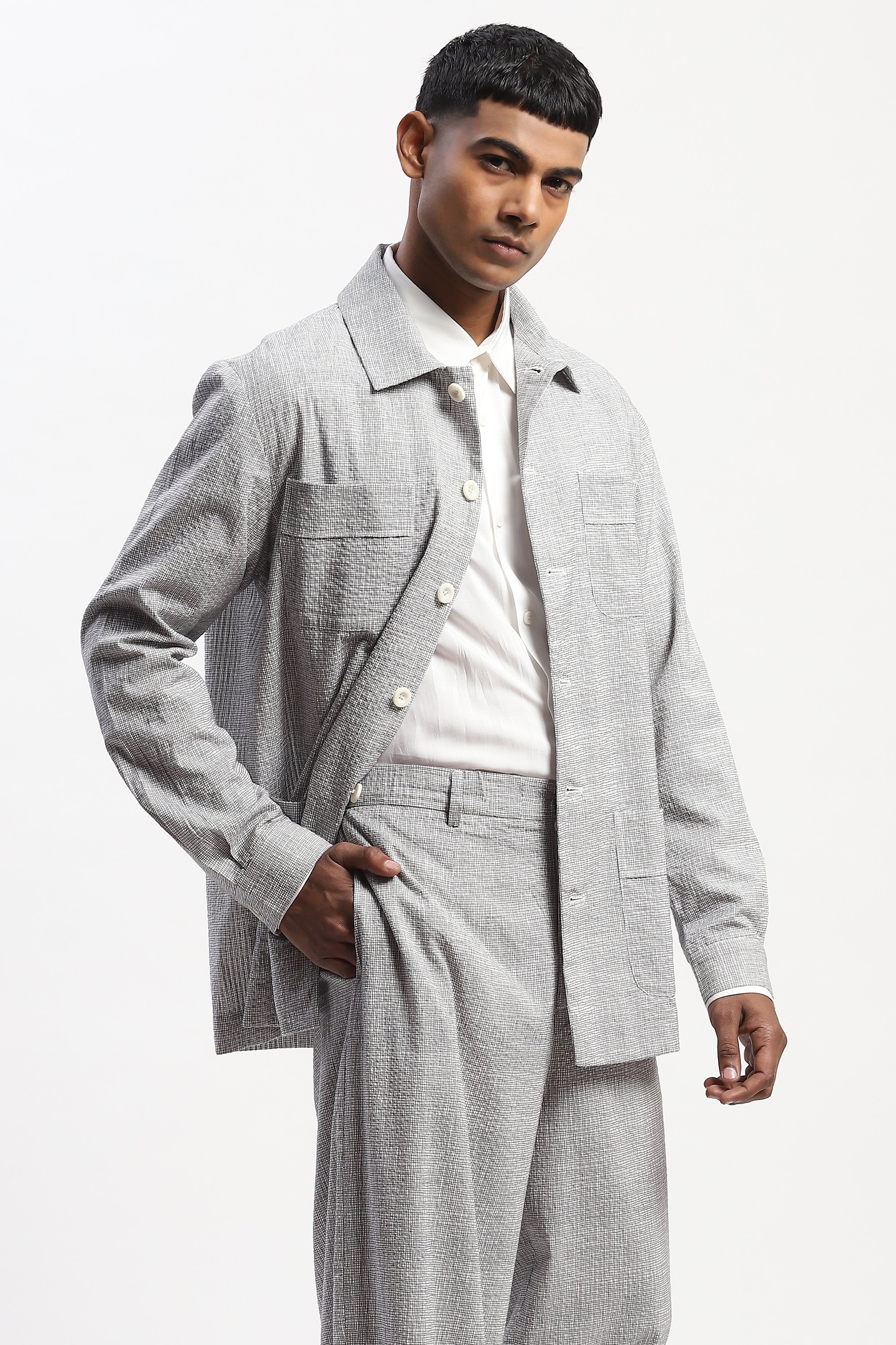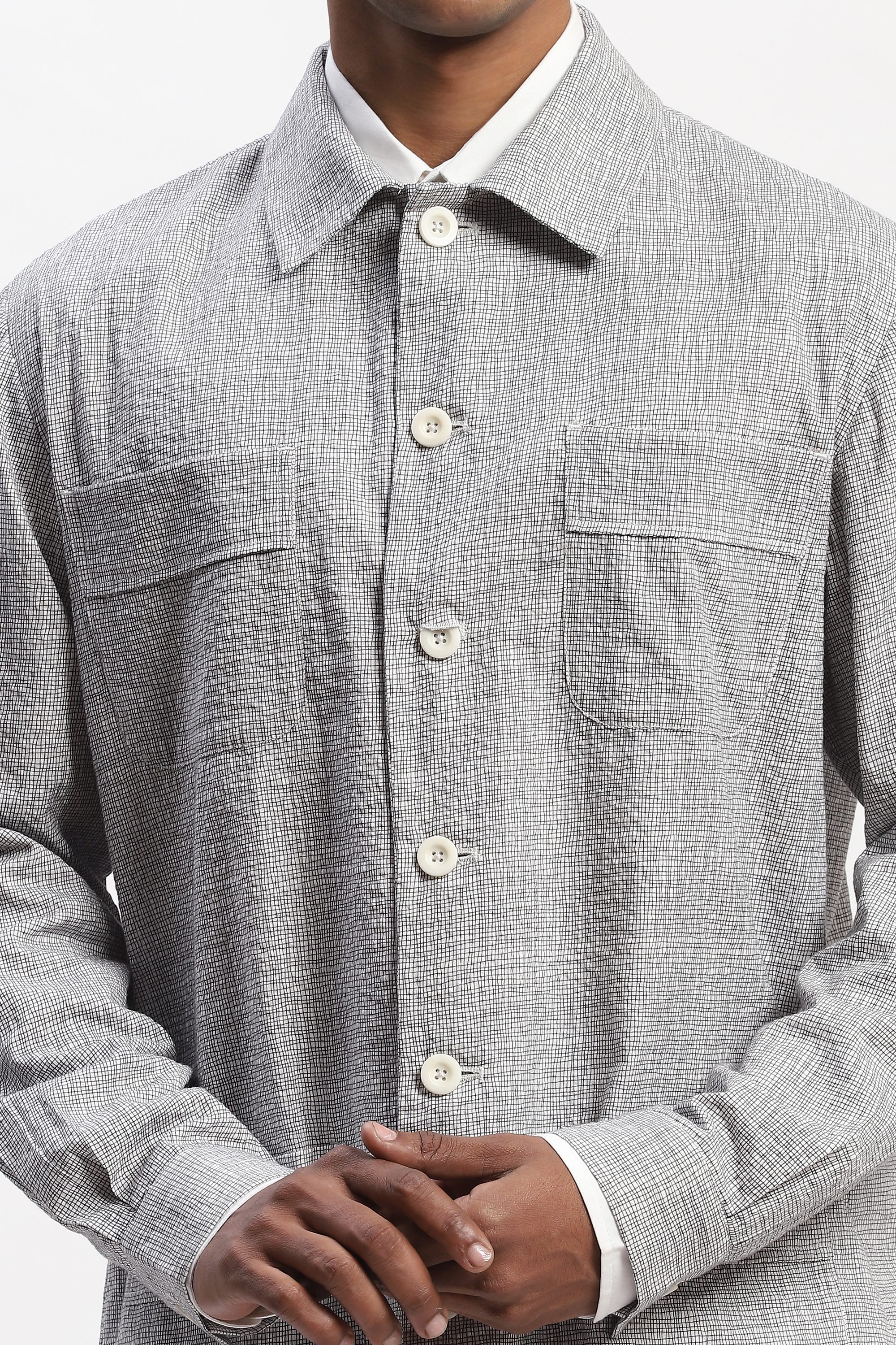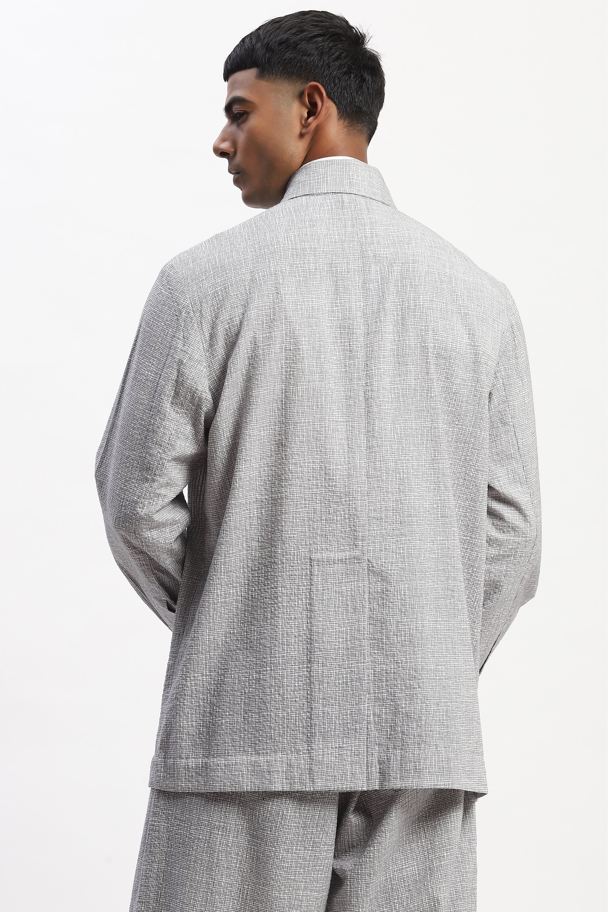 This limited edition piece has been made using fine cotton seersucker fabric that has been printed with a fine hand drawn all over check pattern to give it a textured look. Special note: The garment uses biodegradable Corozo buttons. Corozo is a nut that comes from the fruit of a palm tree that grows in South America. This NUT is harvested sustainably AND are then hand shaped and polished by the artisans into buttons of various designs.