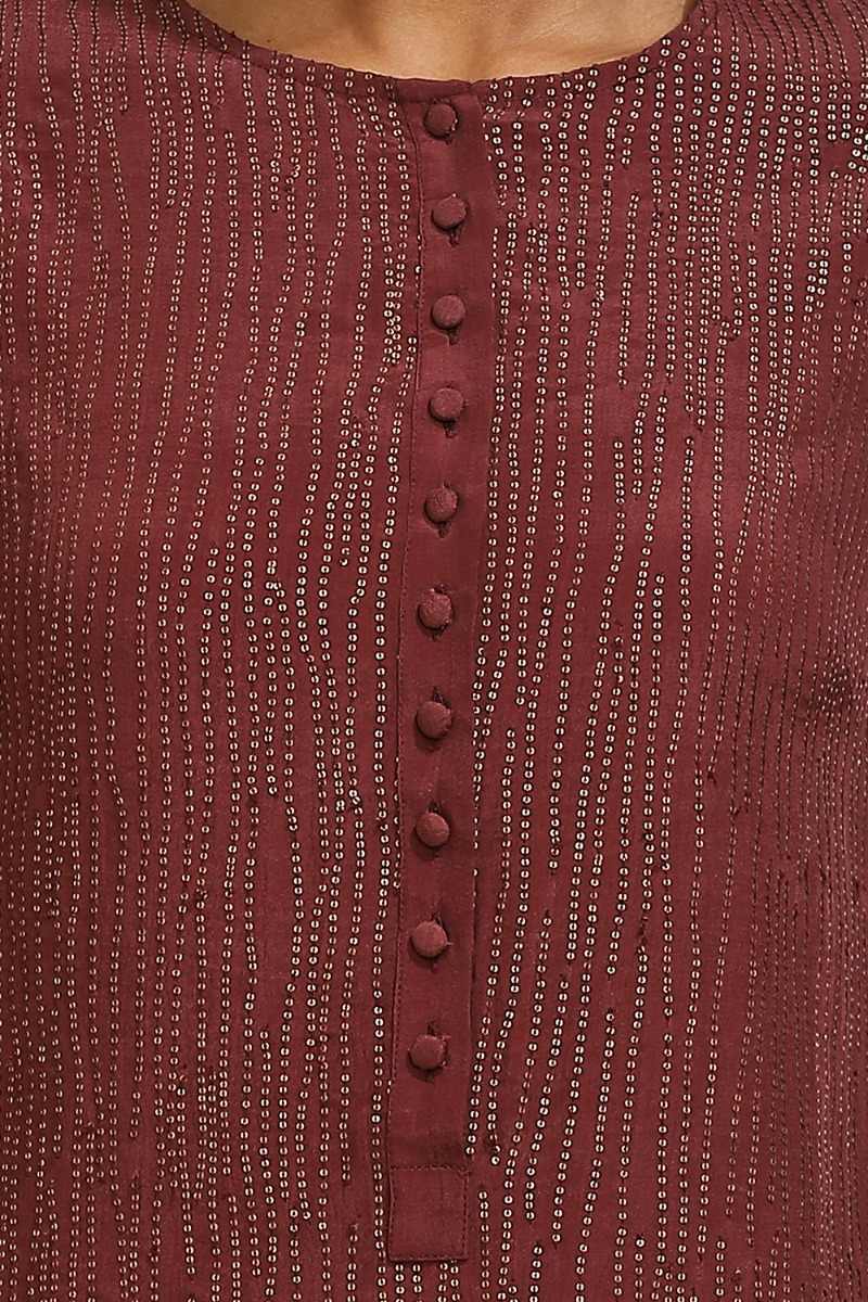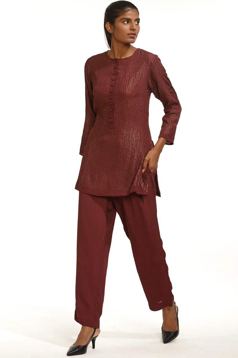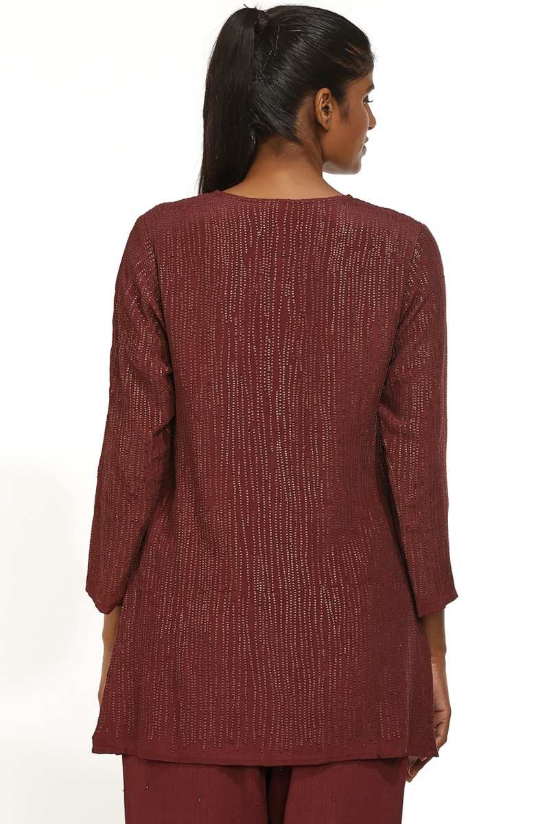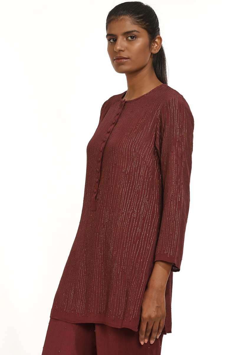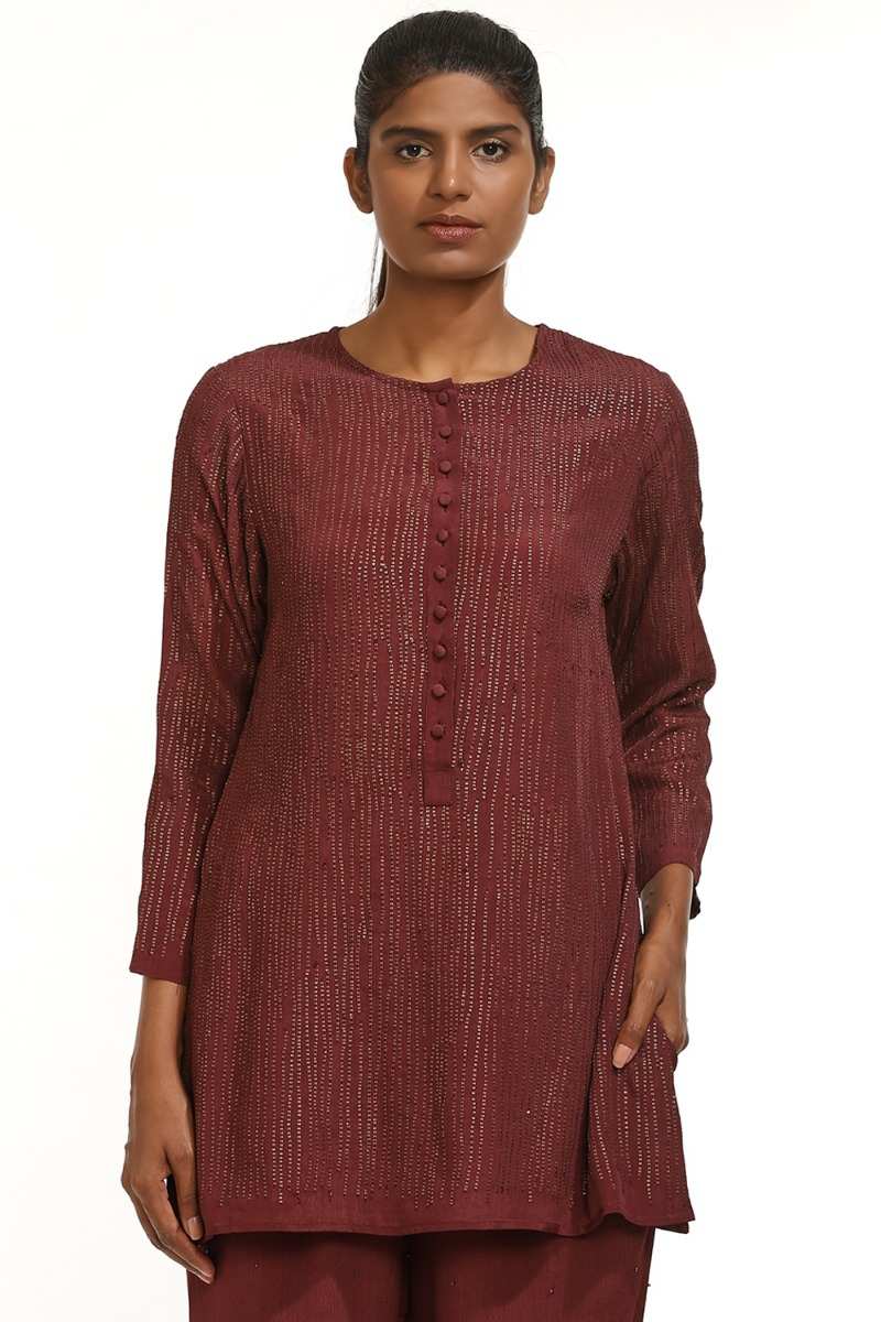 Easy-Fit Short Kurta. Burgundy Crepe Allover Hand Embroidered Gold Sequinned Lines. Garments Are Made From Fabric That Is Washed And Pre-Shrunk To Give A Superior Hand.