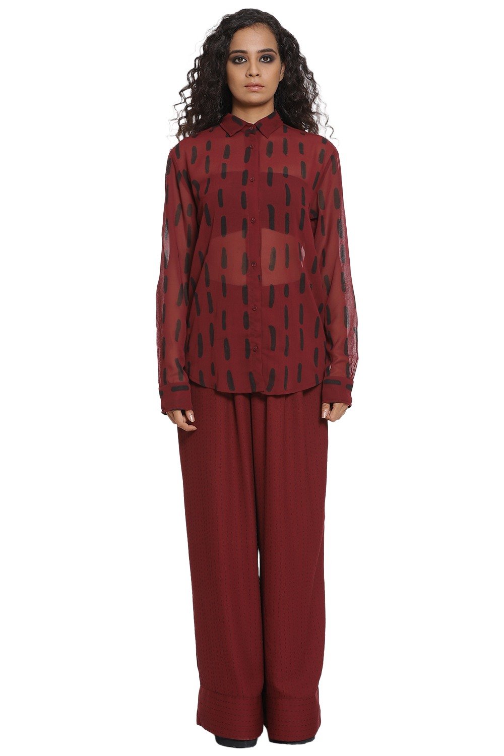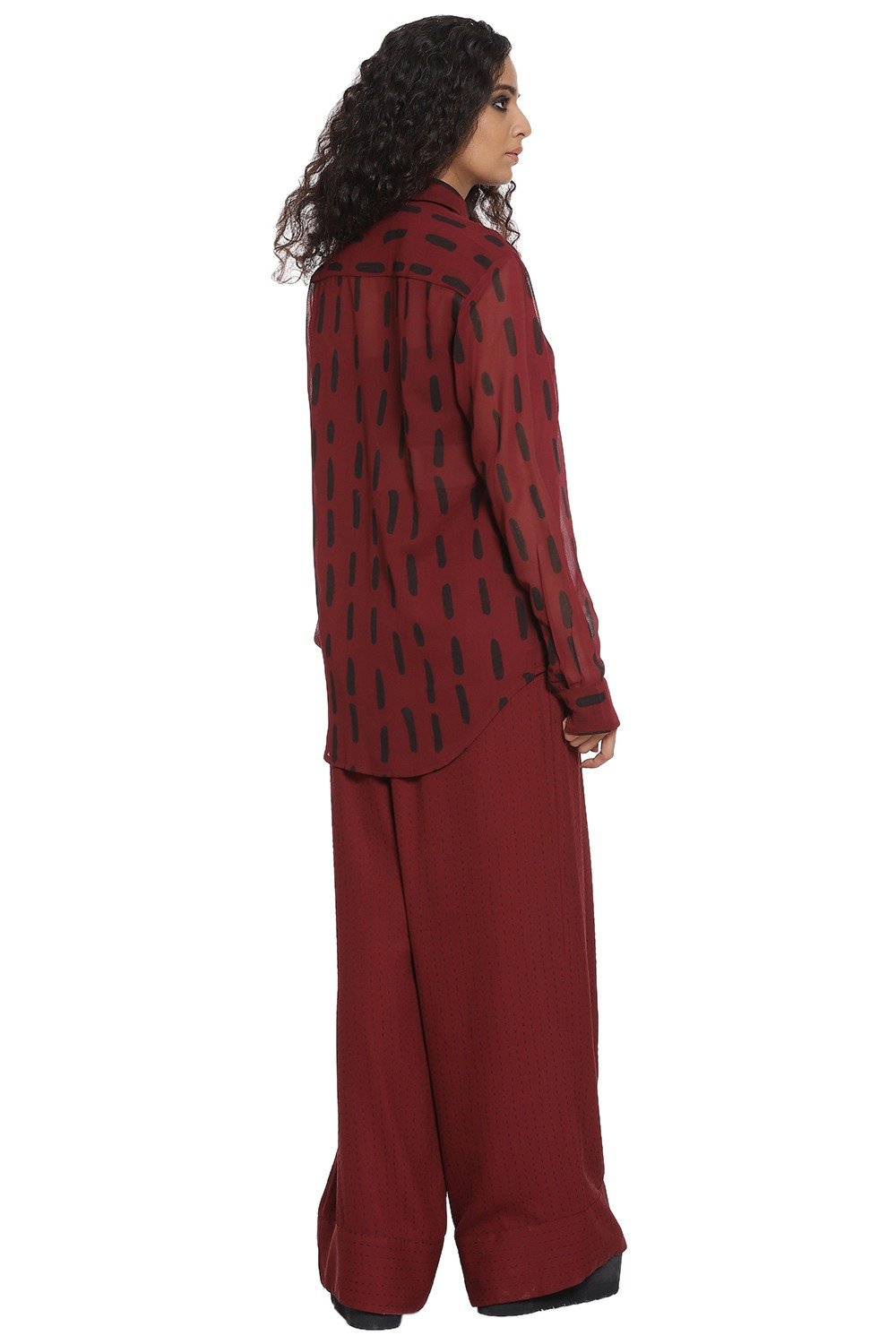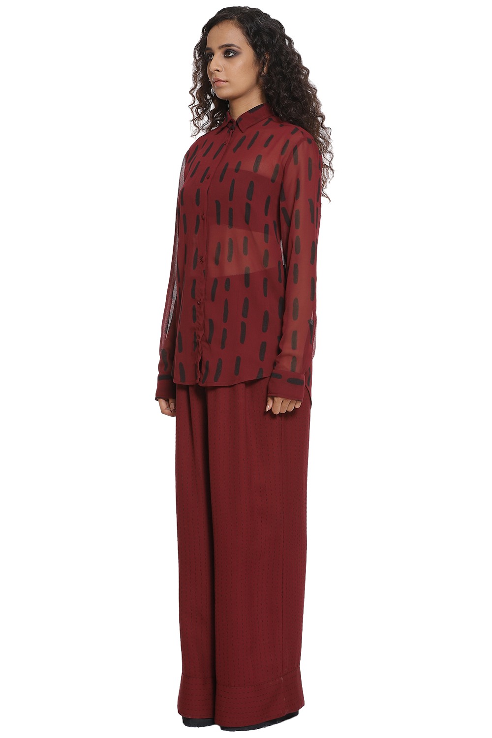 Kantha large print shirt in burgundy and black. Crafted from R-ELAN green gold fabric in a georgette structure.