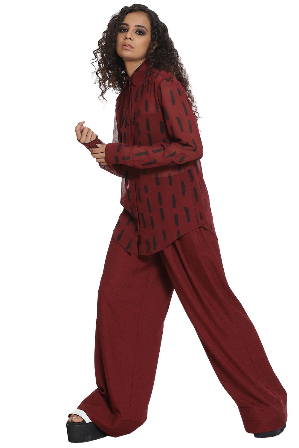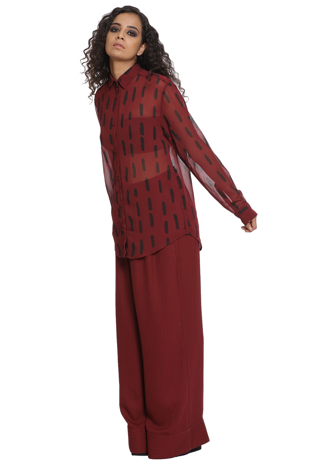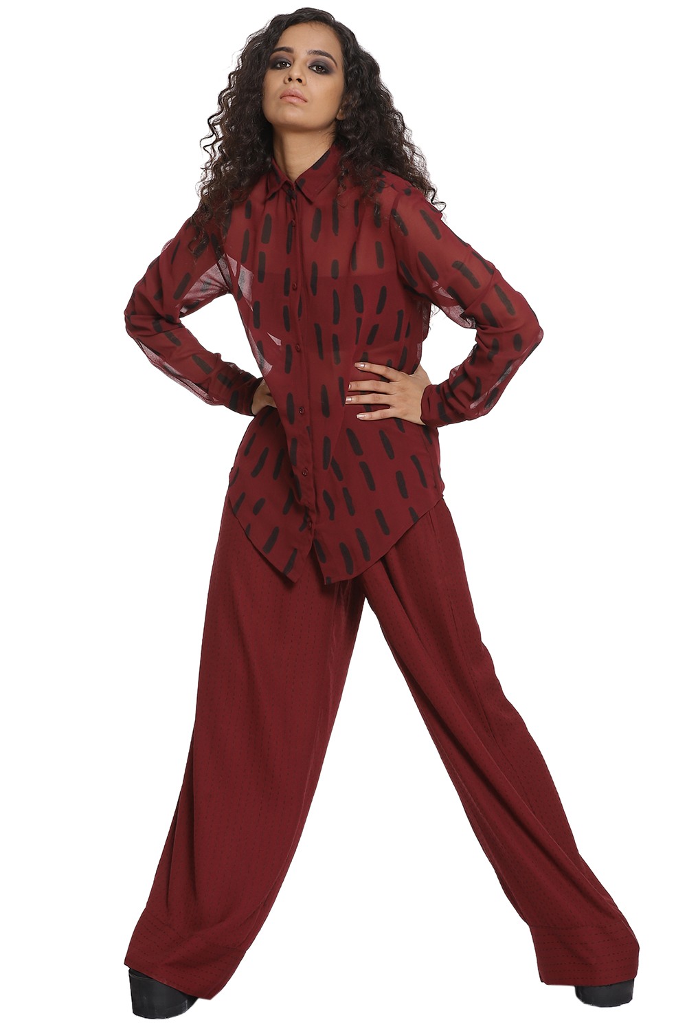 Kantha large print shirt in burgundy and black. Crafted from R-ELAN green gold fabric in a georgette structure.