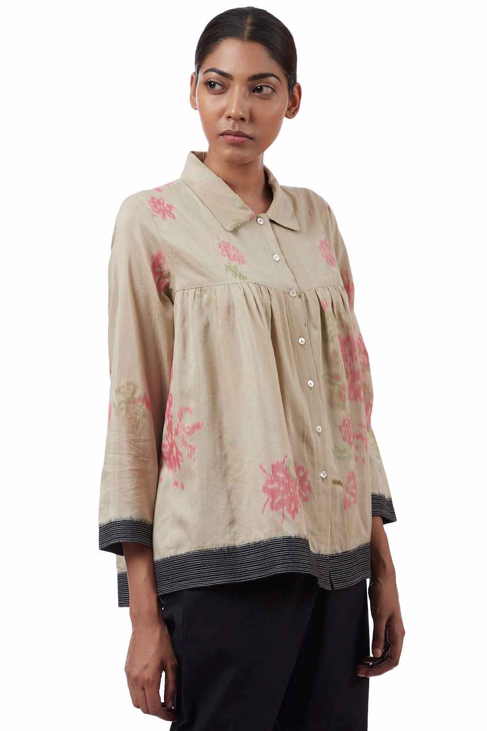 Kedia Top. Handwoven Ikat Intricate Floral Design And Border. Embroidered Trapunto Detail On The Hem And Sleeve Opening With A Raw Edge Special Mother Of Pearl Buttons. Pair It With Straigh Fit Pants Or Dhoti Pants From Our Collection