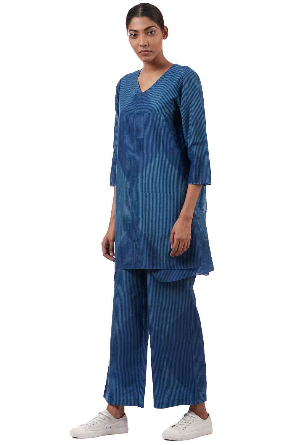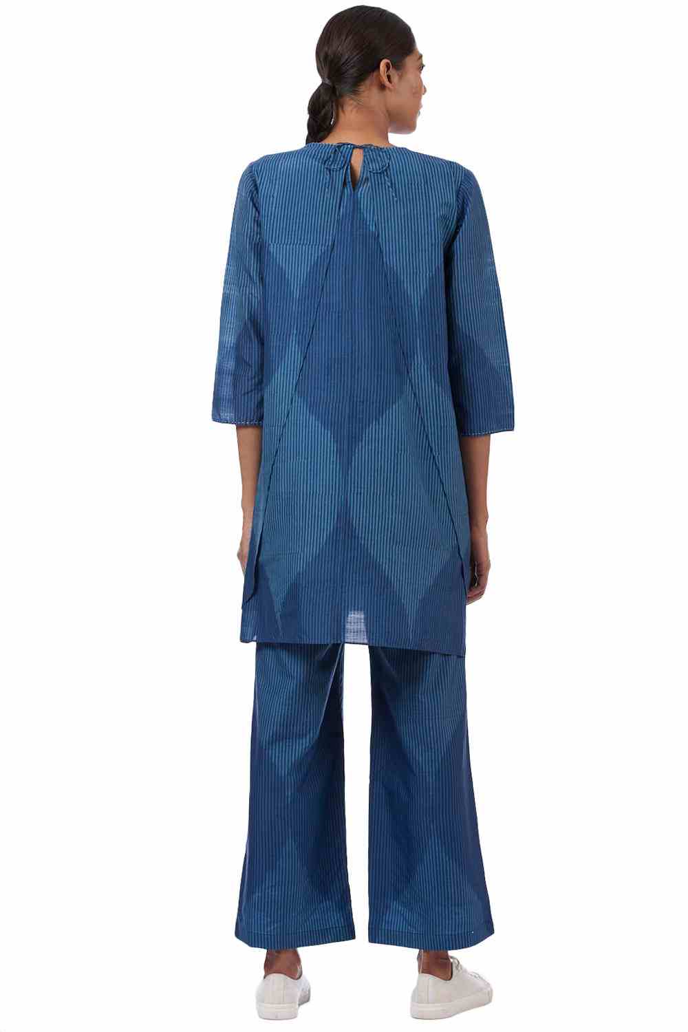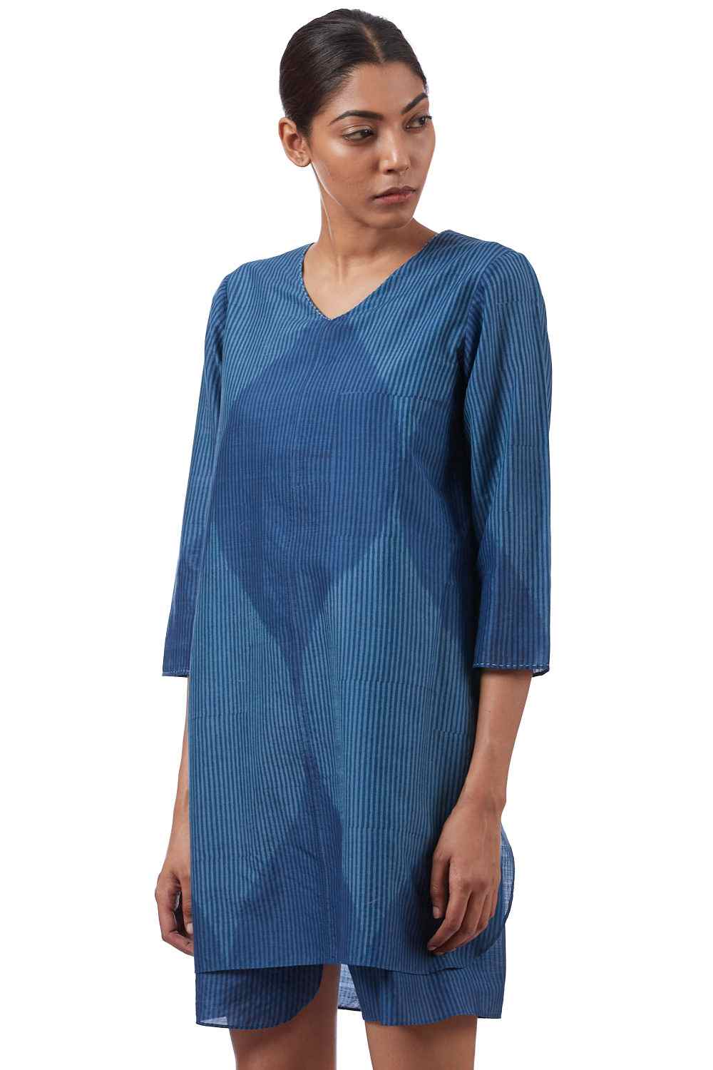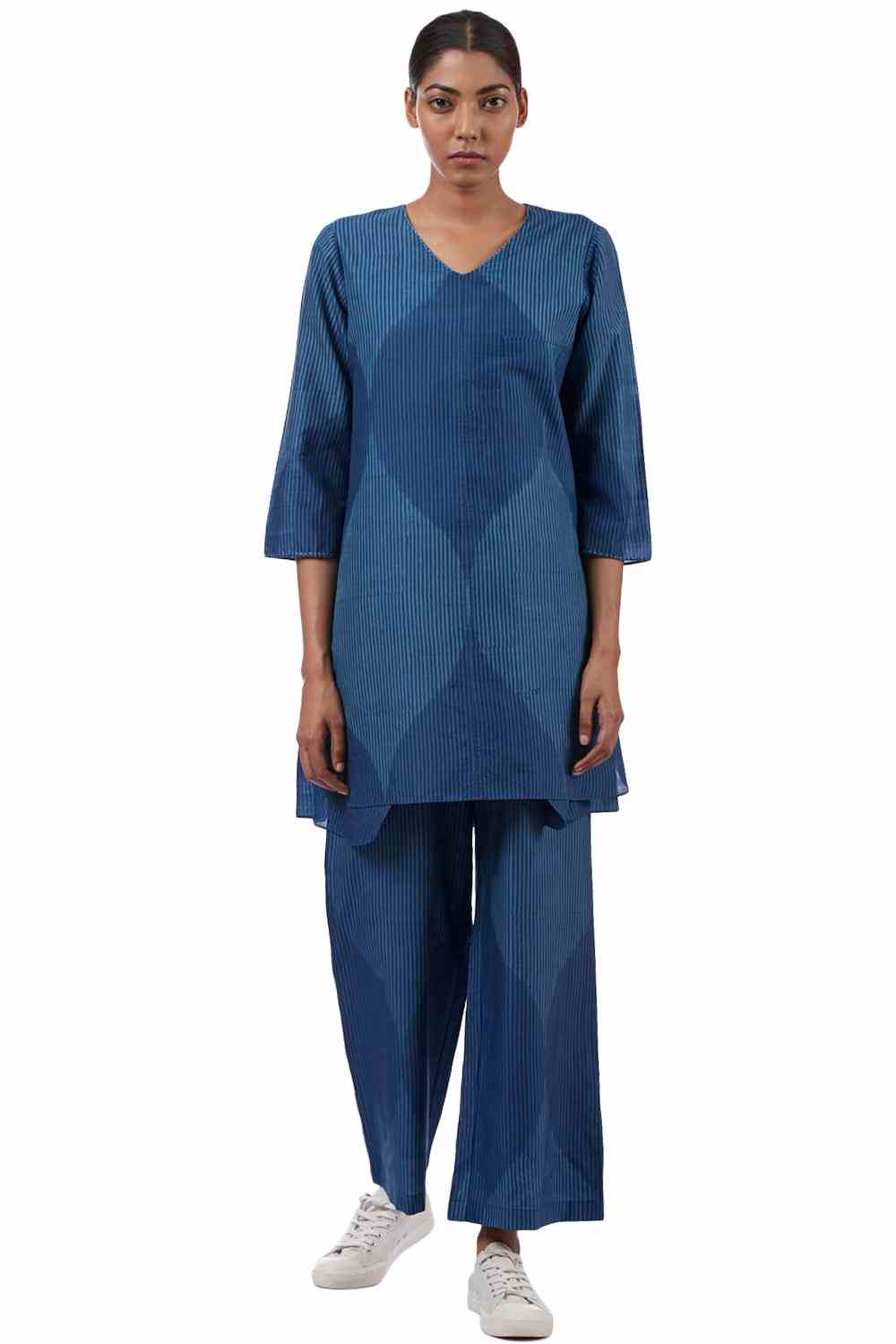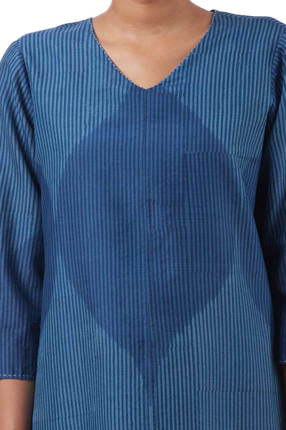 Regular Fit Wrap Tunic. Features All Over Oversized Jali Pattern In Single Ikat And Hand Block Printed Stripes. Hand Running Stitch On Neckline And Sleeve Hem.