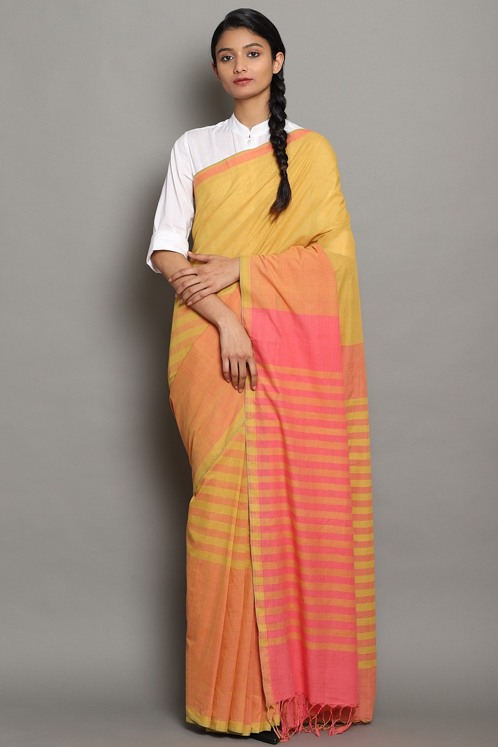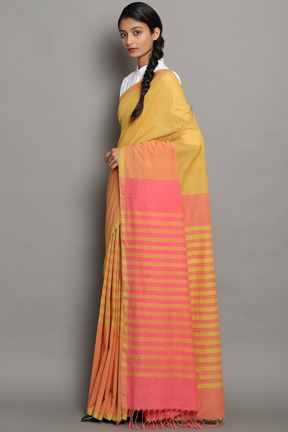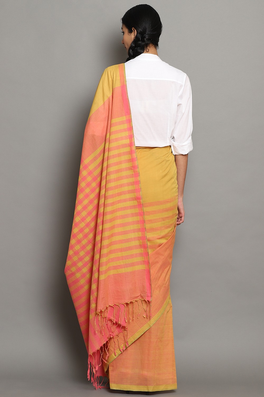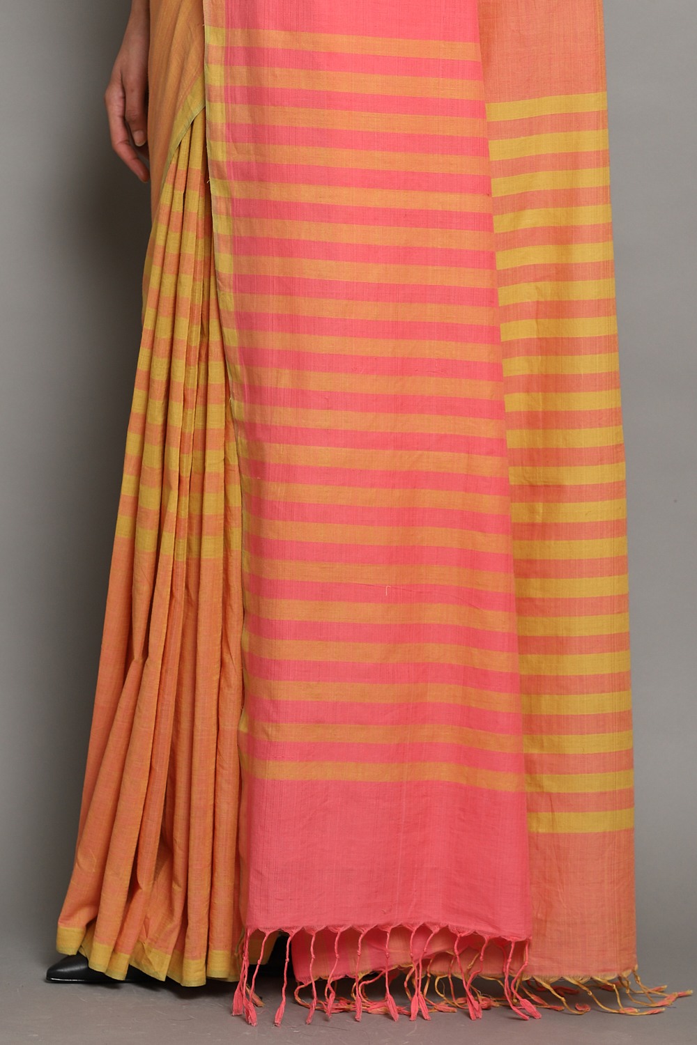 Exclusively Handwoven Cotton Mangalagiri Saree In Chilli & Mango With Woven Coralâ Stripes In The Pallu.