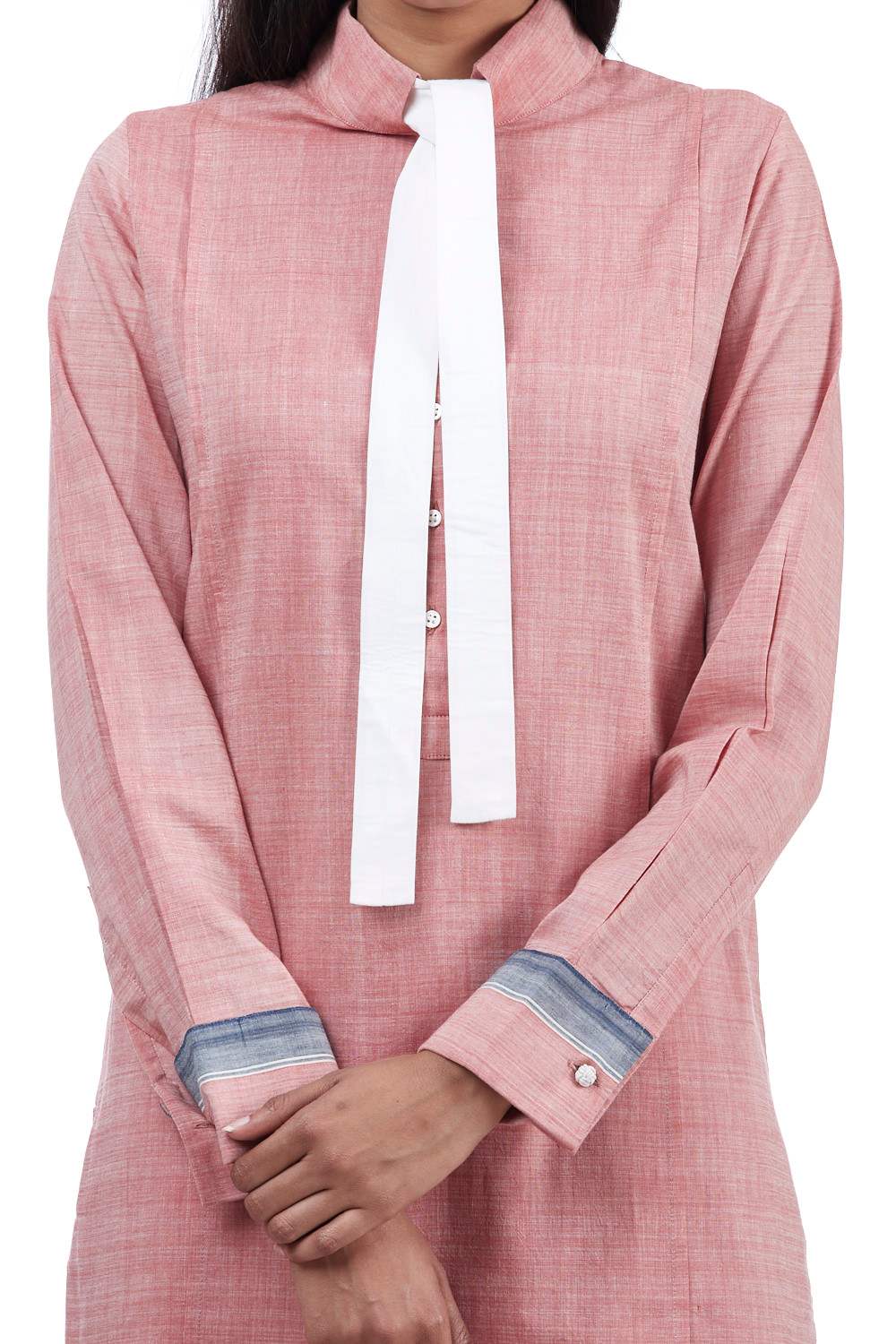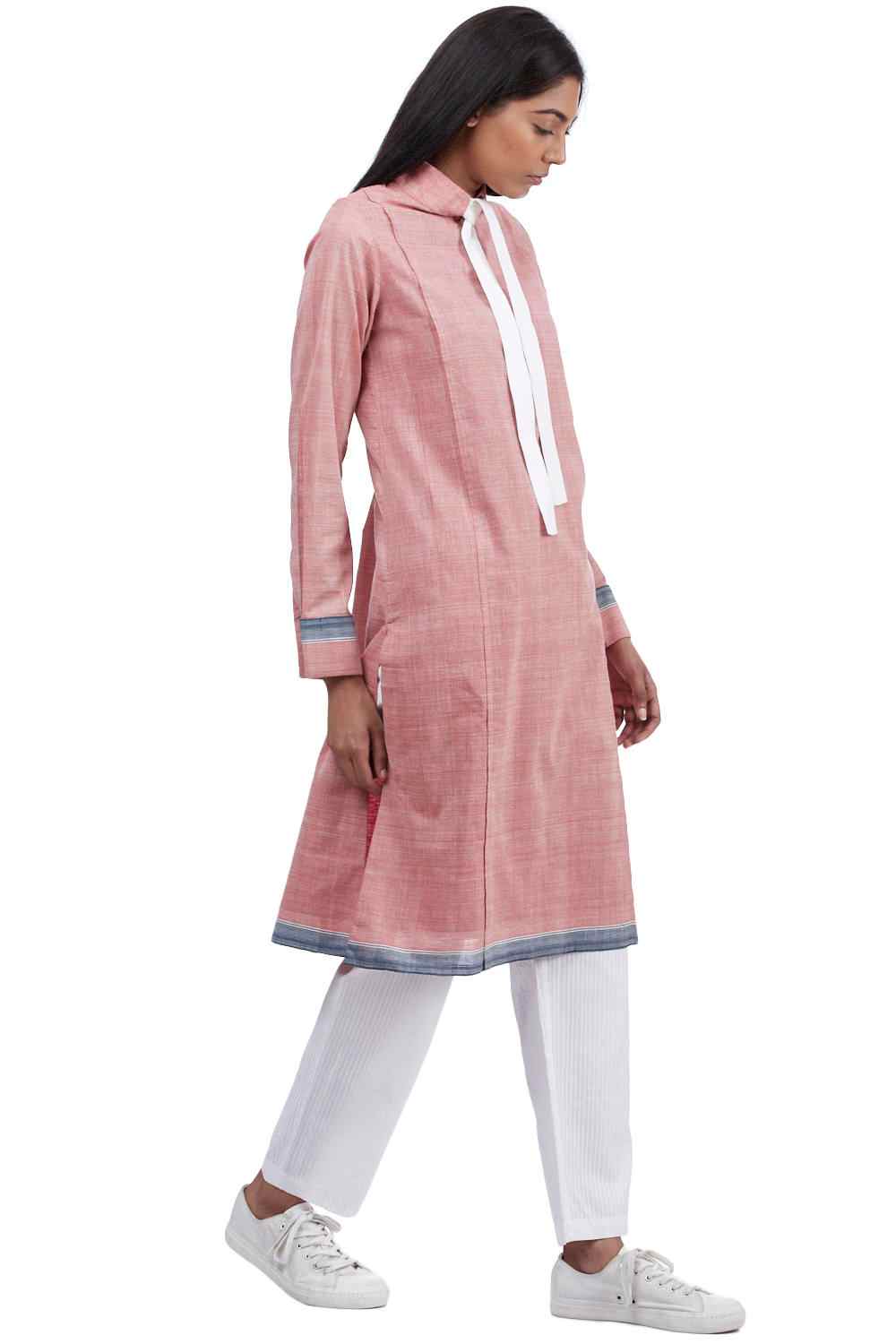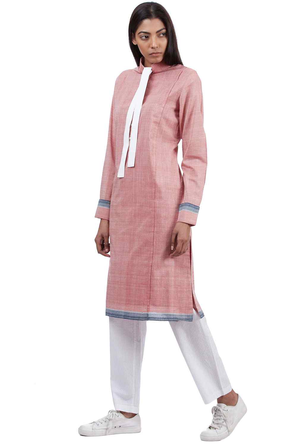 Regular Fit Kurta. Features Neck Tie Detail And French Cuffs With A Woven Border.